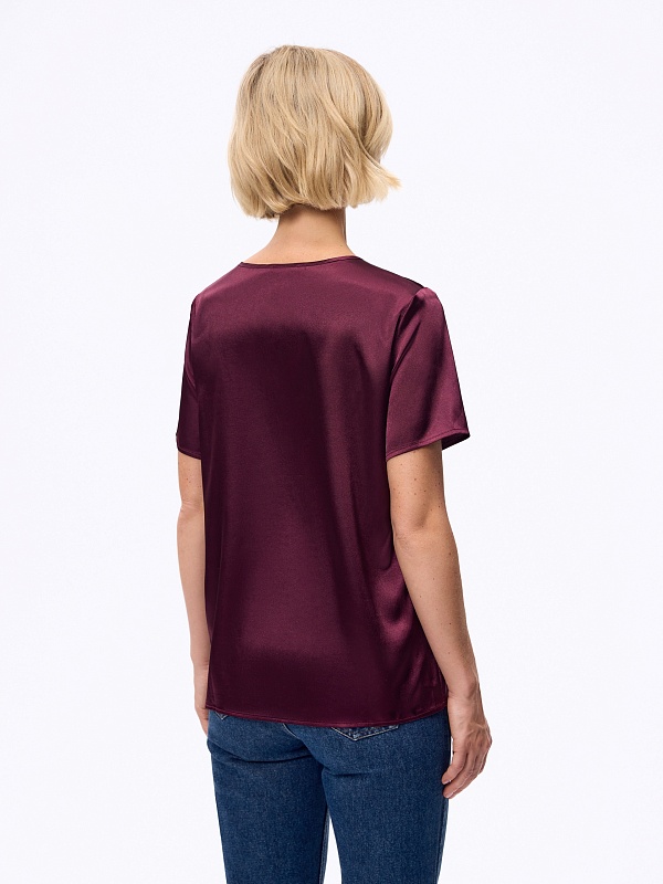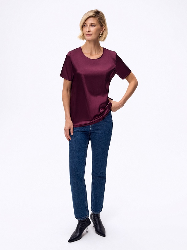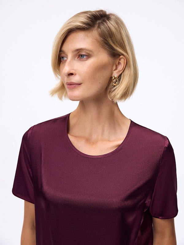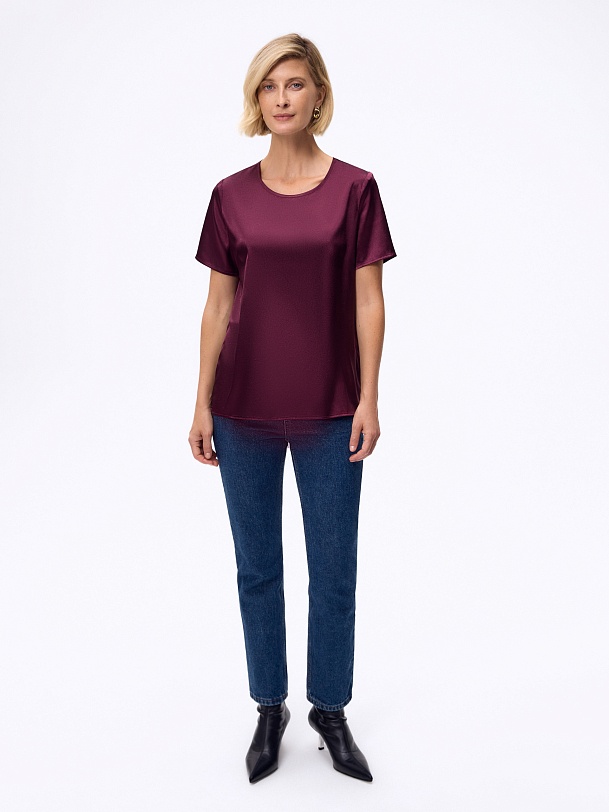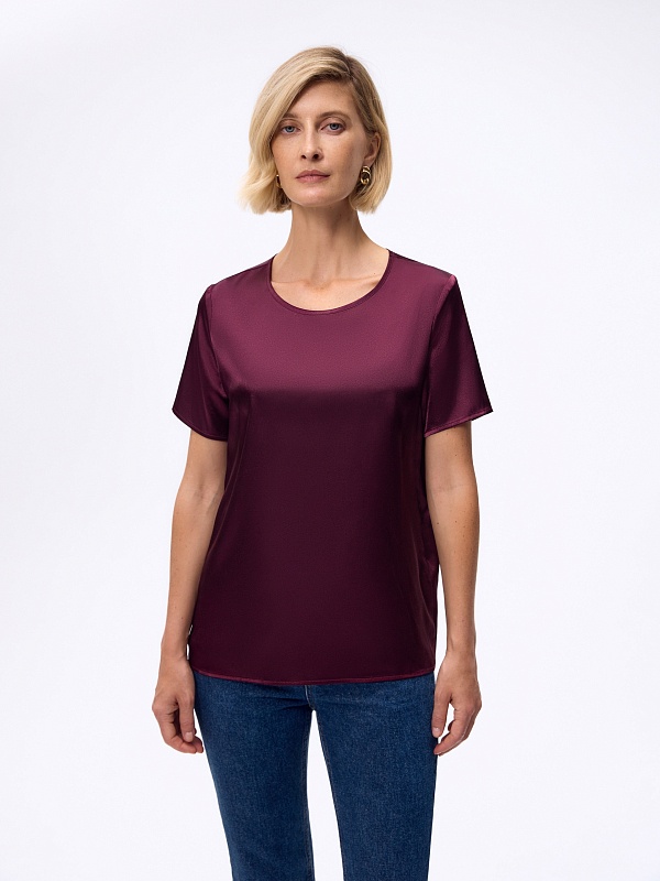 Блуза из атласной ткани прямого силуэта с круглой горловиной и короткими втачными рукавами.