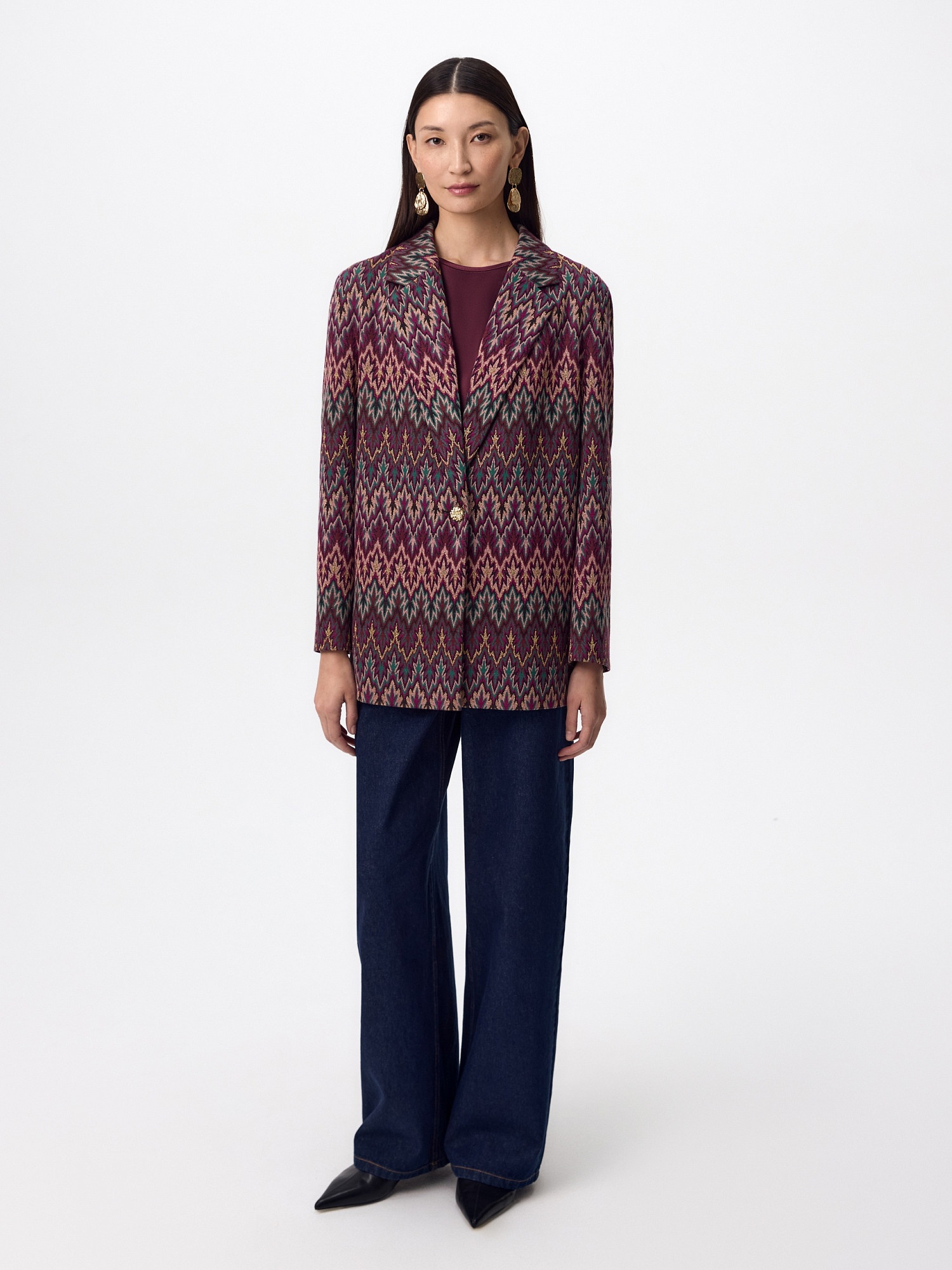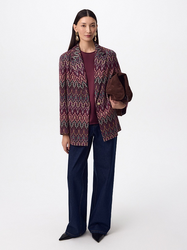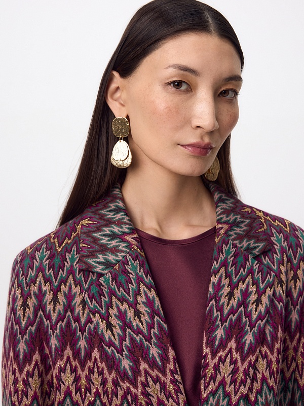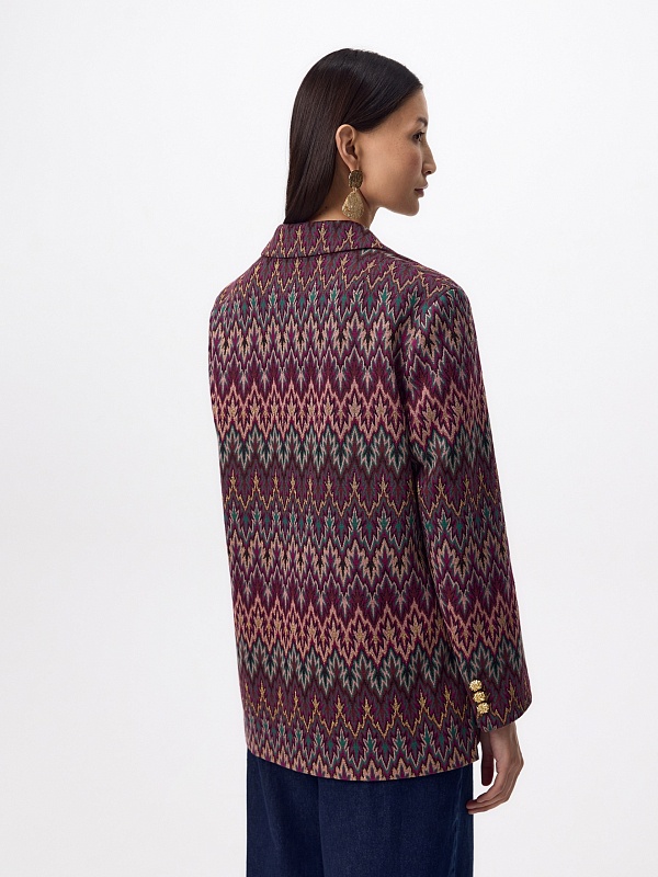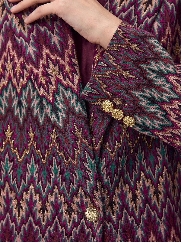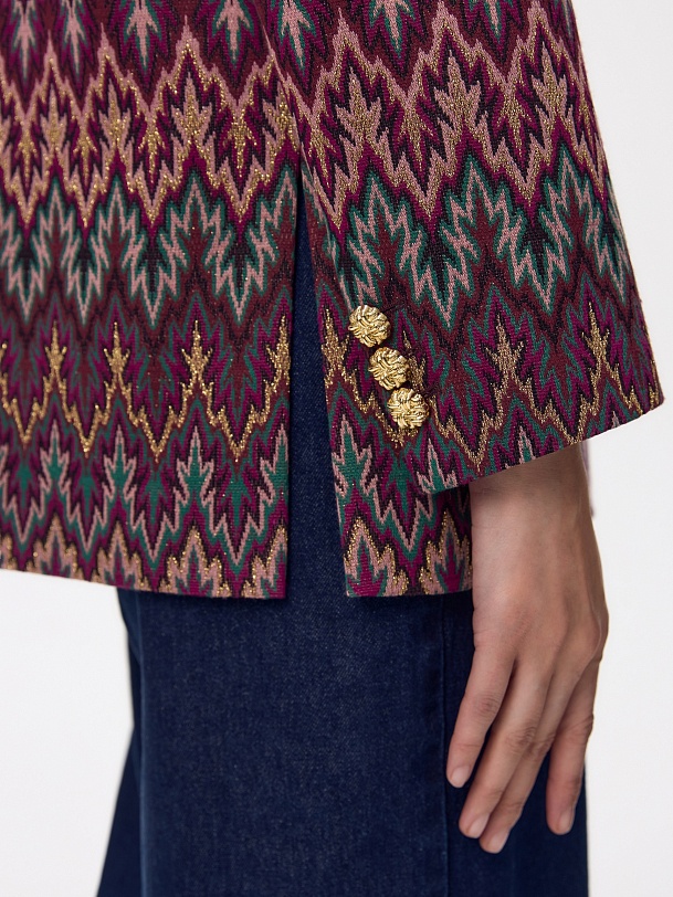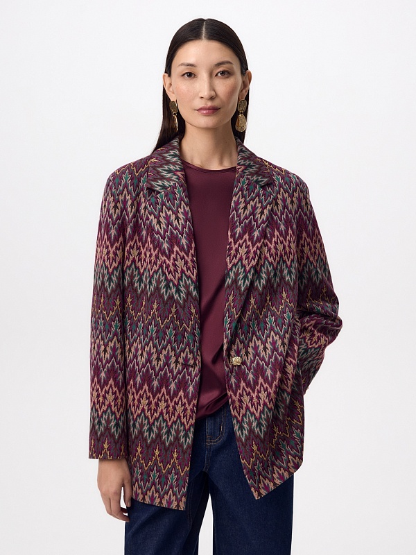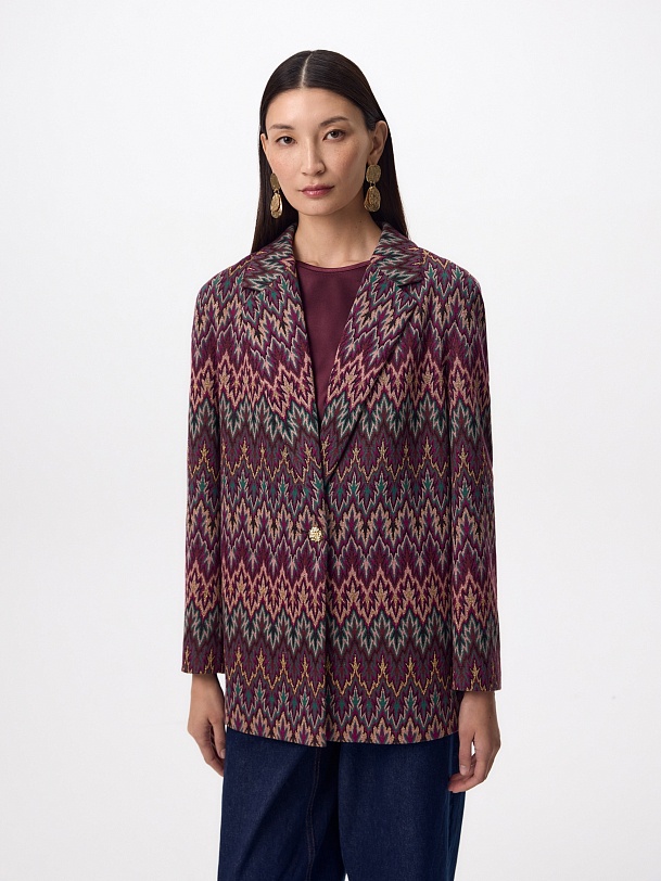 Прямой однобортный жакет с английским воротником и V-образным вырезом выполнен из жаккардового трикотажного полотна с рисунком. Его украшает акцентная металлическая пуговица. В боковых швах расположены разрезы. Жакет на подкладке.