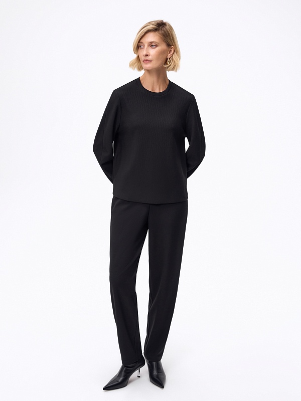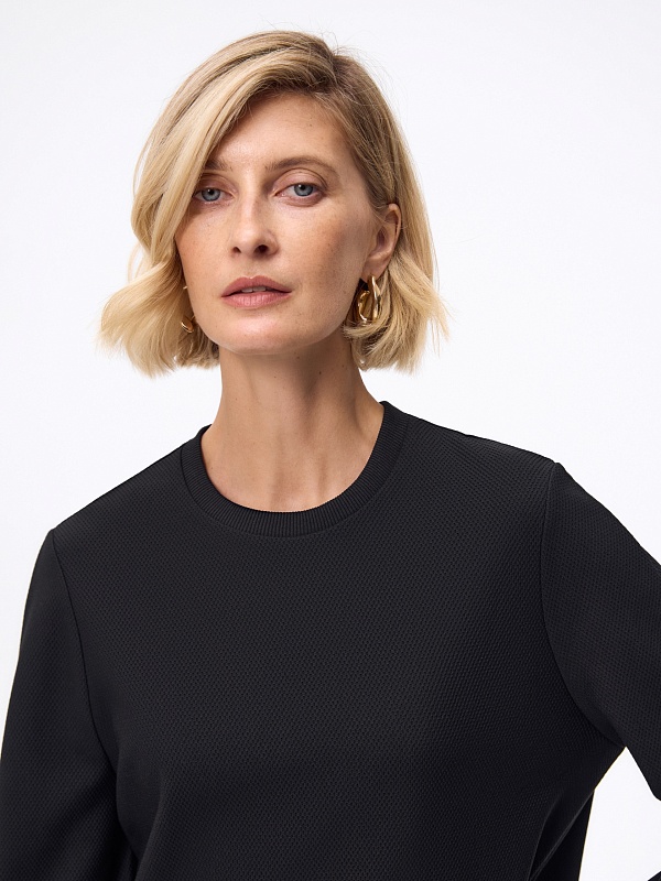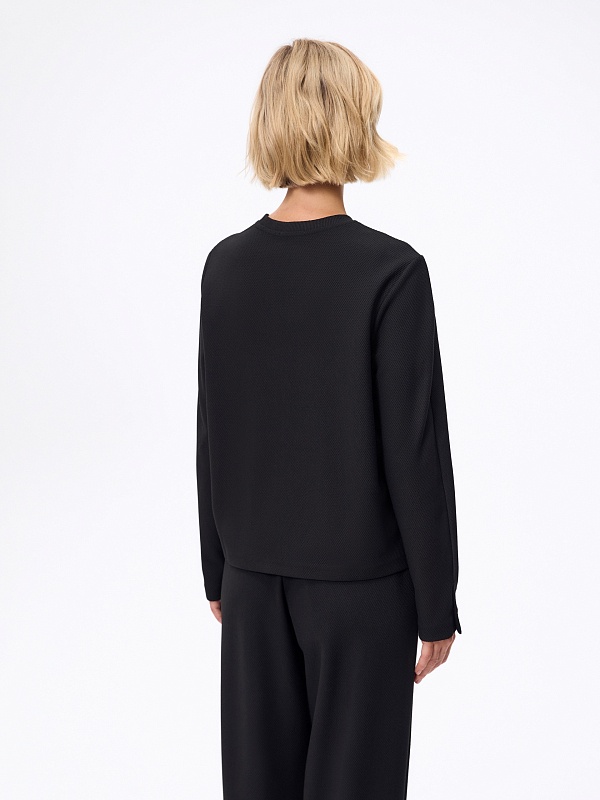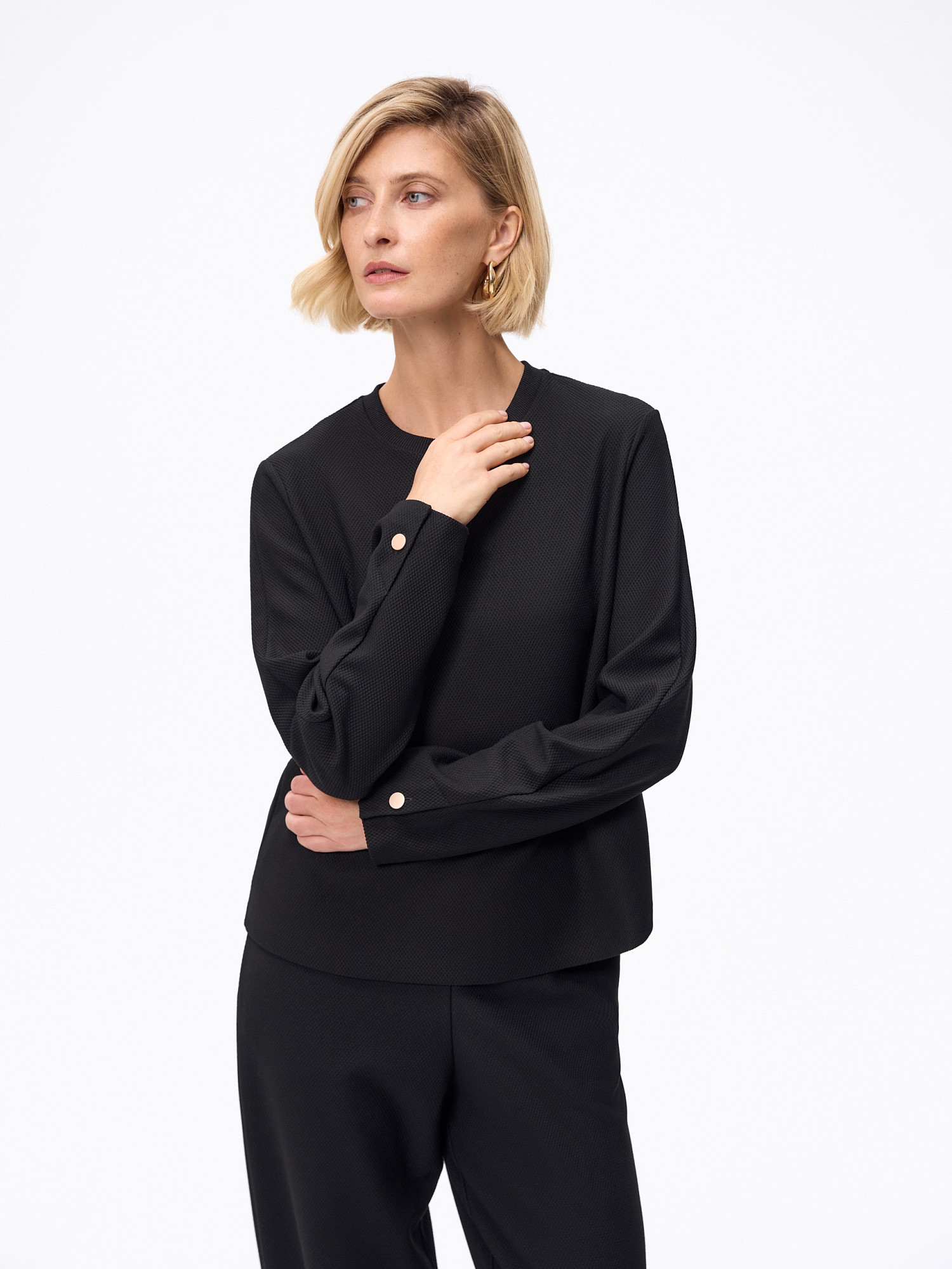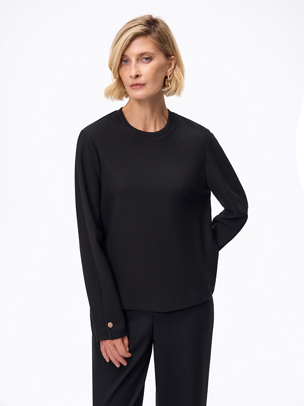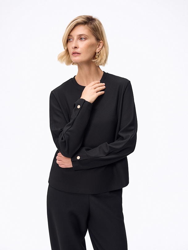 Джемпер из фактурного трикотажа — воплощение комфорта и стиля. Классическая форма втачного рукава со спущенной линией проймы полной длины с золотыми пуговицами и шлицей по низу придают дизайну современный, непринужденный вид.