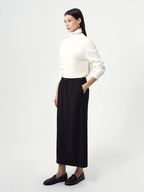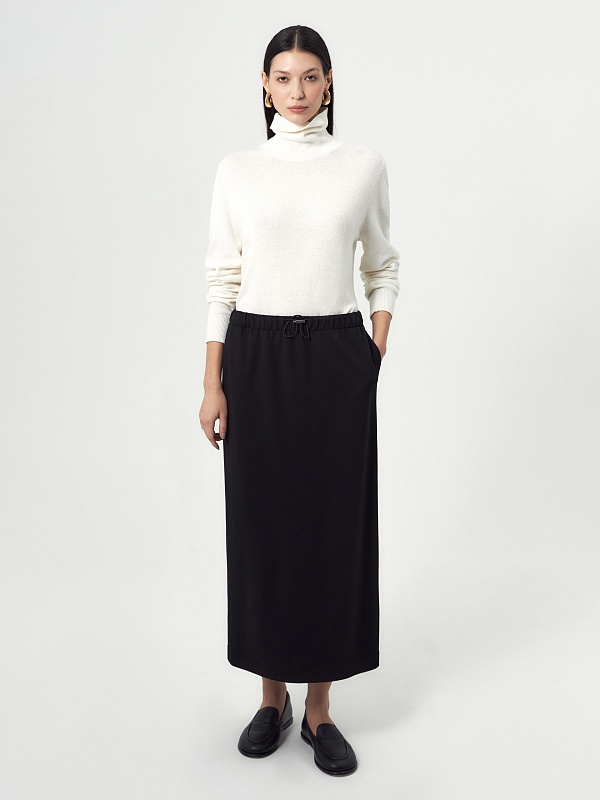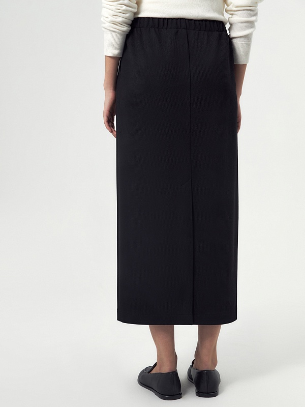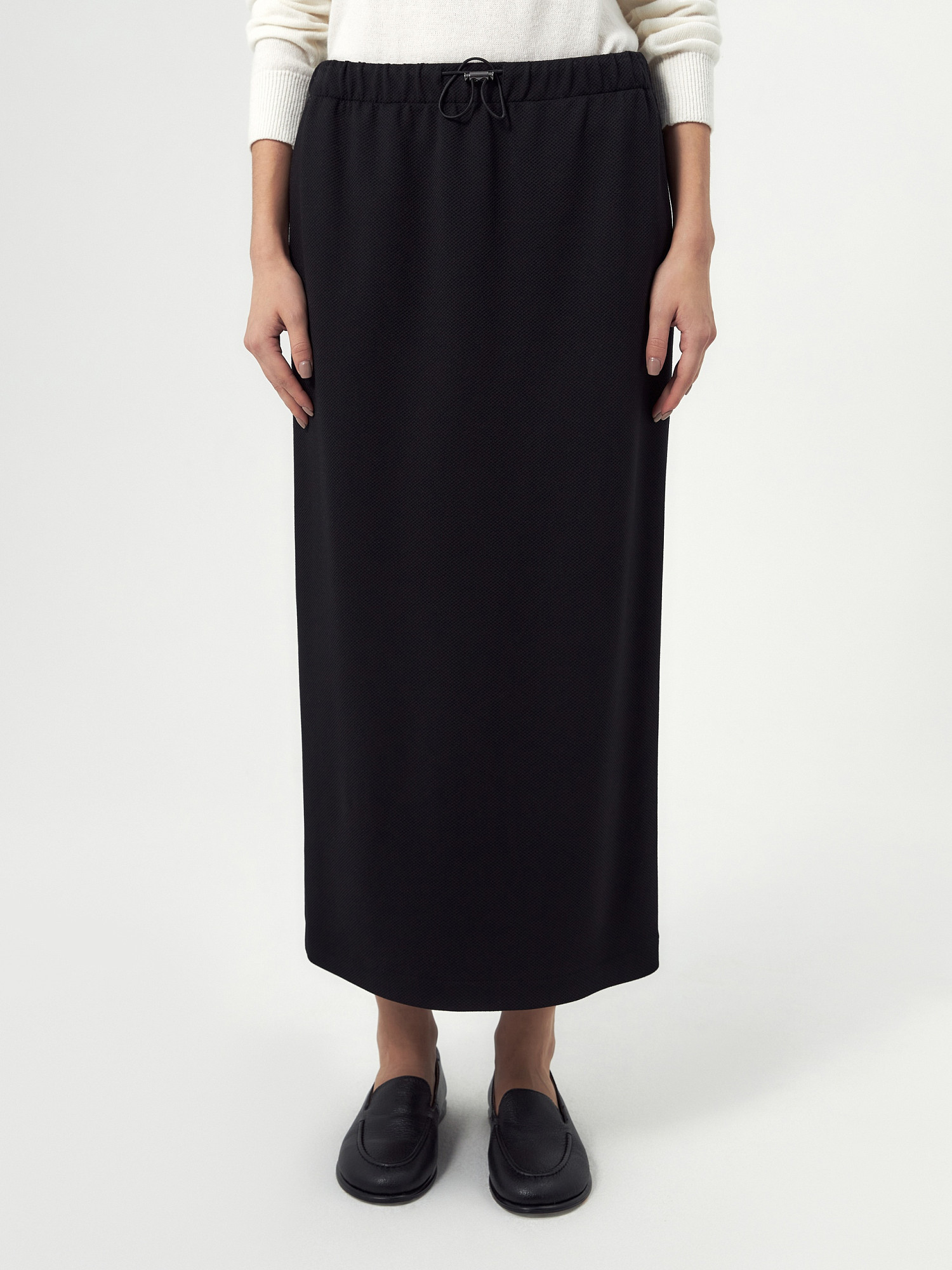 Прямая юбка из фактурного трикотажа на резинке, с кулисой для регулировки посадки.