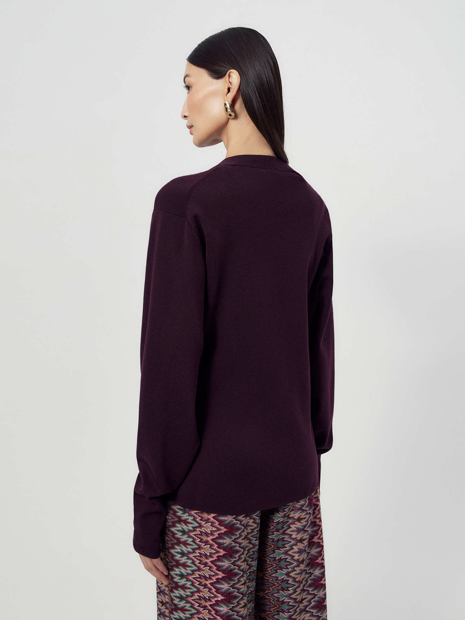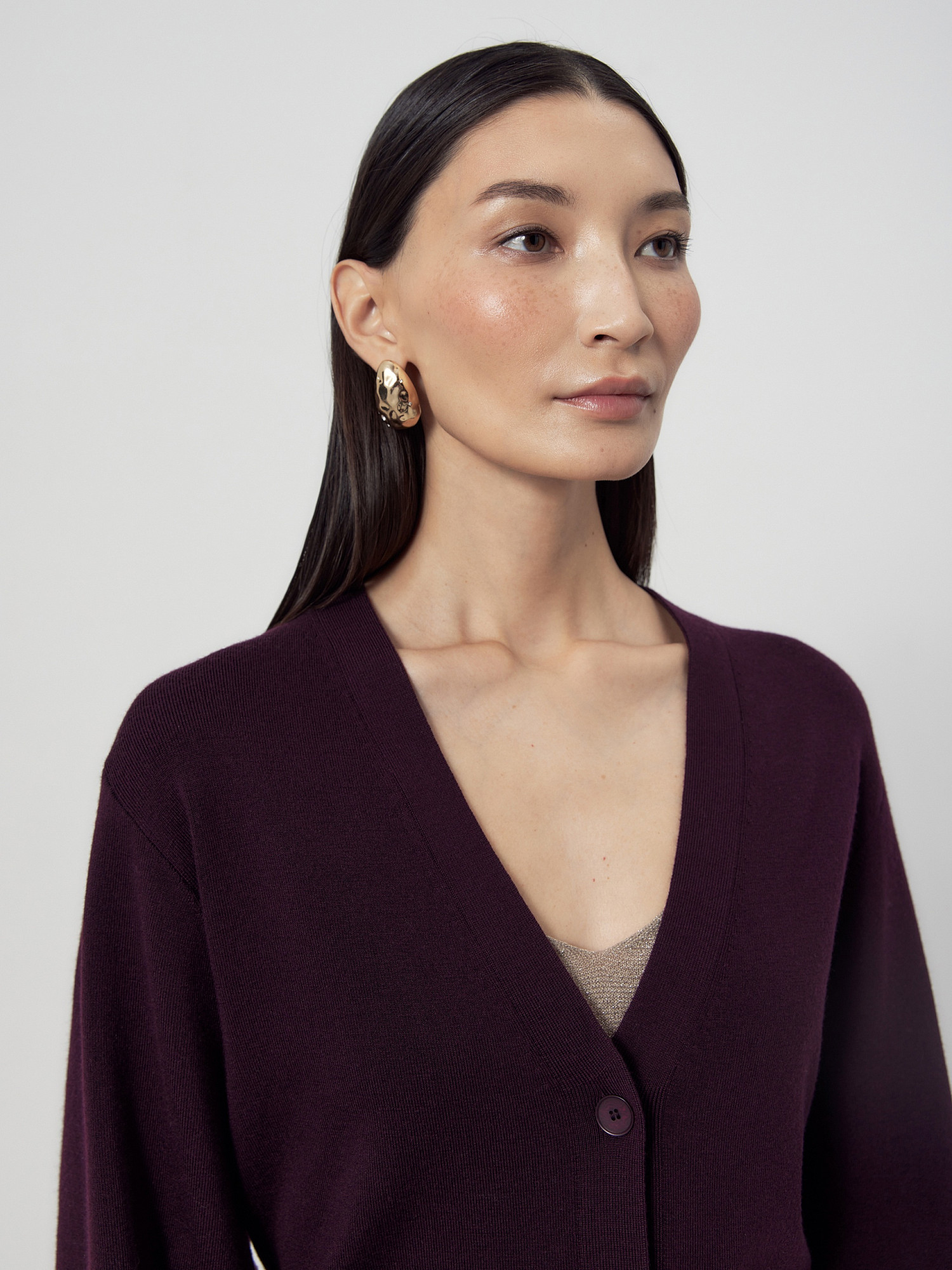 Нежный кардиган в сочном цвете итальянской сливы с вытачками по талии для красивого силуэта и свободным втачным рукавом полной длины. Застежка спереди на пуговицы.