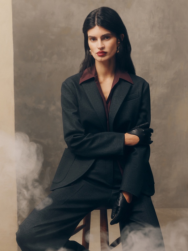 Функциональные накладные карманы добавляют практичности, а нагрудный карман с листочкой отсылает к эстетике классических мужских жакетов, поддерживая тренд на маскулинный стиль.