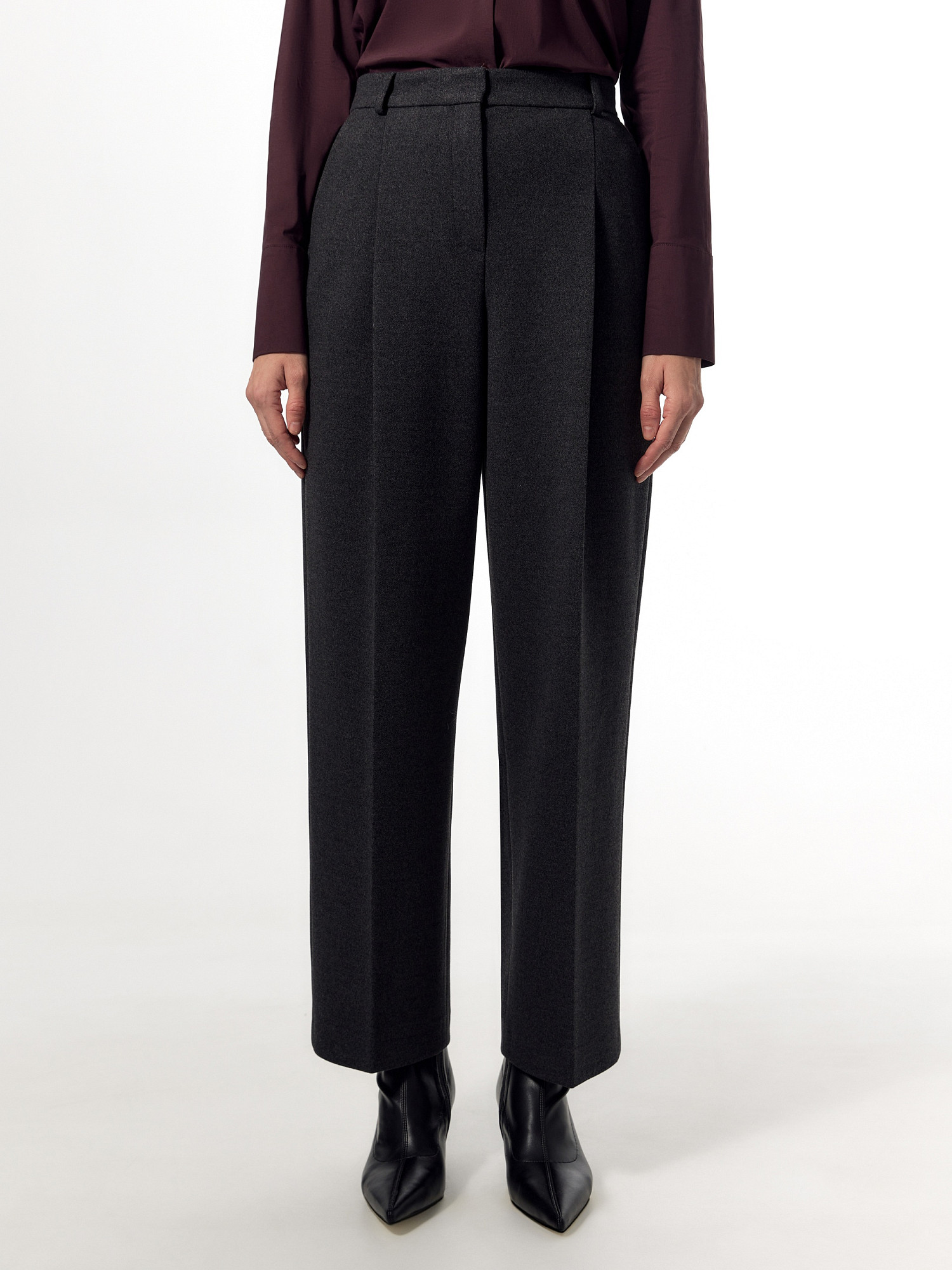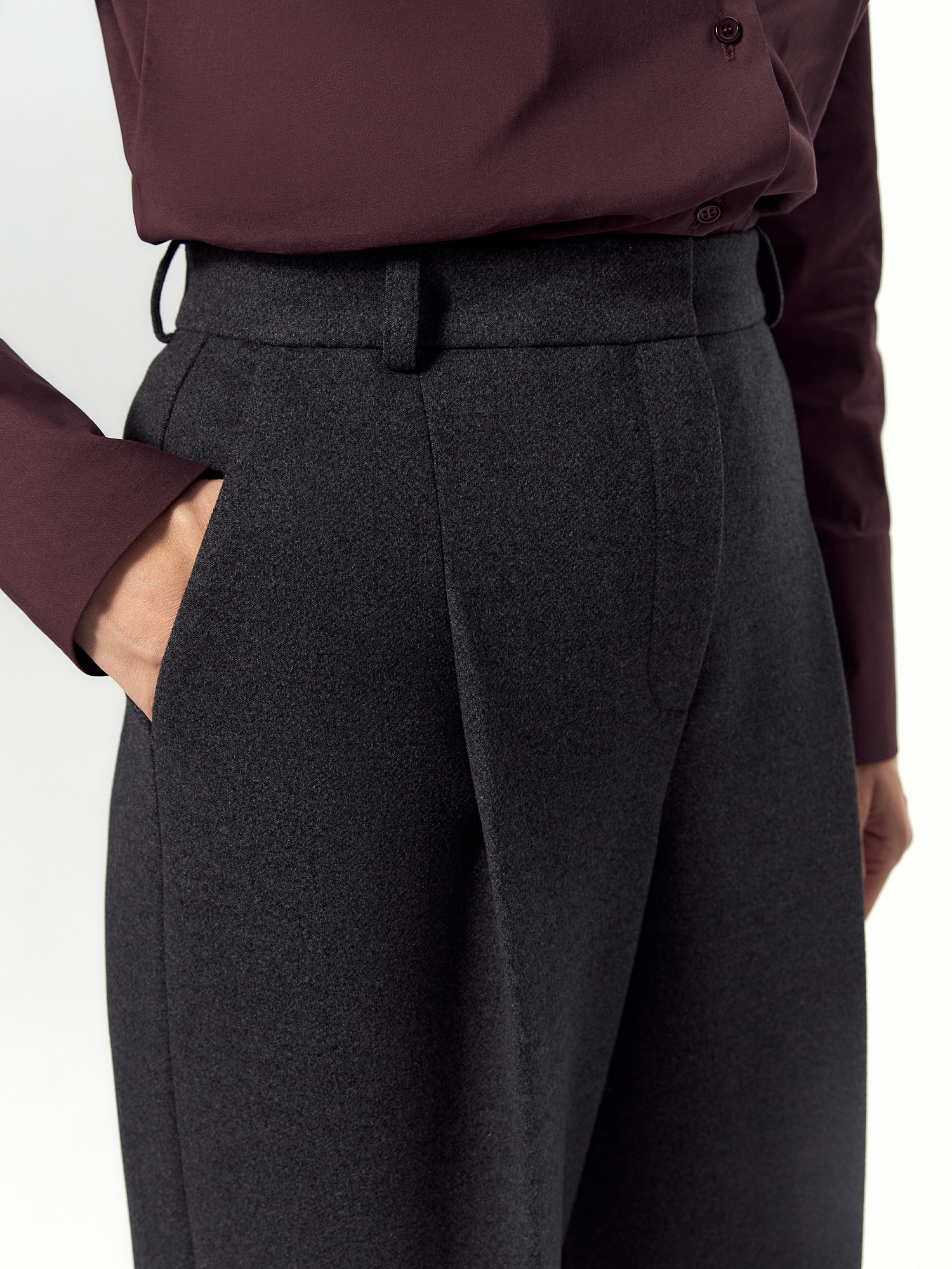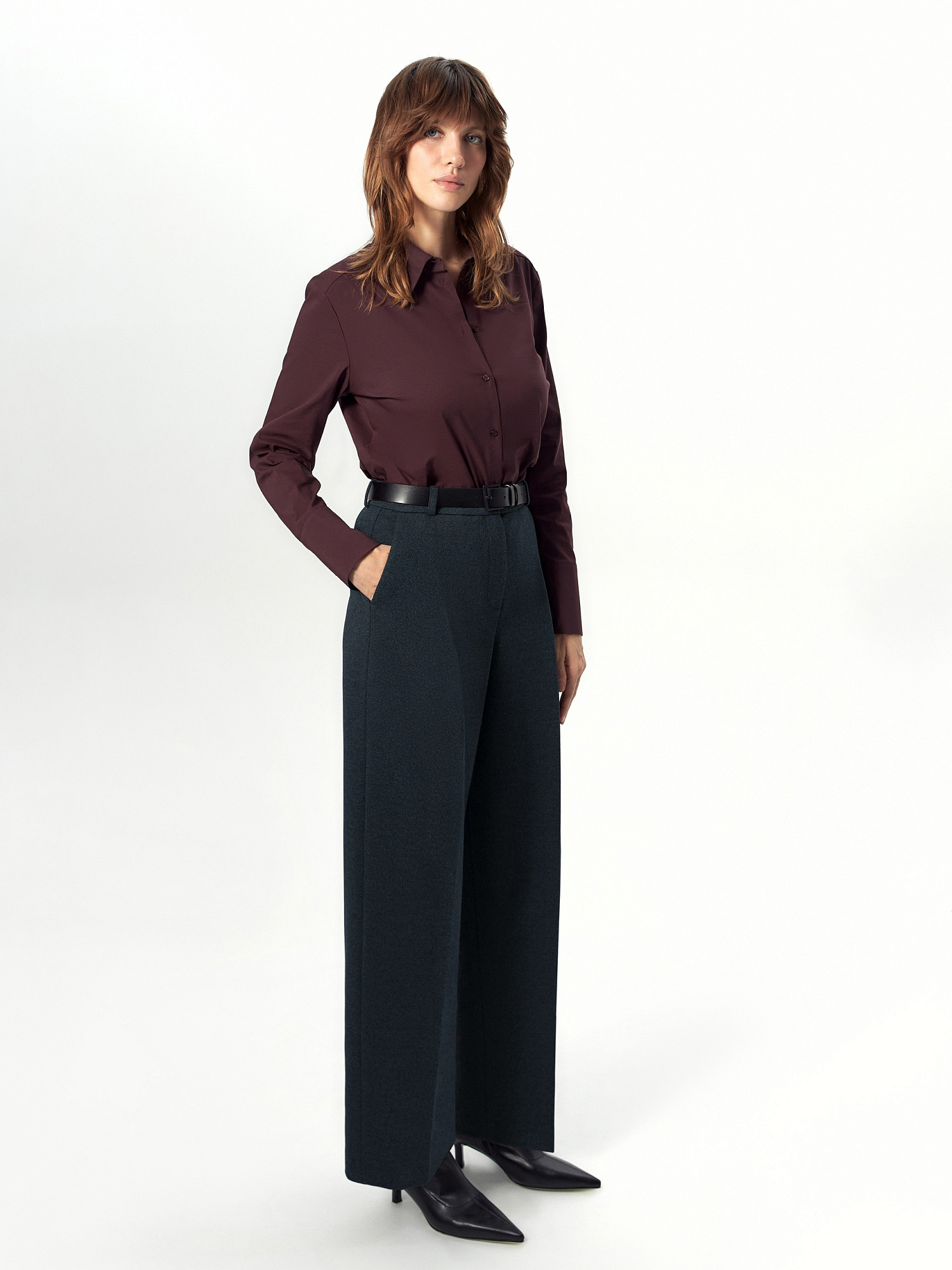 Широкие брюки из двух-сторонней плотной костюмной ткани сине-серого цвета на прямом поясе со шлевками. Имеют два функциональных кармана по бокам и два прорезных кармана сзади.