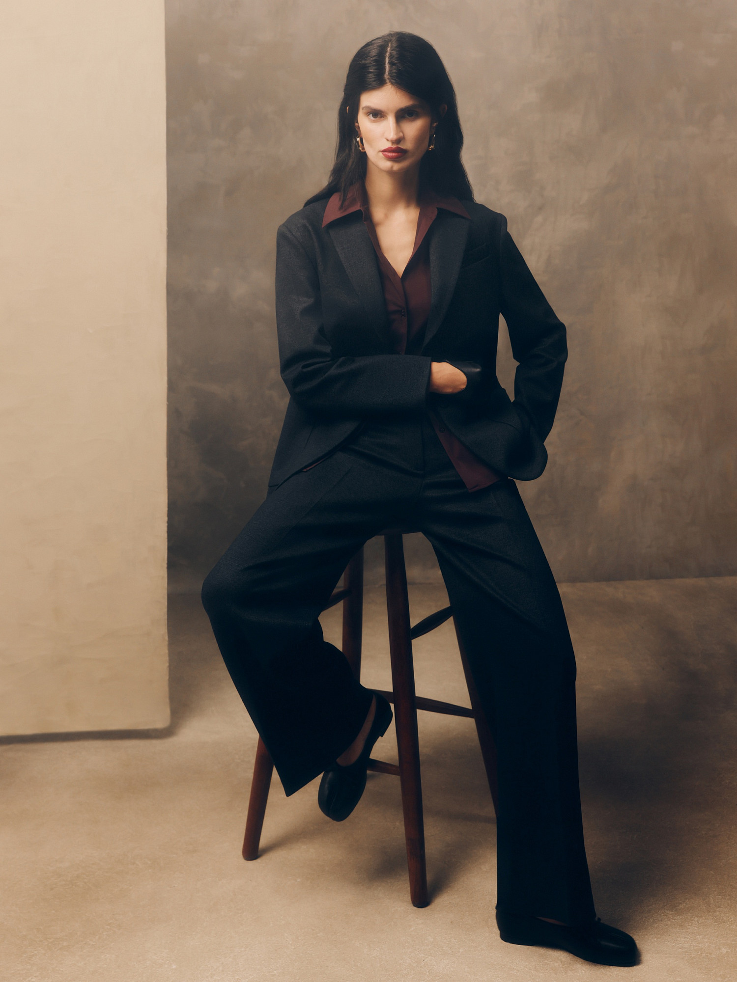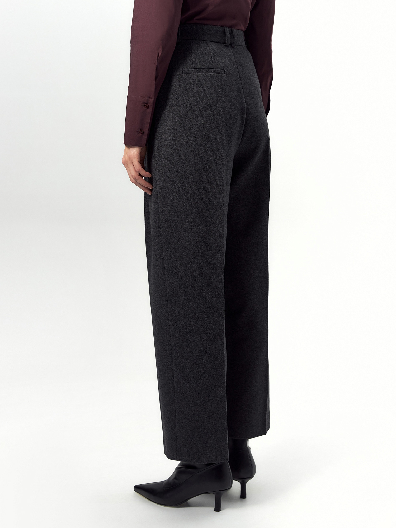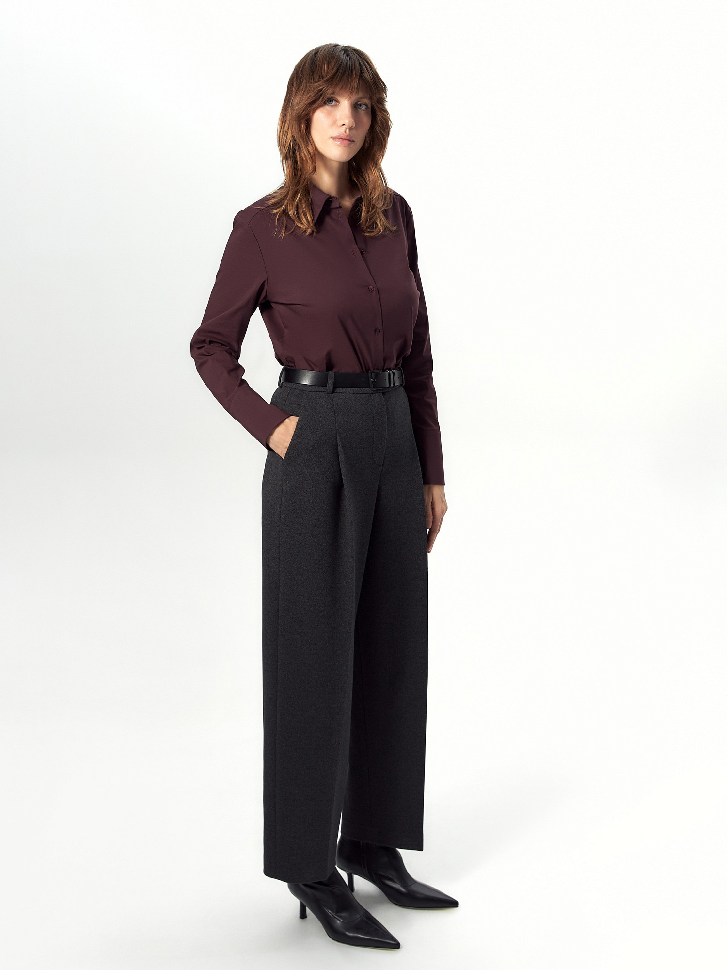 Широкие брюки из двух-сторонней плотной костюмной ткани сине-серого цвета на прямом поясе со шлевками. Имеют два функциональных кармана по бокам и два прорезных кармана сзади.