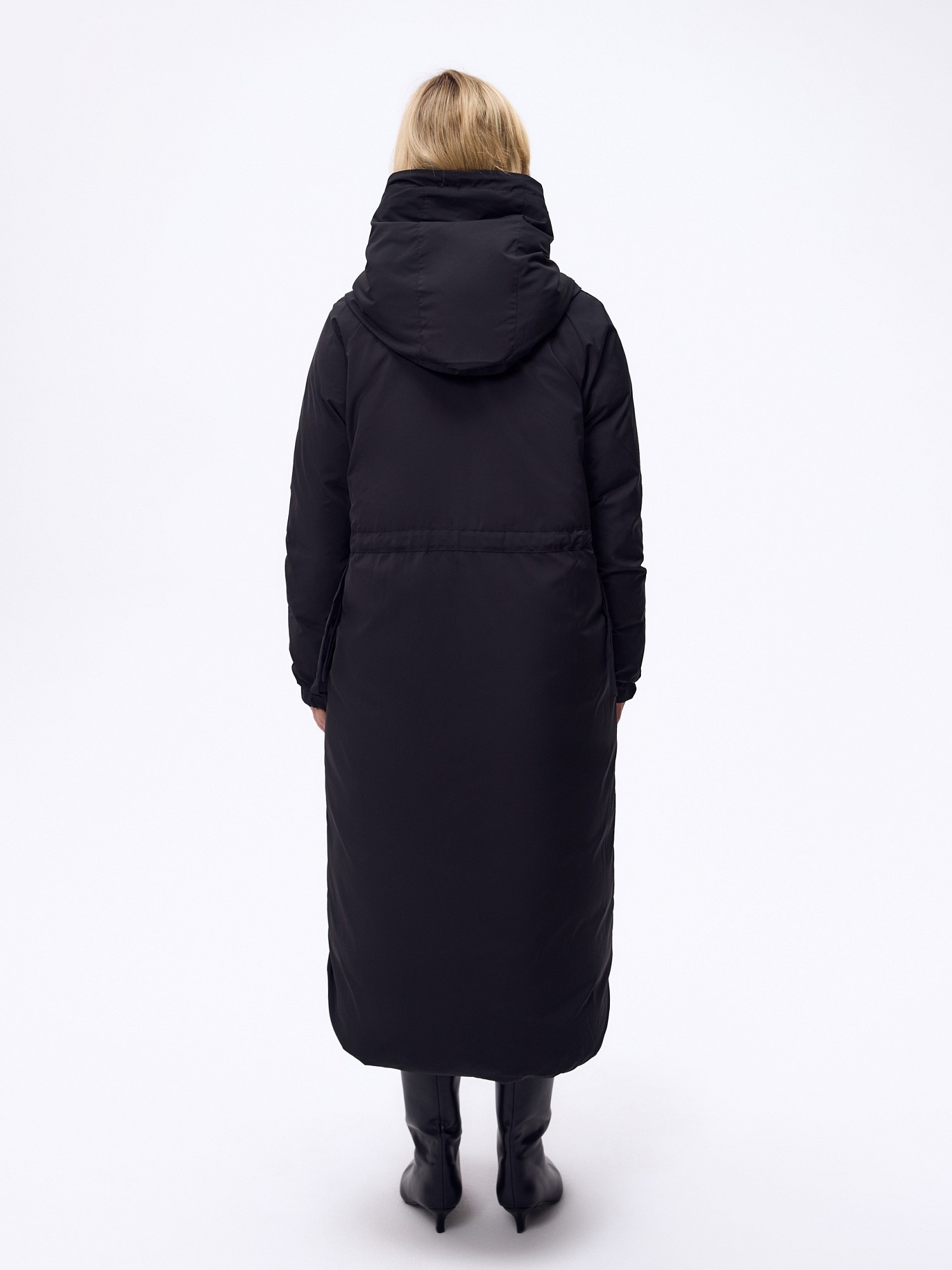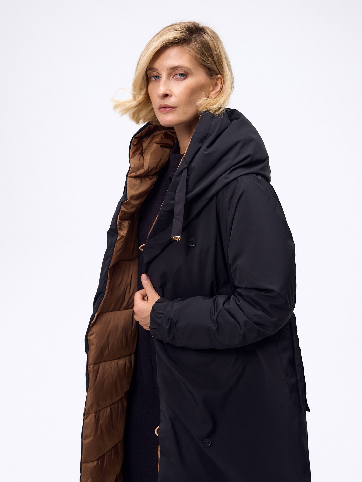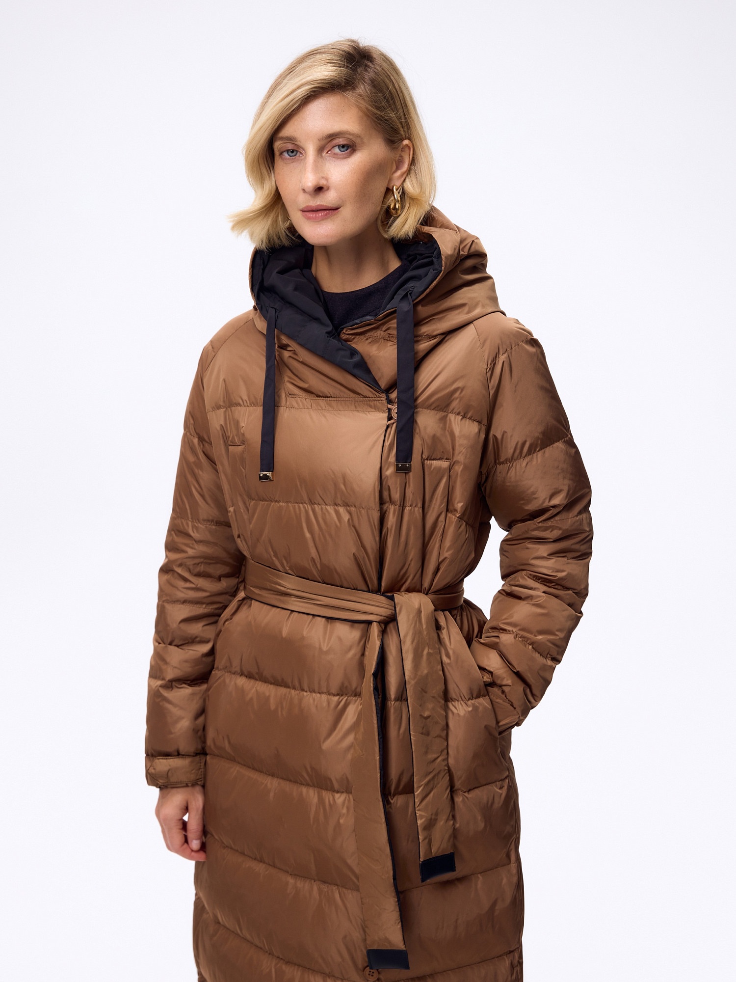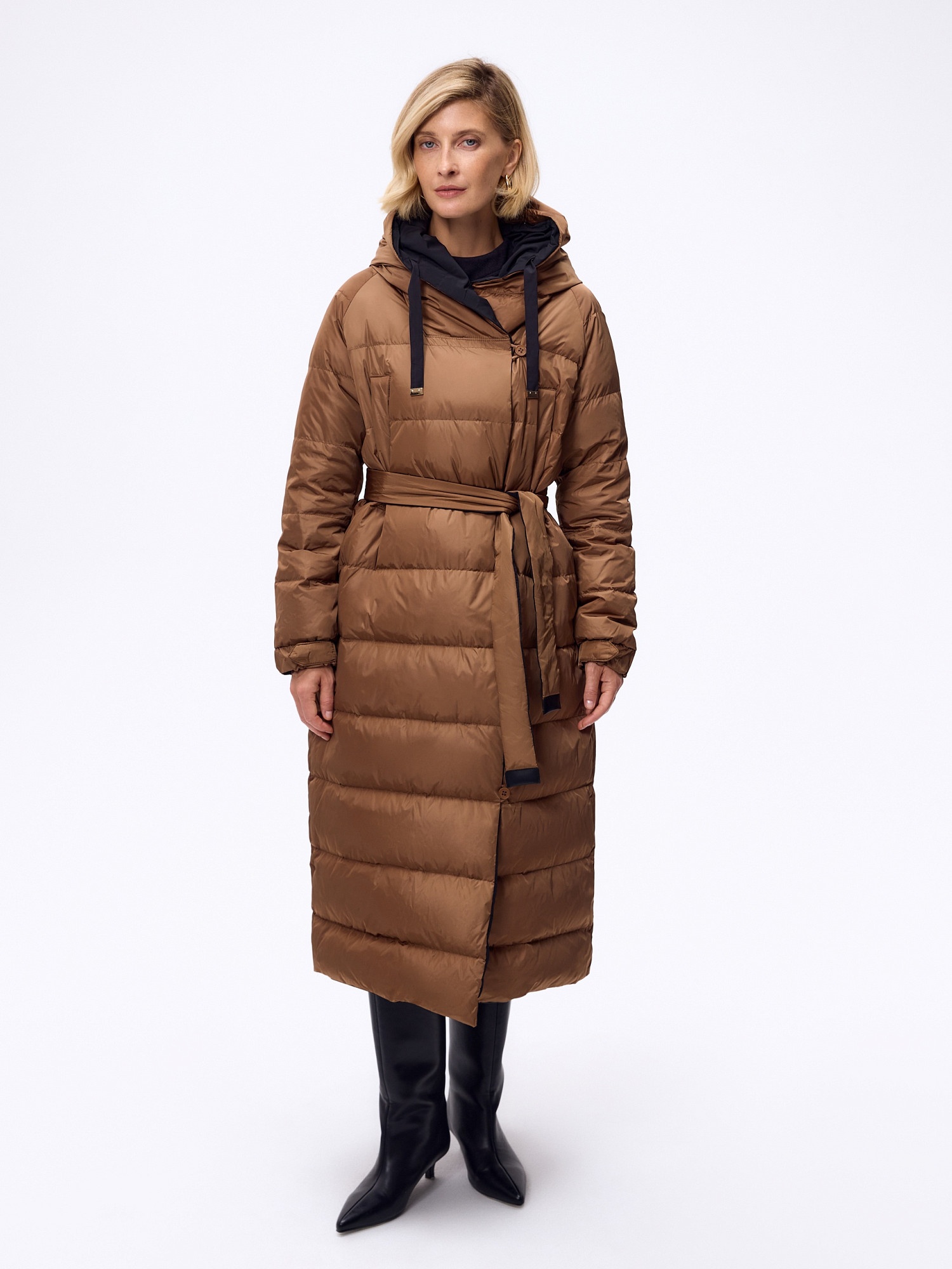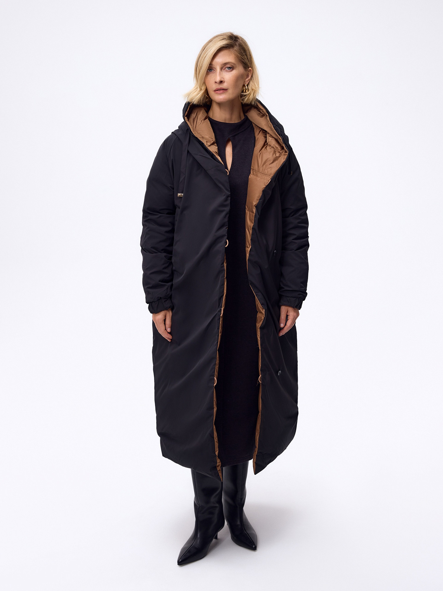 Ультрамодное двухсторонее пальто из плащевой ткани с водоотталкивающим покрытием с натуральным утеплителем пух/перо. Верх выполнен в трендовом золотом оттенке, внутри прячется черная подкладка. За счет уникальной конструкции застежки пуховик в любой момент можно вывернуть и надеть на другую цветную сторону, изменив настроение образа. У пальто комфортный рукав реглан с регулируемой резинкой по низу. Горловину обрамляет глубокий теплый капюшон, надежно защищающий от ветра. В комплект предлагается пояс из основной ткани.