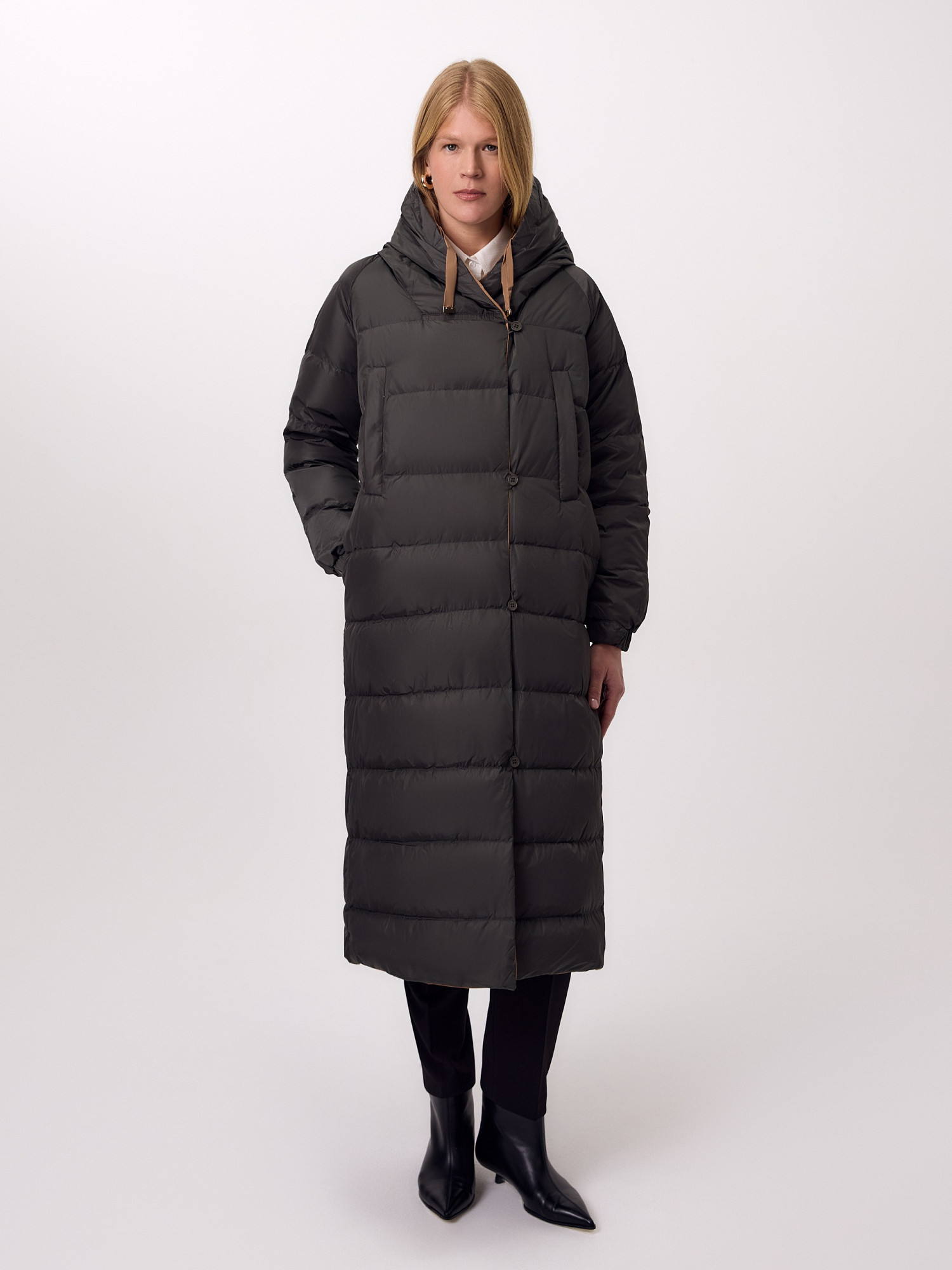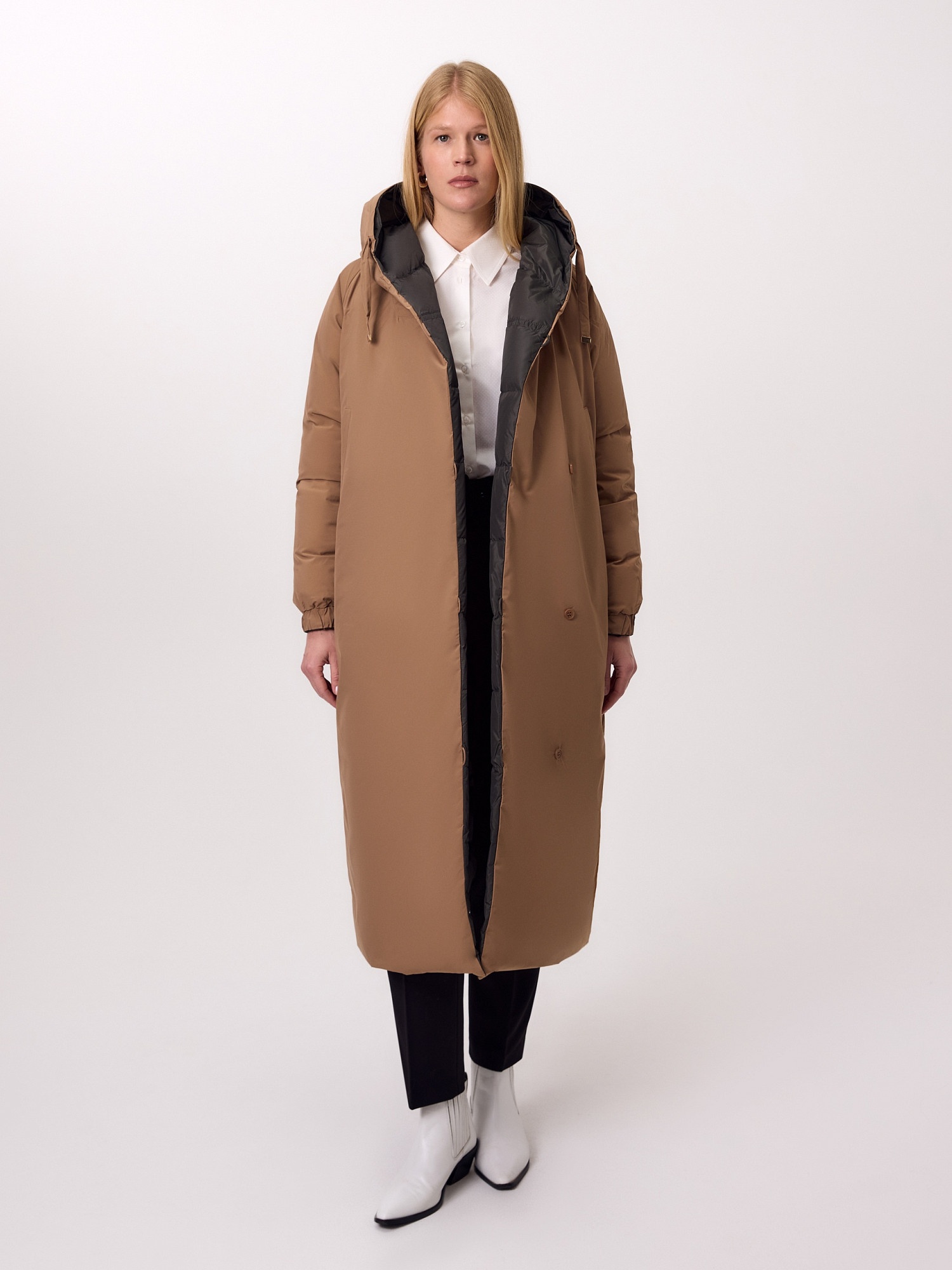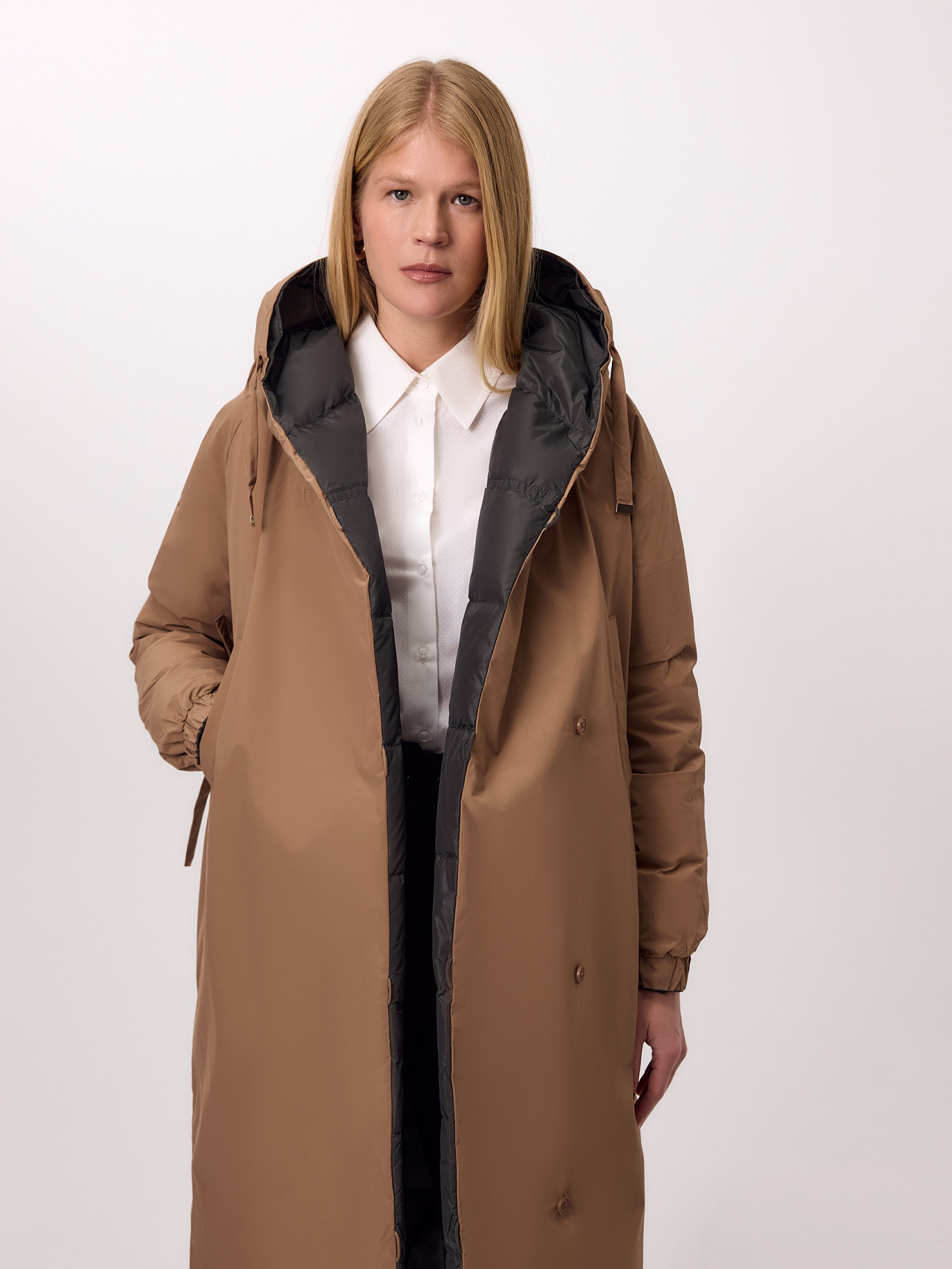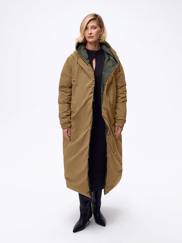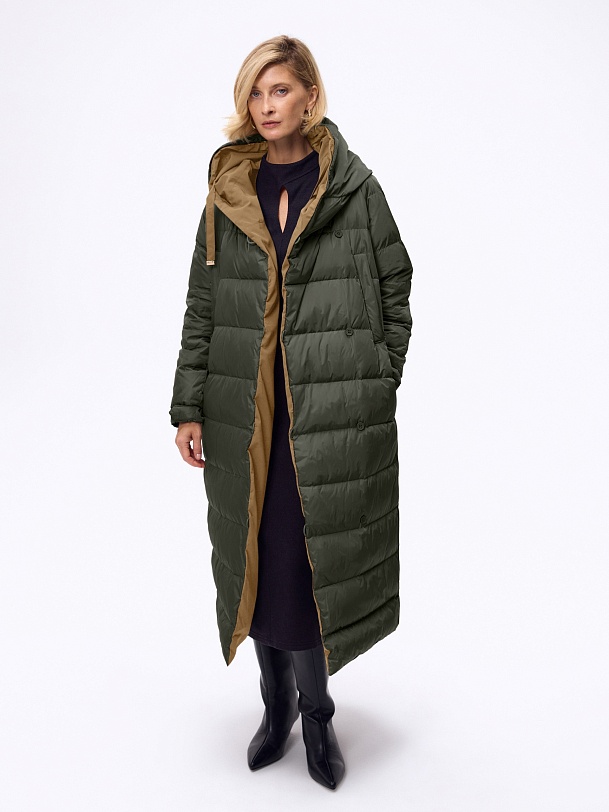 Ультрамодное двухсторонее пальто из плащевой ткани с водоотталкивающим покрытием с натуральным утеплителем пух/перо. Верх выполнен в трендовом цвете малахита, внутри прячется темно-бежевая подкладка. За счет уникальной конструкции застежки пуховик в любой момент можно вывернуть и надеть на другую цветную сторону, изменив настроение образа. У пальто комфортный рукав реглан с регулируемой резинкой по низу. Горловину обрамляет глубокий теплый капюшон, надежно защищающий от ветра. В комплект предлагается пояс из основной ткани.