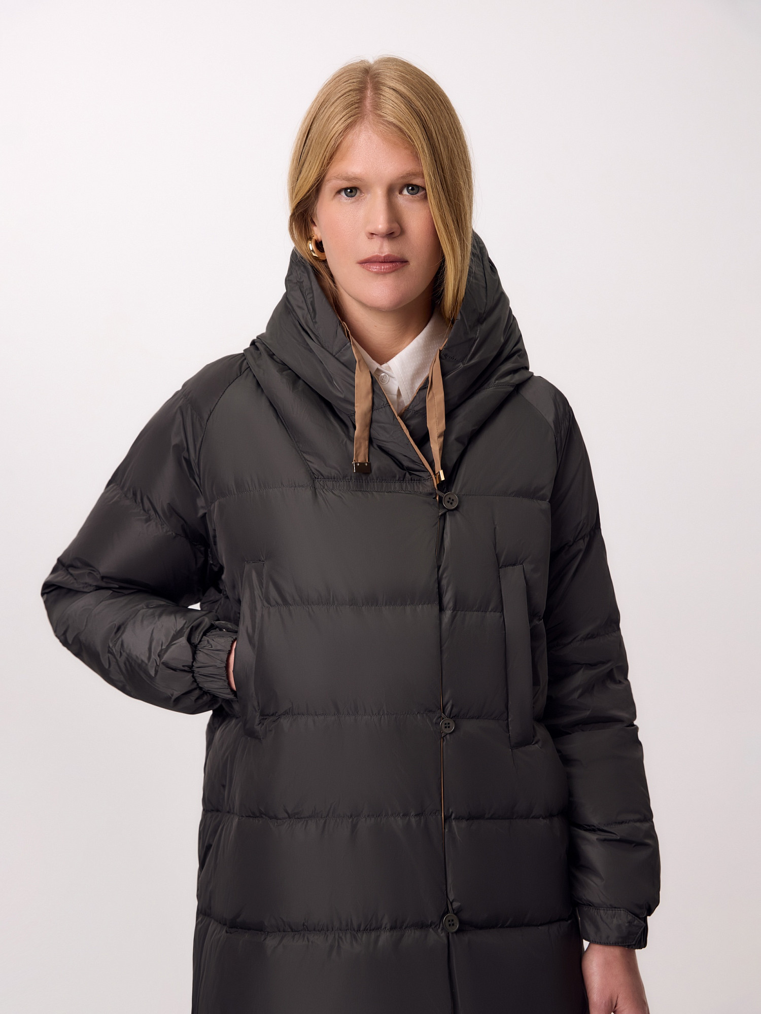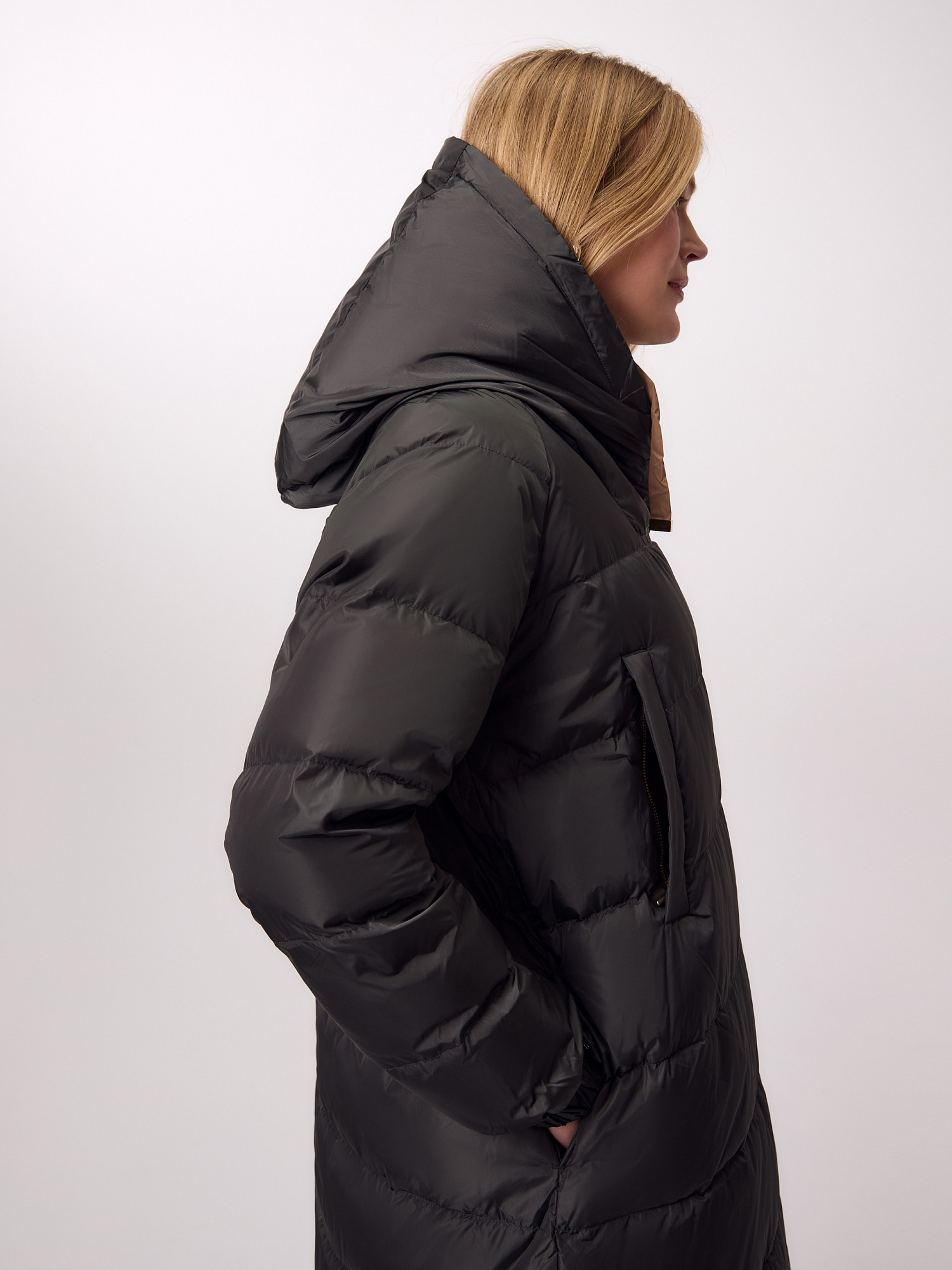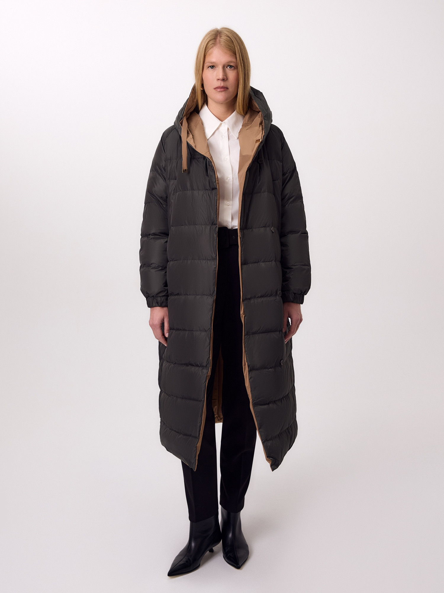 Ультрамодное двухсторонее пальто из плащевой ткани с водоотталкивающим покрытием с натуральным утеплителем пух/перо. Верх выполнен в трендовом цвете малахита, внутри прячется темно-бежевая подкладка. За счет уникальной конструкции застежки пуховик в любой момент можно вывернуть и надеть на другую цветную сторону, изменив настроение образа. У пальто комфортный рукав реглан с регулируемой резинкой по низу. Горловину обрамляет глубокий теплый капюшон, надежно защищающий от ветра. В комплект предлагается пояс из основной ткани.