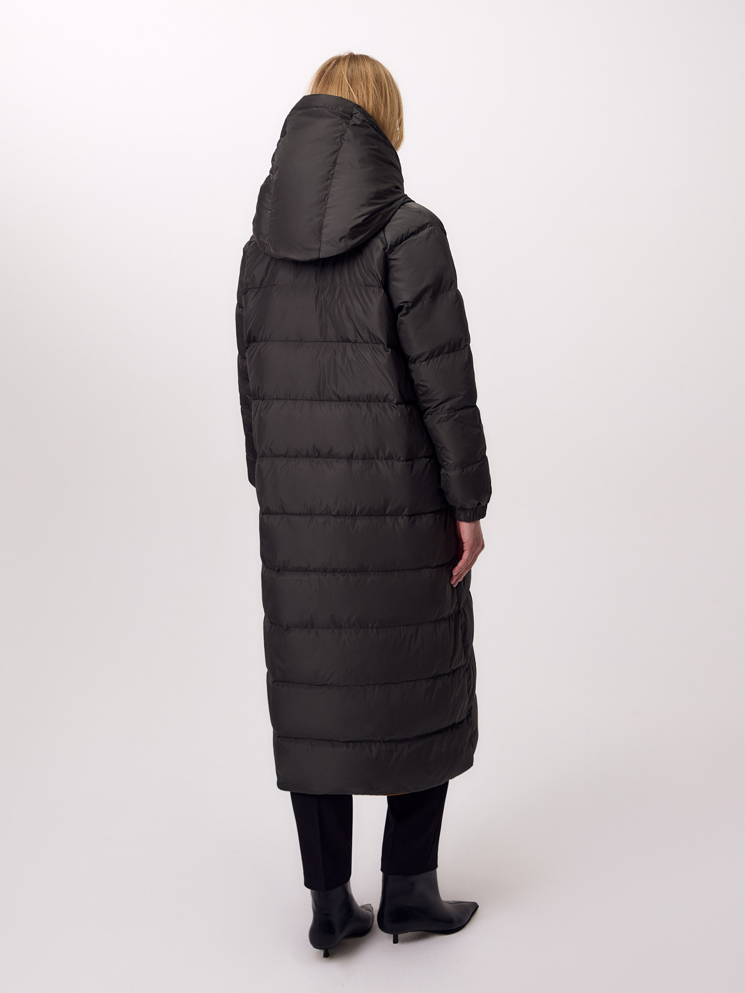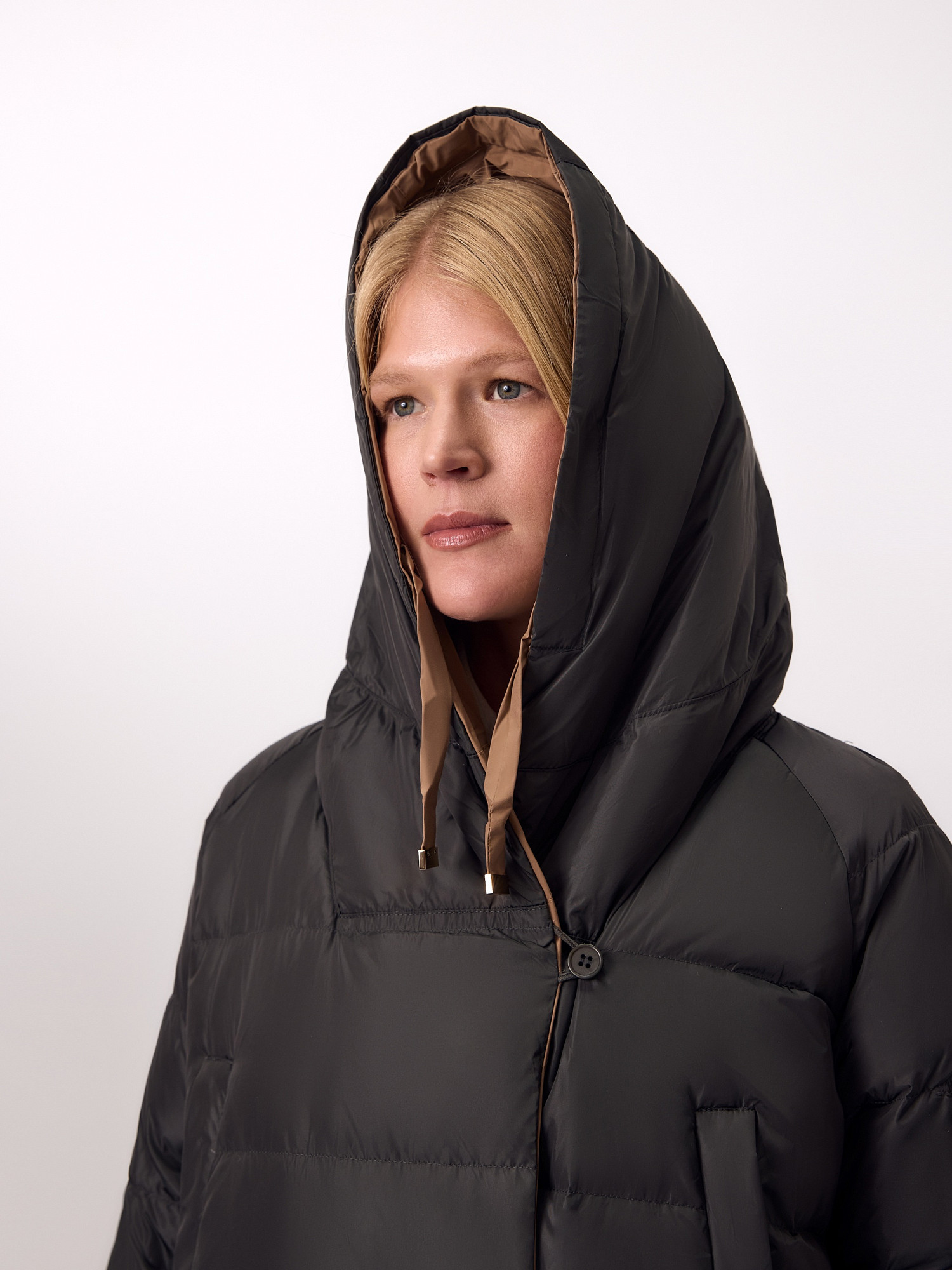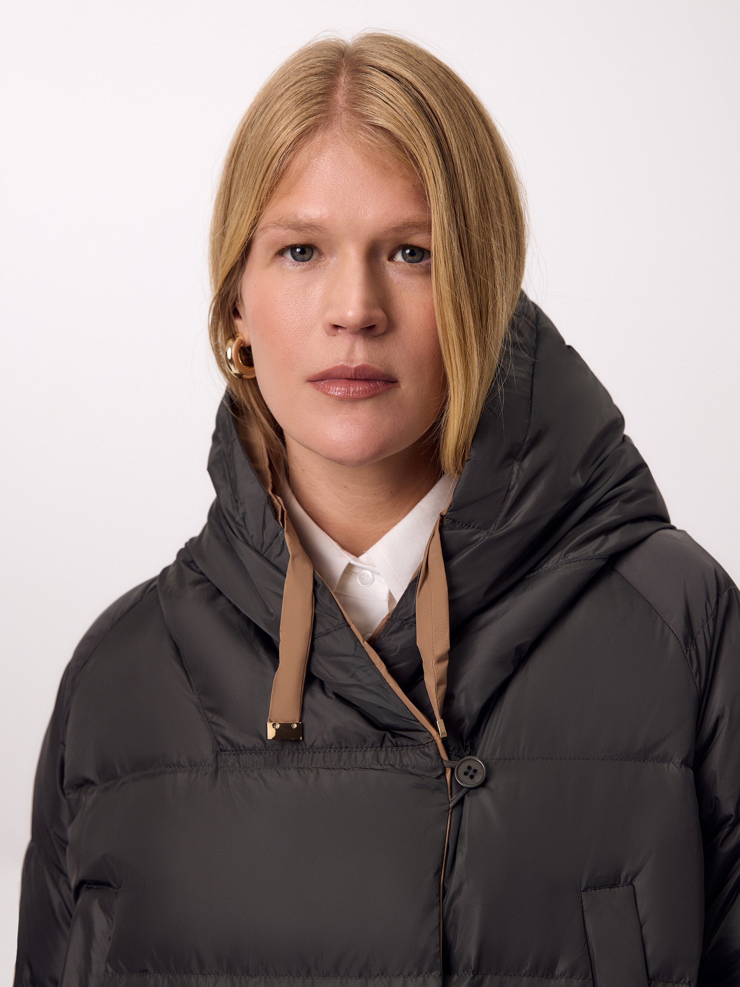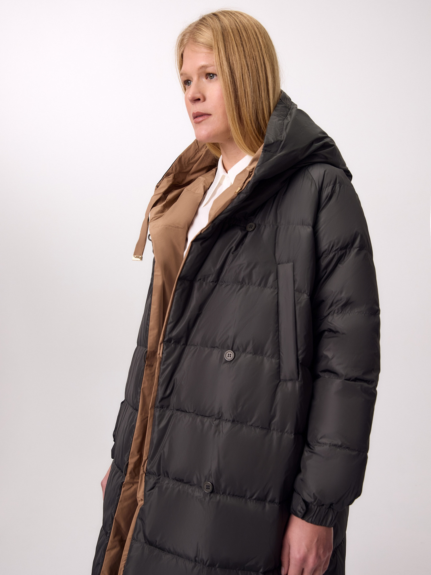 Ультрамодное двухсторонее пальто из плащевой ткани с водоотталкивающим покрытием с натуральным утеплителем пух/перо. Верх выполнен в трендовом цвете малахита, внутри прячется темно-бежевая подкладка. За счет уникальной конструкции застежки пуховик в любой момент можно вывернуть и надеть на другую цветную сторону, изменив настроение образа. У пальто комфортный рукав реглан с регулируемой резинкой по низу. Горловину обрамляет глубокий теплый капюшон, надежно защищающий от ветра. В комплект предлагается пояс из основной ткани.