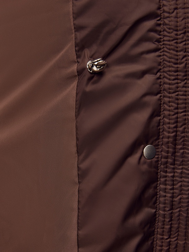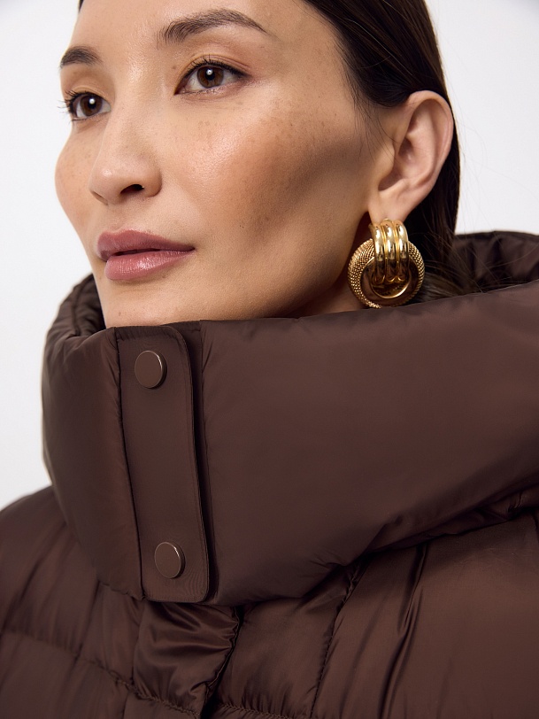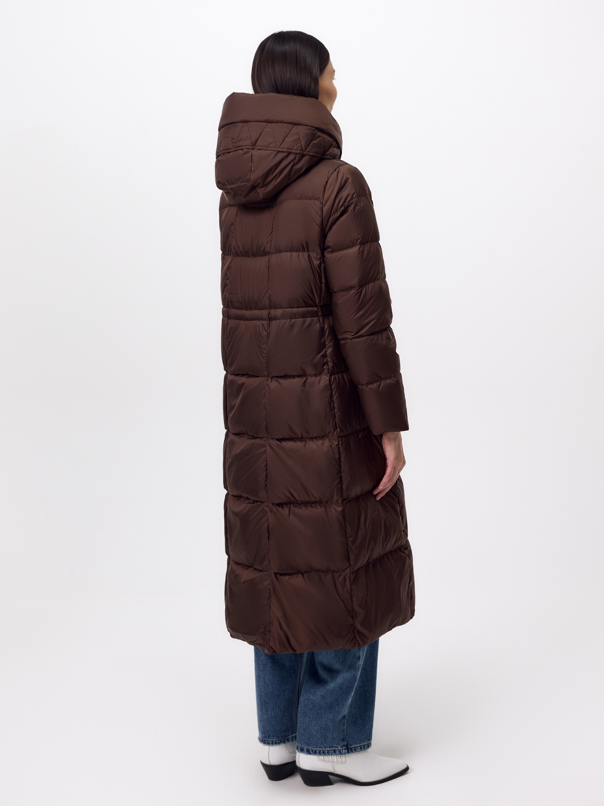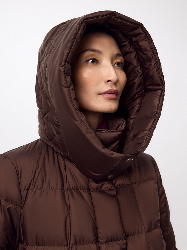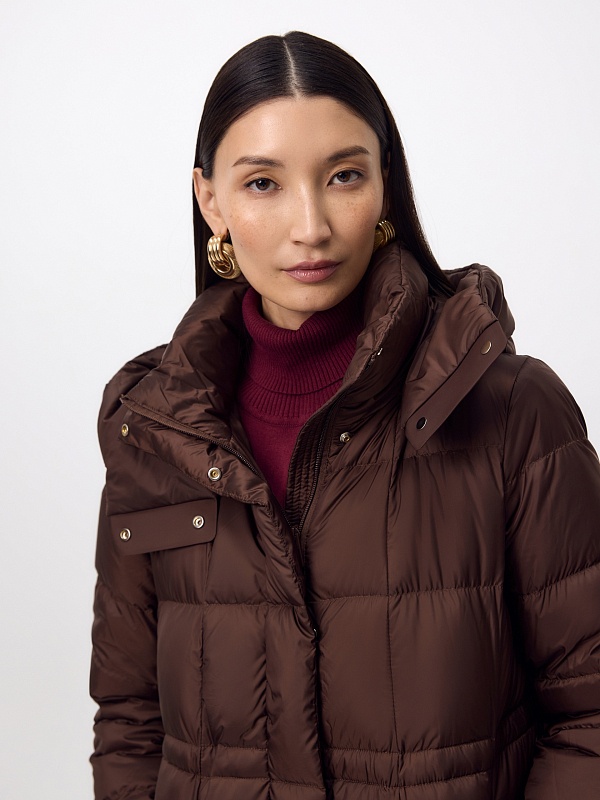 Длинное зимнее пальто в классическом шоколадном оттенке из плащевой ткани с водооотталкивающим покрытием с натуральным утеплителем пух/перо. Пальто полуприлегающего силуэта, с широкой расклешенной нижней частью. Втачной рукав с дополнительной манжетой на резинке по низу и высокий воротник-стойка с глубоким капюшоном надежно защищают от холода и ветра. По бокам расположены вместительные карманы, талия регулируется при помощи внутренней кулиски лучшего тепла. Внутри пальто имеется дополнительная подкладка для защиты от истирания.
