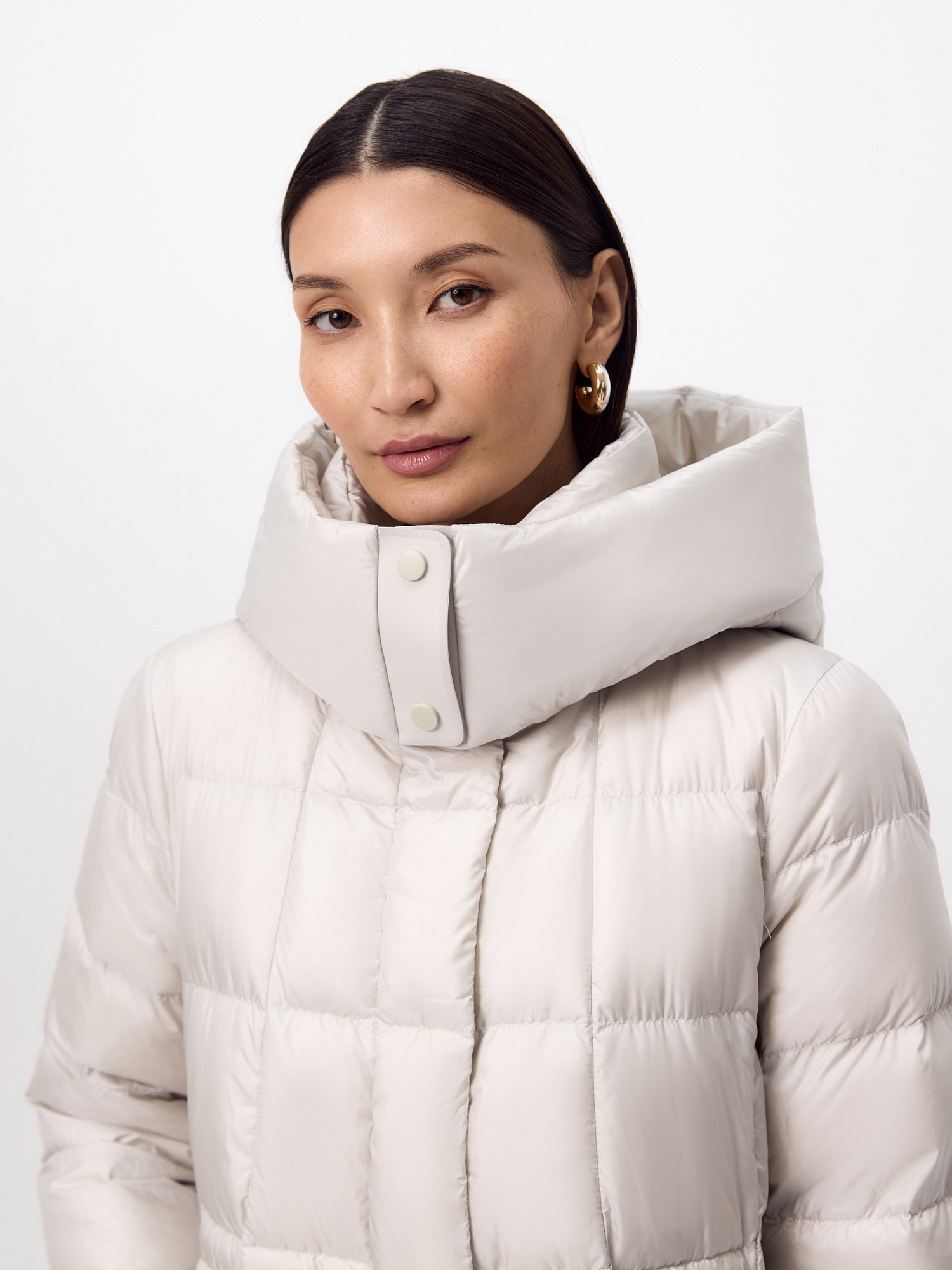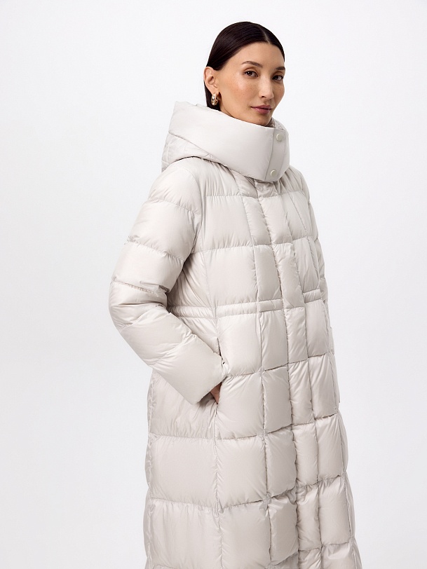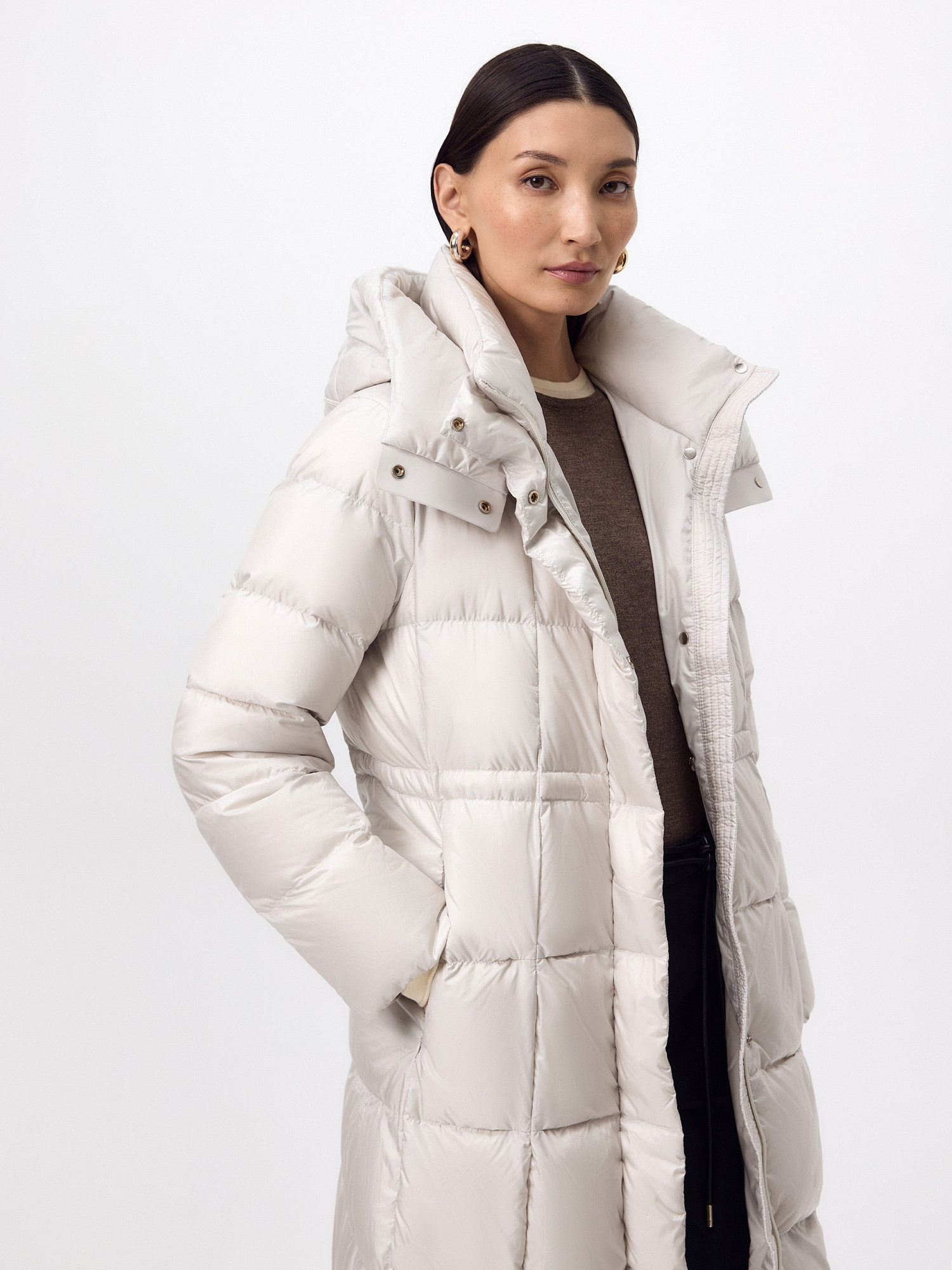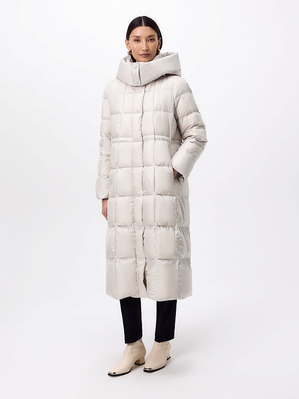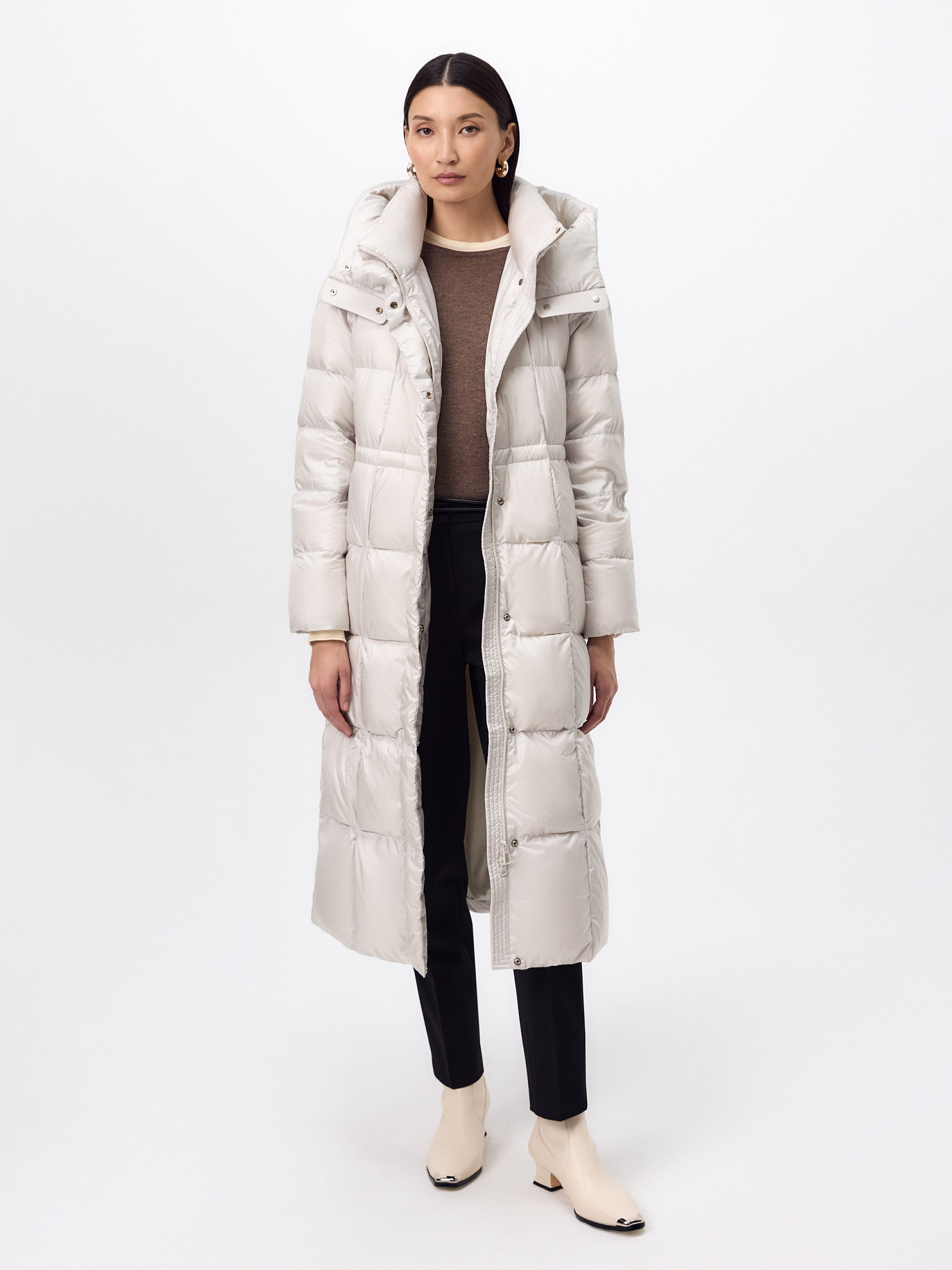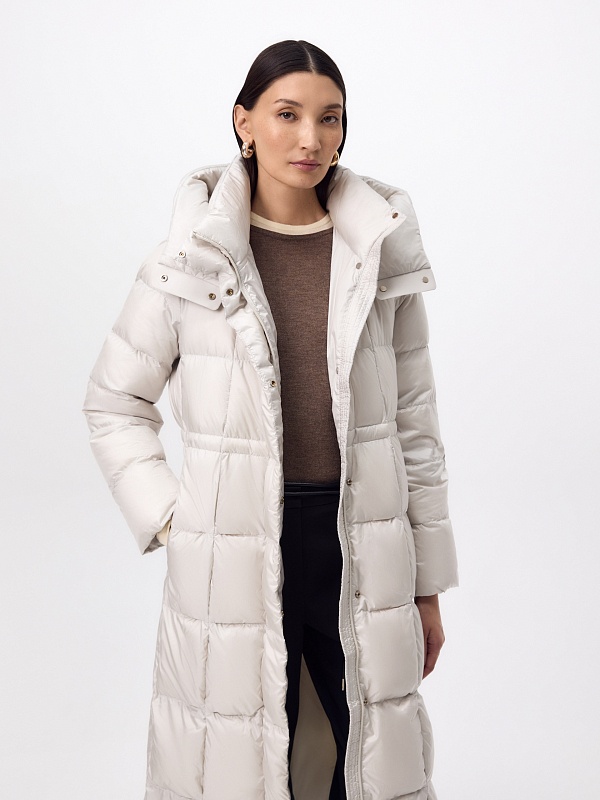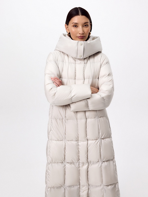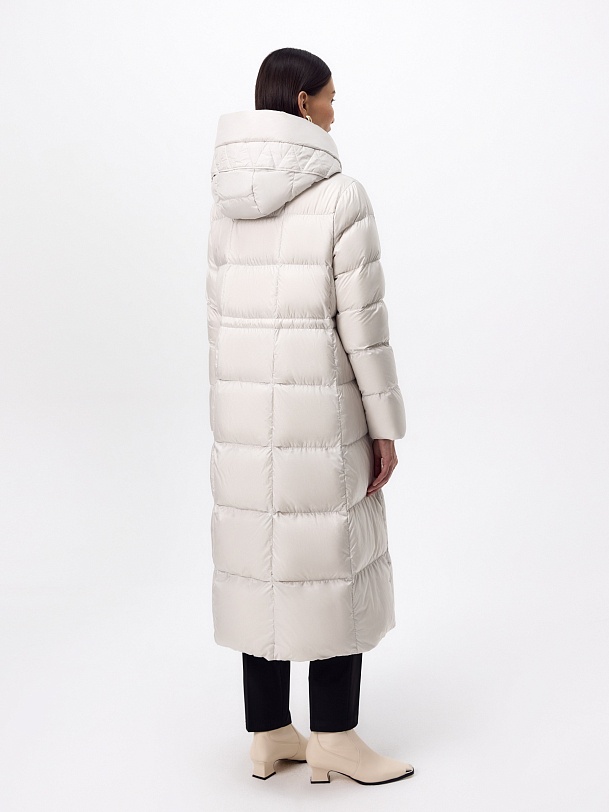 Длинное зимнее пальто в классическом молочном оттенке из плащевой ткани с водооотталкивающим покрытием с натуральным утеплителем пух/перо. Пальто полуприлегающего силуэта, с широкой расклешенной нижней частью. Втачной рукав с дополнительной манжетой на резинке по низу и высокий воротник-стойка с глубоким капюшоном надежно защищают от холода и ветра. По бокам расположены вместительные карманы, талия регулируется при помощи внутренней кулиски лучшего тепла. Внутри пальто имеется дополнительная подкладка для защиты от истирания.