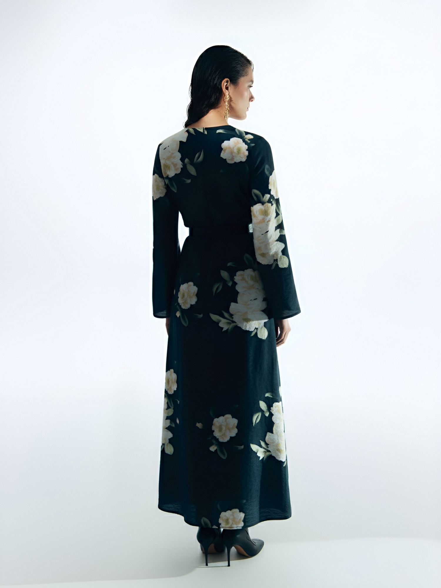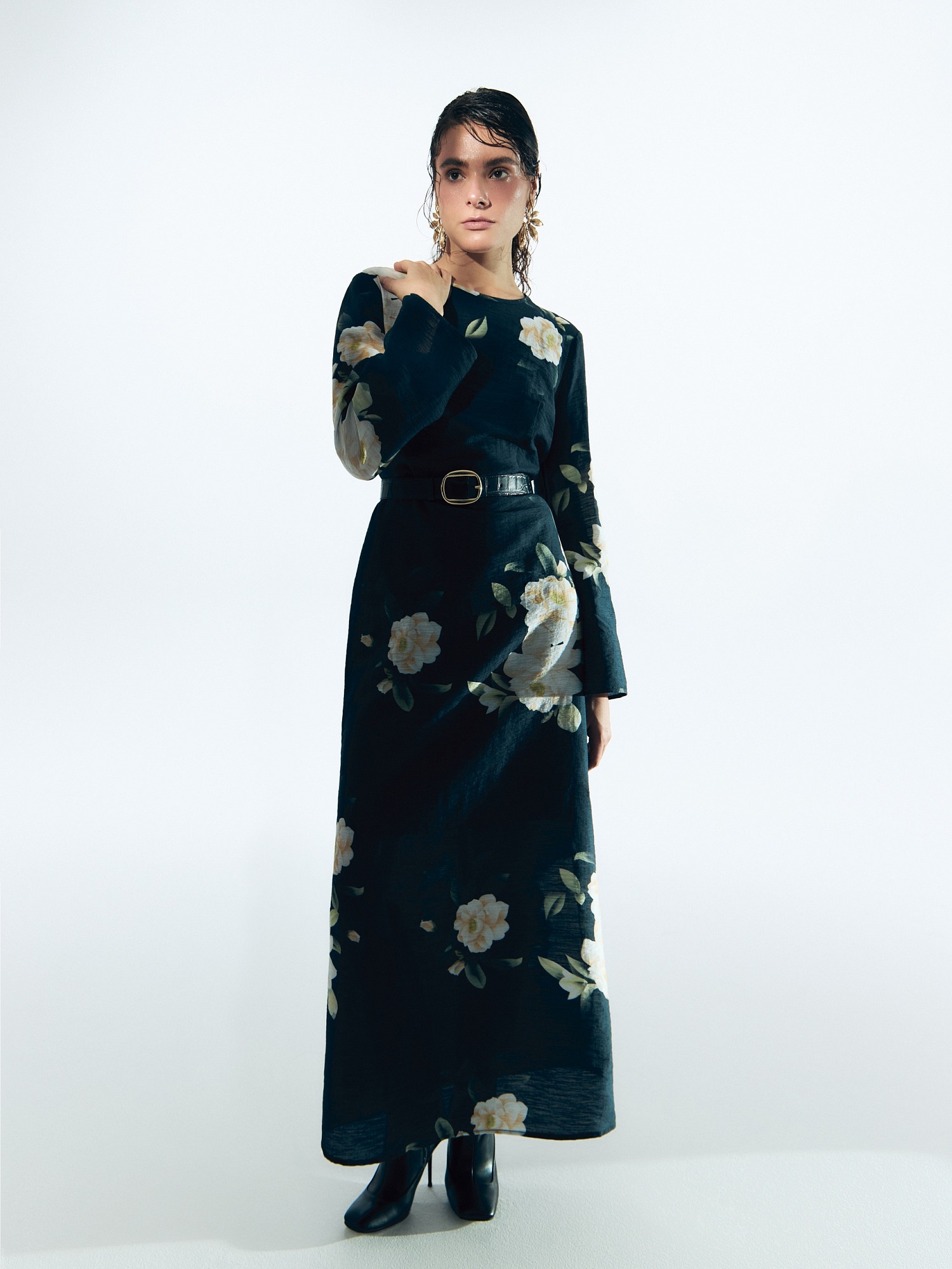 Приталенное платье из тонкой ткани с крупными цветами. Цвет — черный. Горловина круглая, рукав длинный, расширенный к низу. На спинке — потайная молния. В комплекте — пояс-шнур.