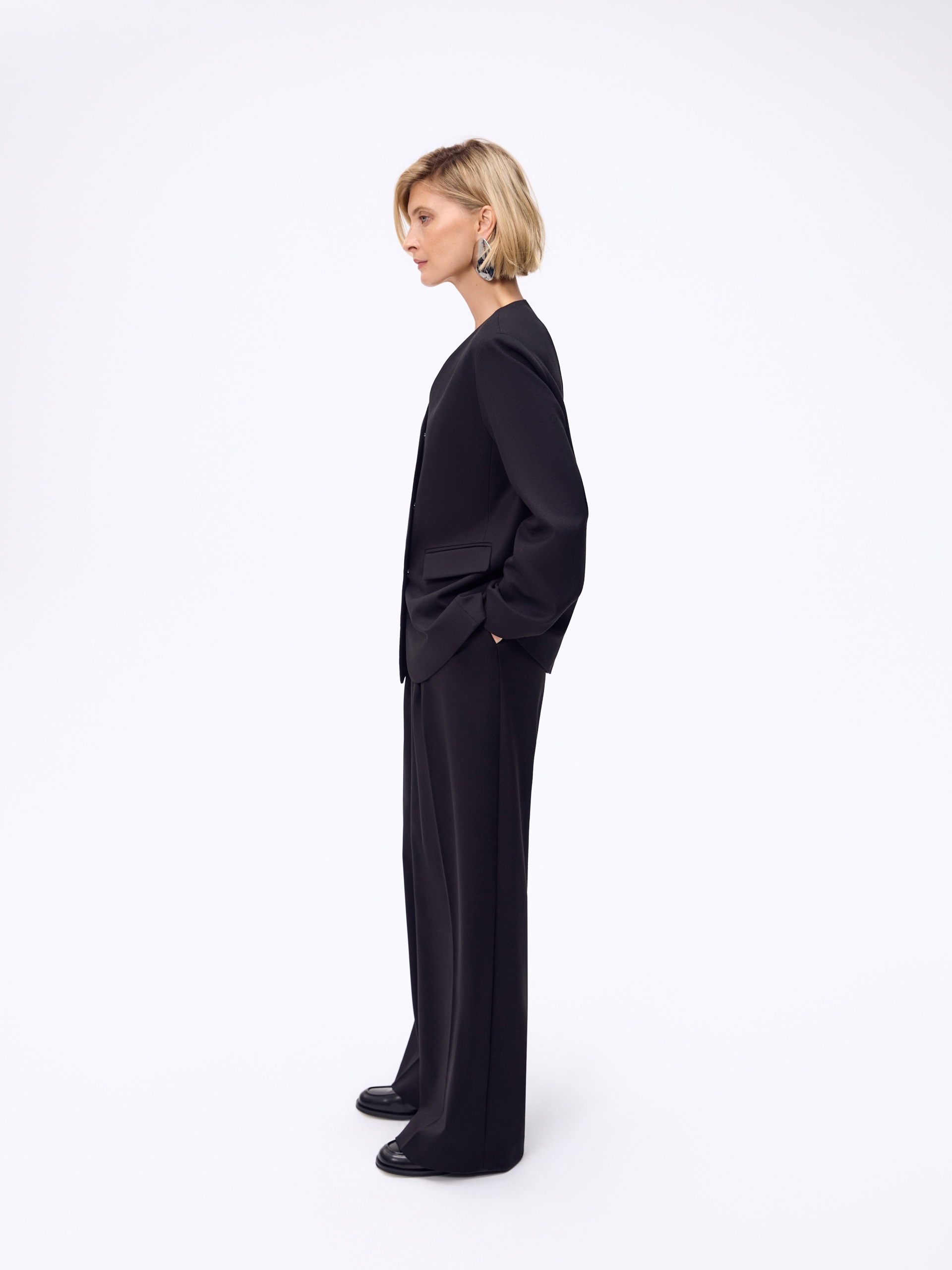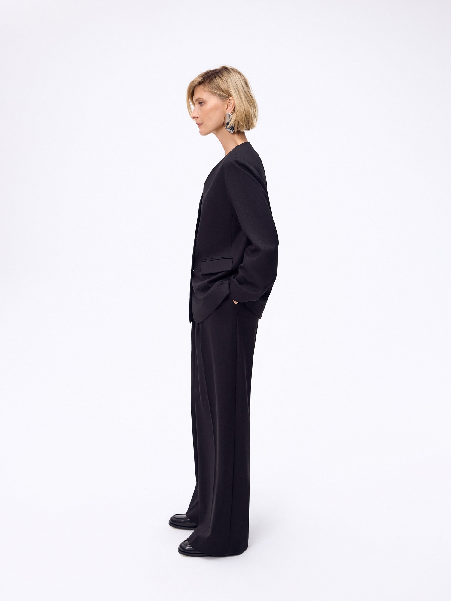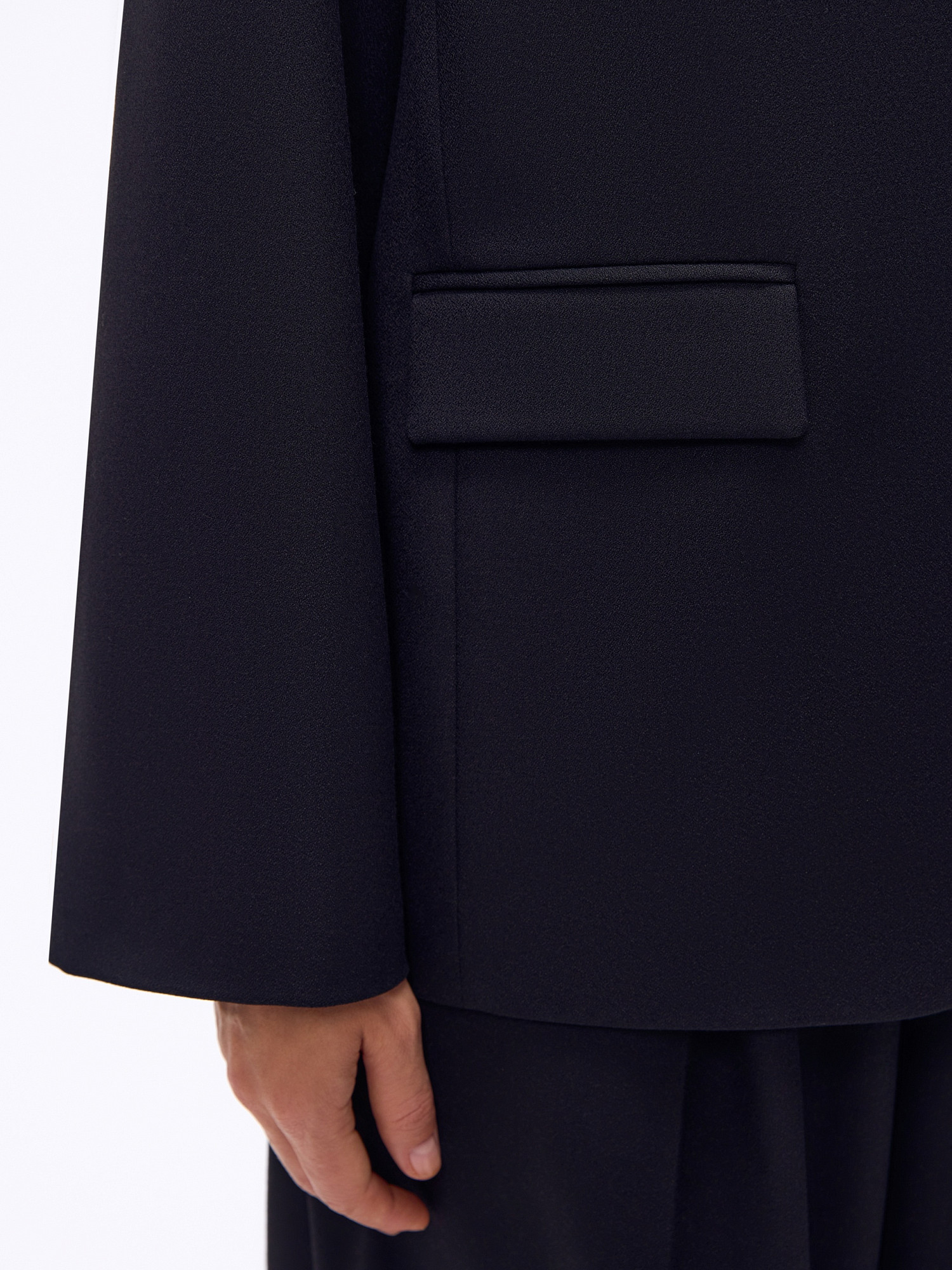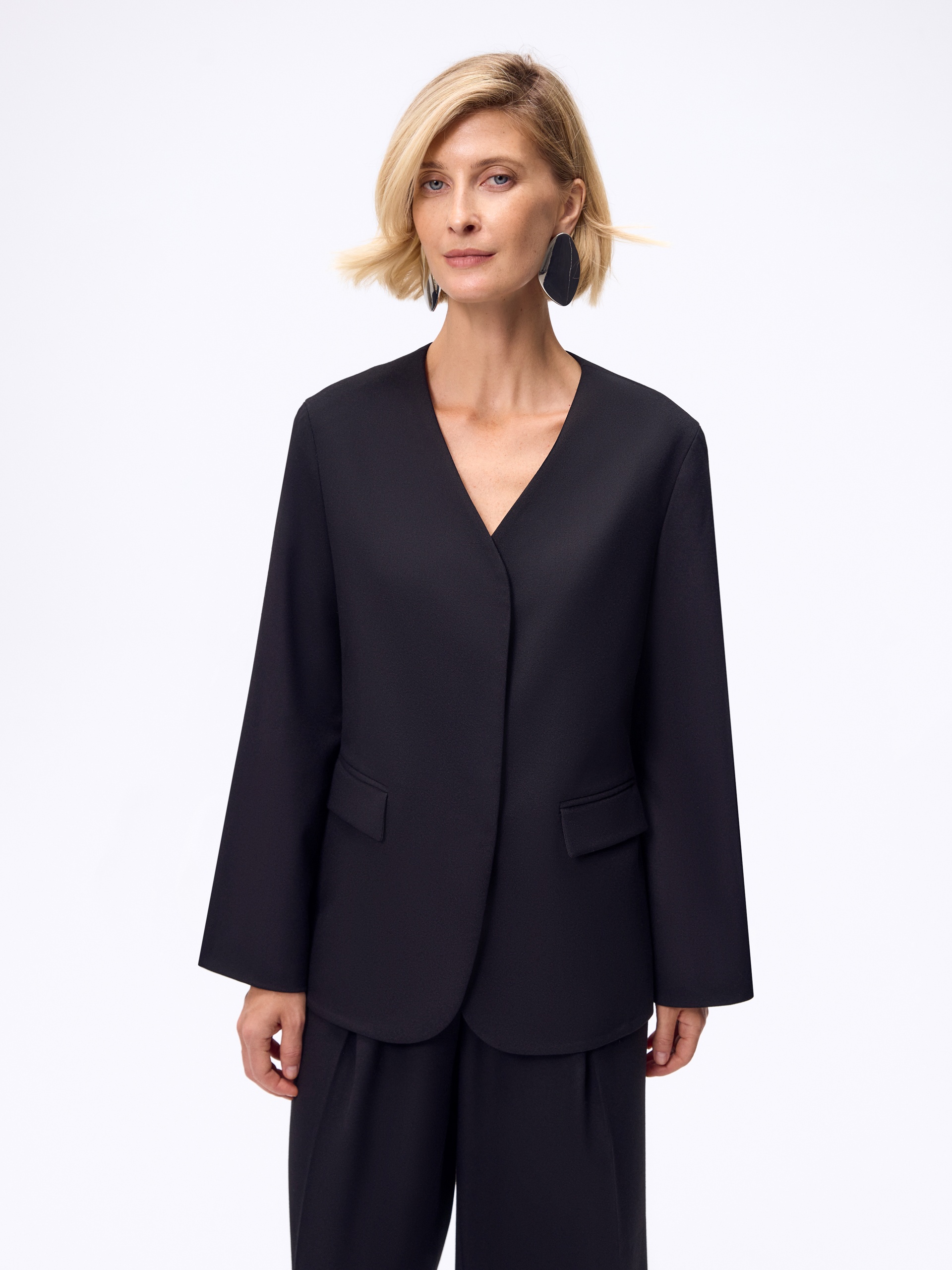Однобортный жакет на кнопках, с V-образным вырезом и слегка приспущенной линией плеч. Прорезные карманы с клапанами на полочке.