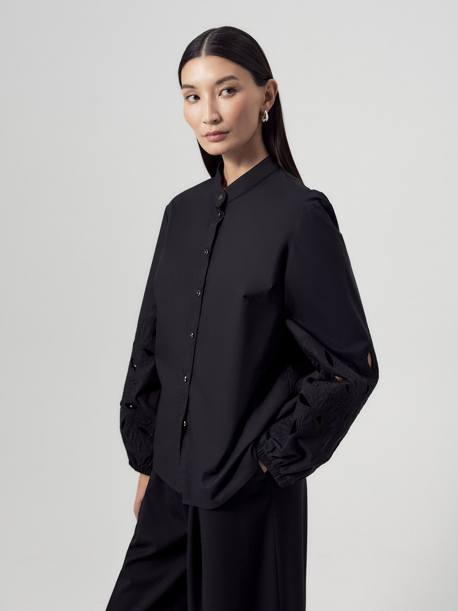 Прямая блуза с воротником стойкой, объемным втачным рукавом с шитьем по низу и сборкой. На спинке кокетка со складкой.