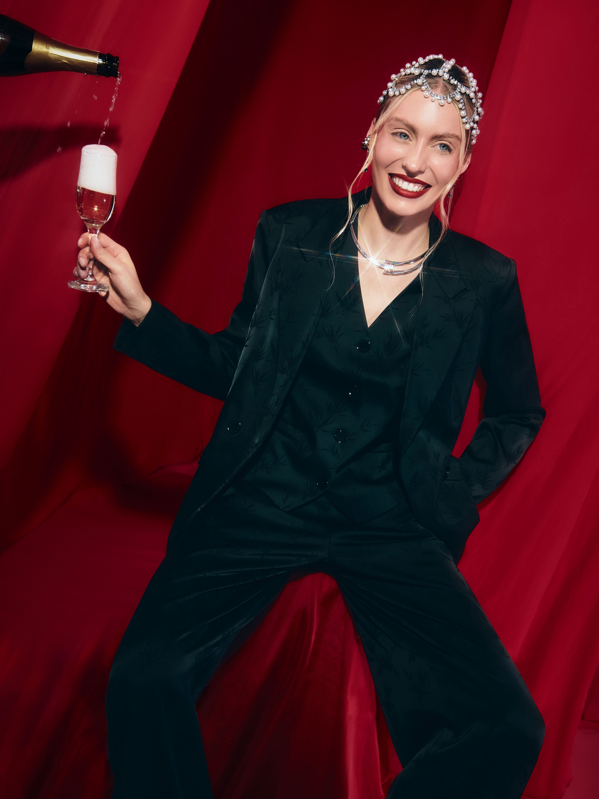 Однобортный полуприлегающий жакет с английским воротником. Прорезные карманы с клапанами на полочке. Жакет выполнен из черной жаккардовой ткани.