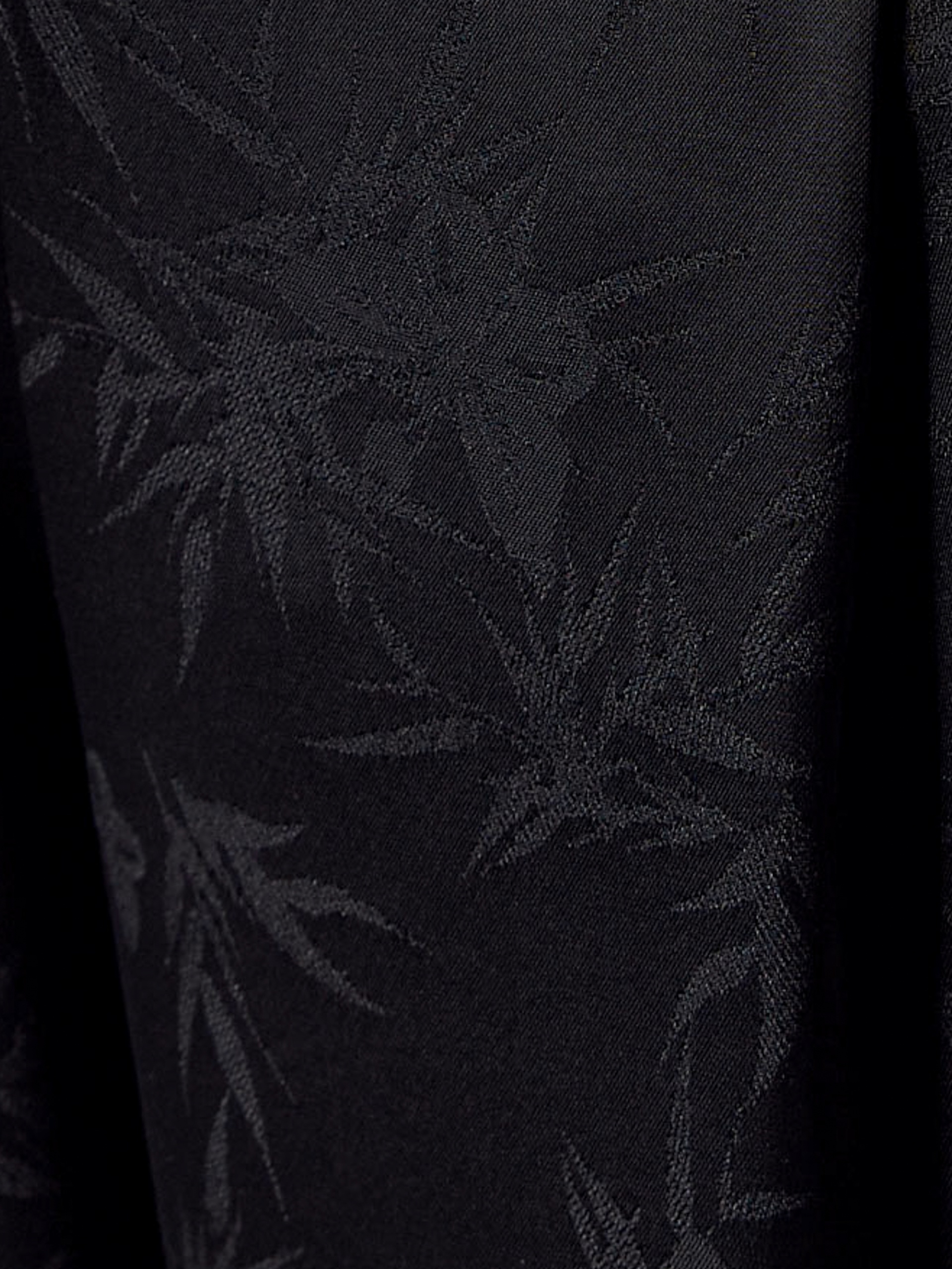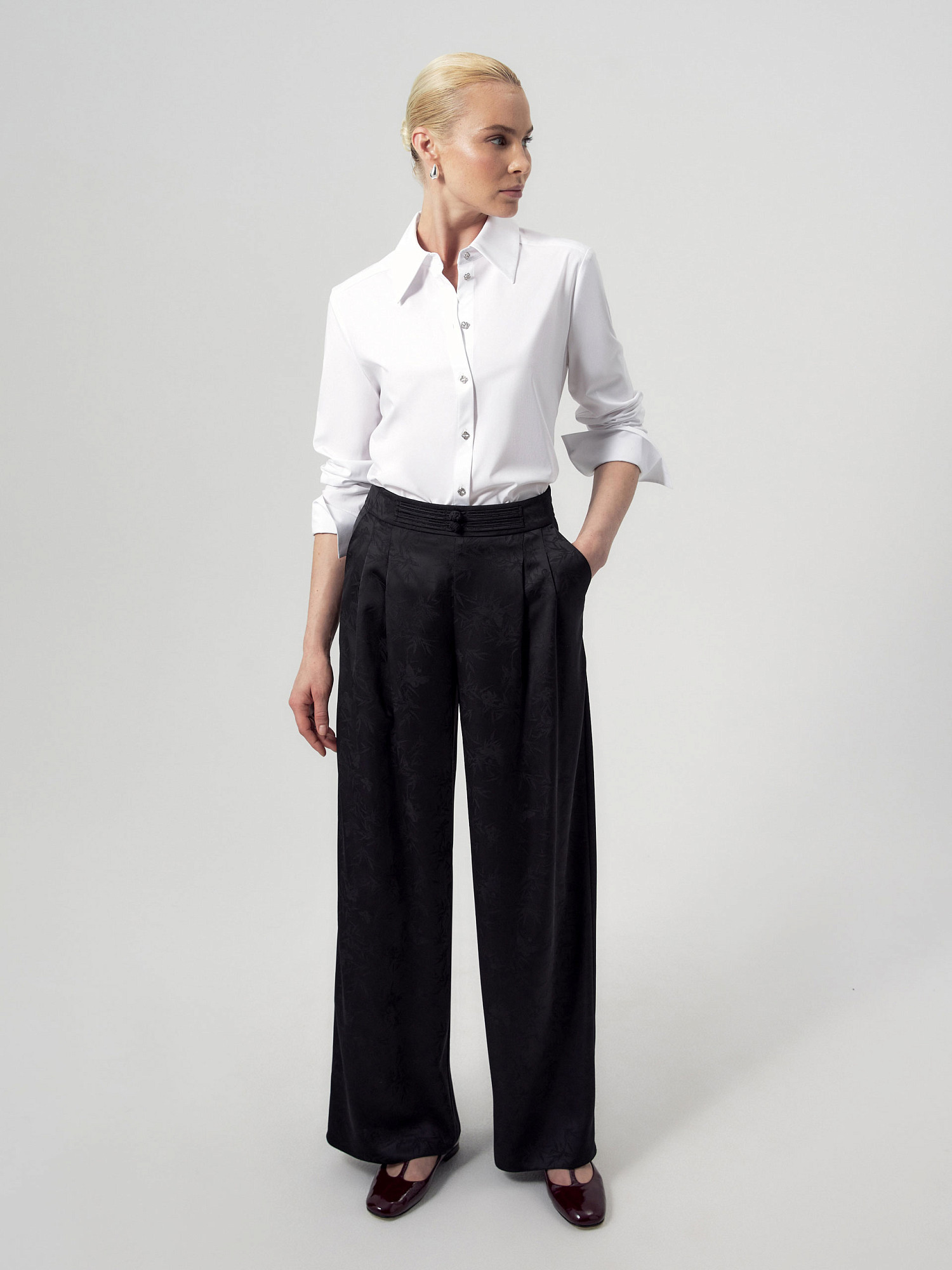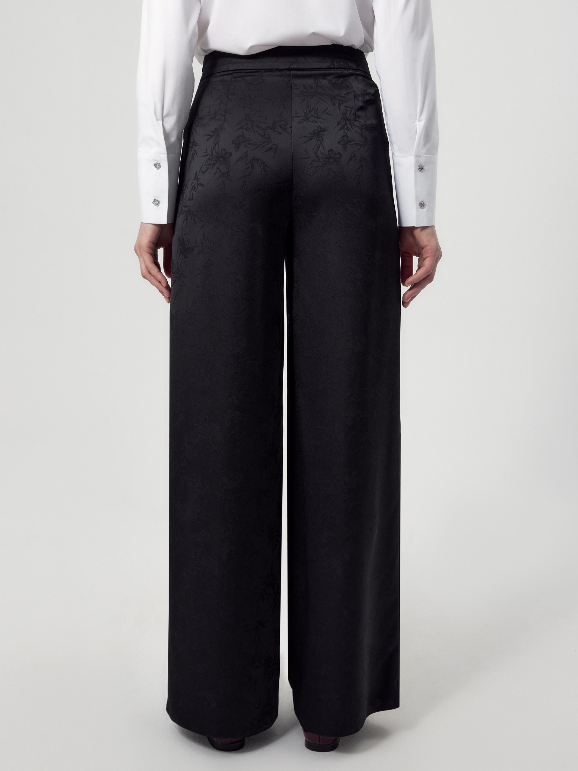 Широкие брюки со складками из черного жаккарда с карманами по бокам и потайной молнией в боковом шве. На поясе декоративные застежки в виде узлов.