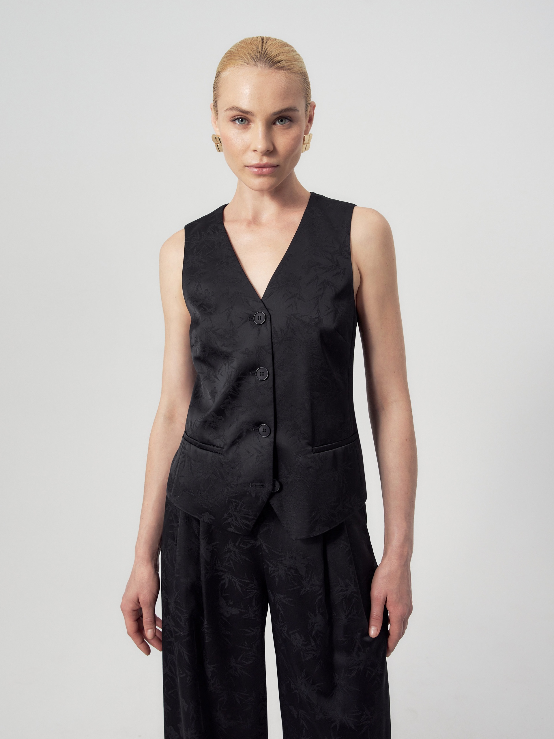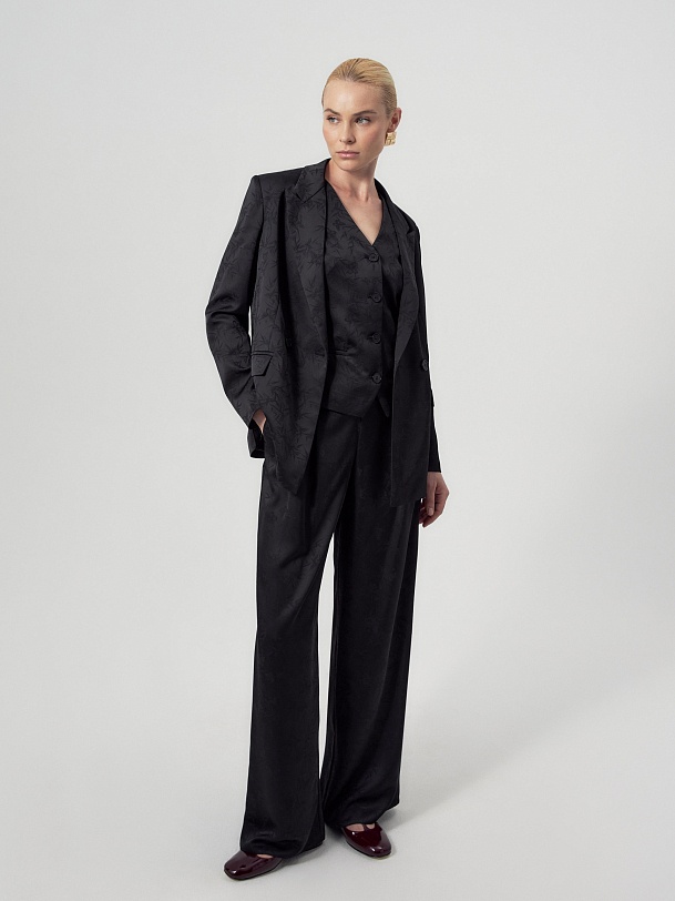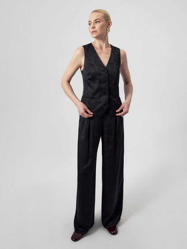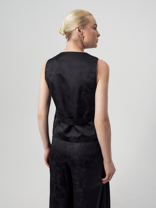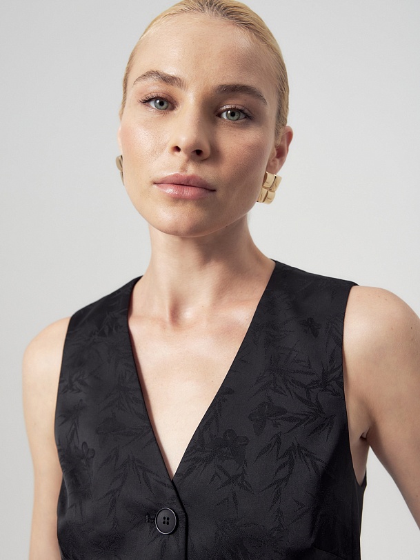 Прямой чуть приталенный жилет из черного жаккарда. Жилет с V-образным вырезом на пуговицах и декоративным элементом на спинке. В жилете имеются прорезные карманы с листочками. Идеально впишется в образ с жакетом и брюками из этой же ткани.