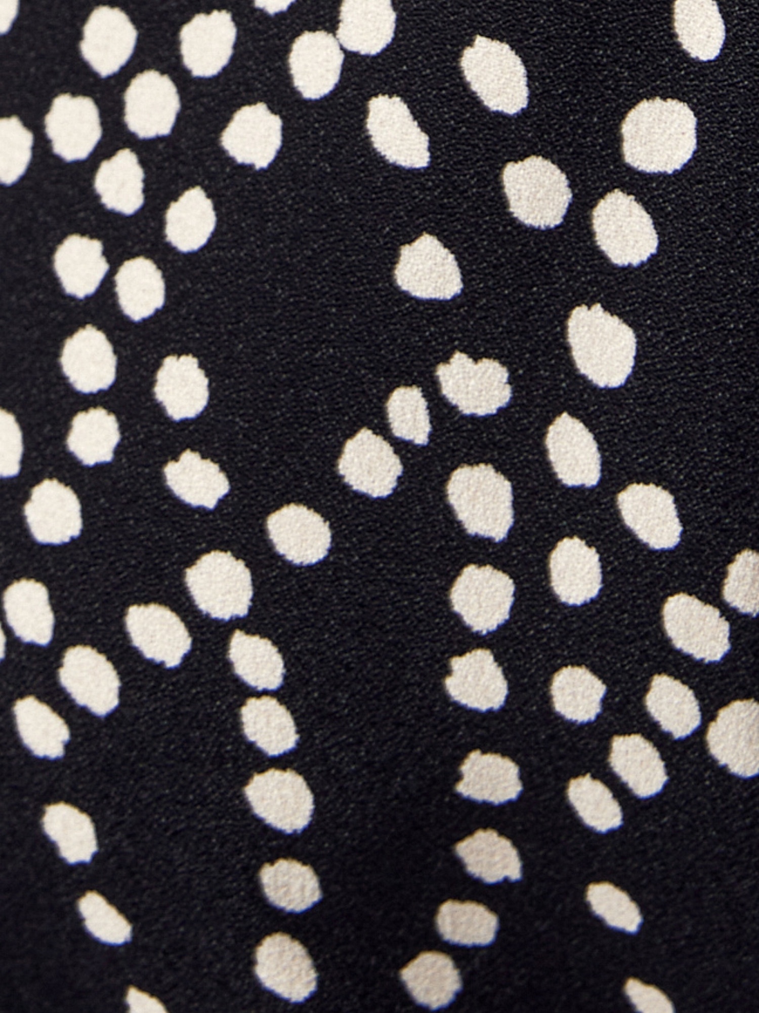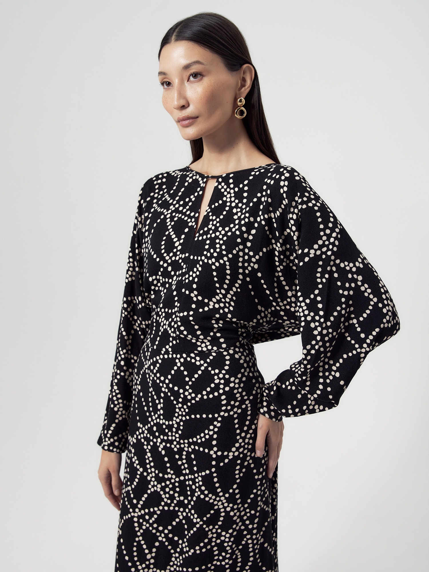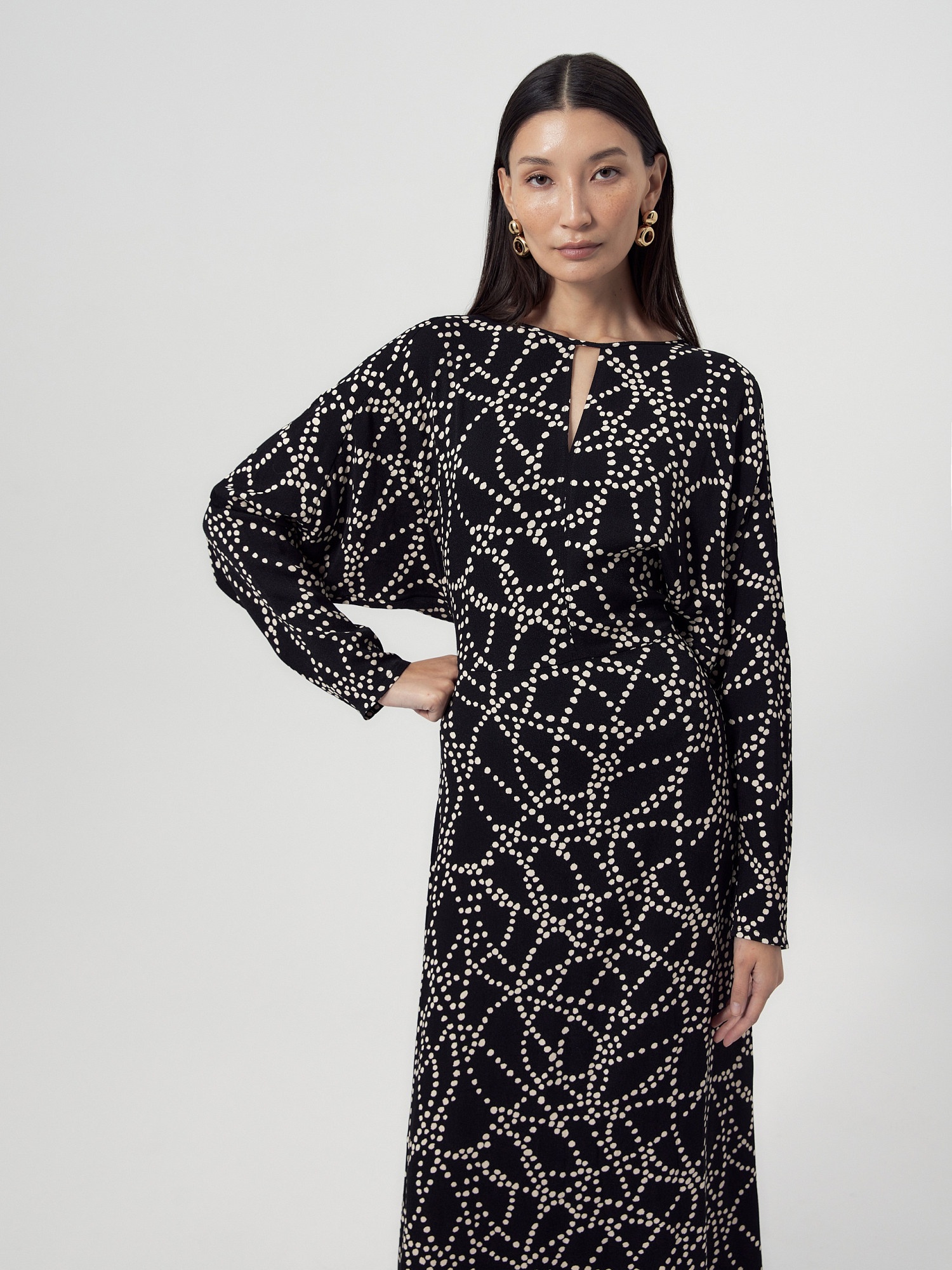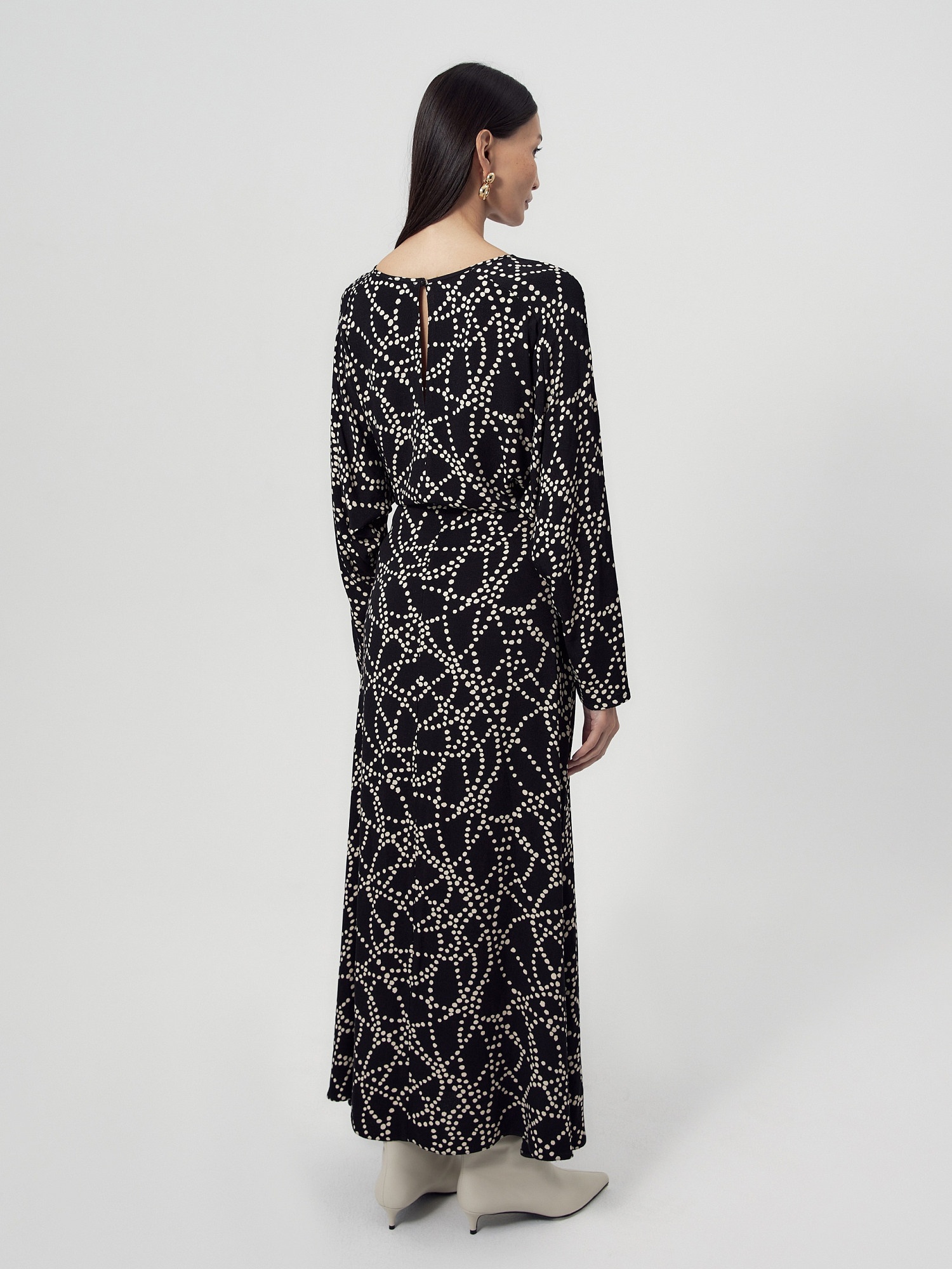 Приталенное длинное платье в принте с черно-белым горохом. Горловина круглая, спереди небольшой разрез-капля, на спинке разрез с пуговицей на горловине. Рукав реглан, к низу зауженный. На спинке резинка по линии талии. Юбка расклешенная.