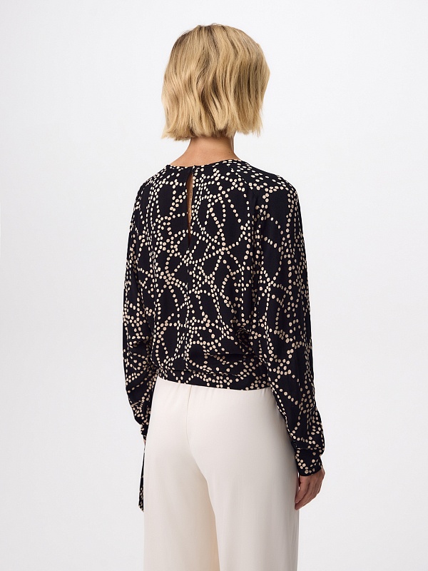 Свободная блуза в принте с черно-белым горохом. Горловина круглая, сзади разрез-капля на пуговице. Рукав-реглан заужен книзу. По талии притачной пояс с хвостами по боку, образующими узел.