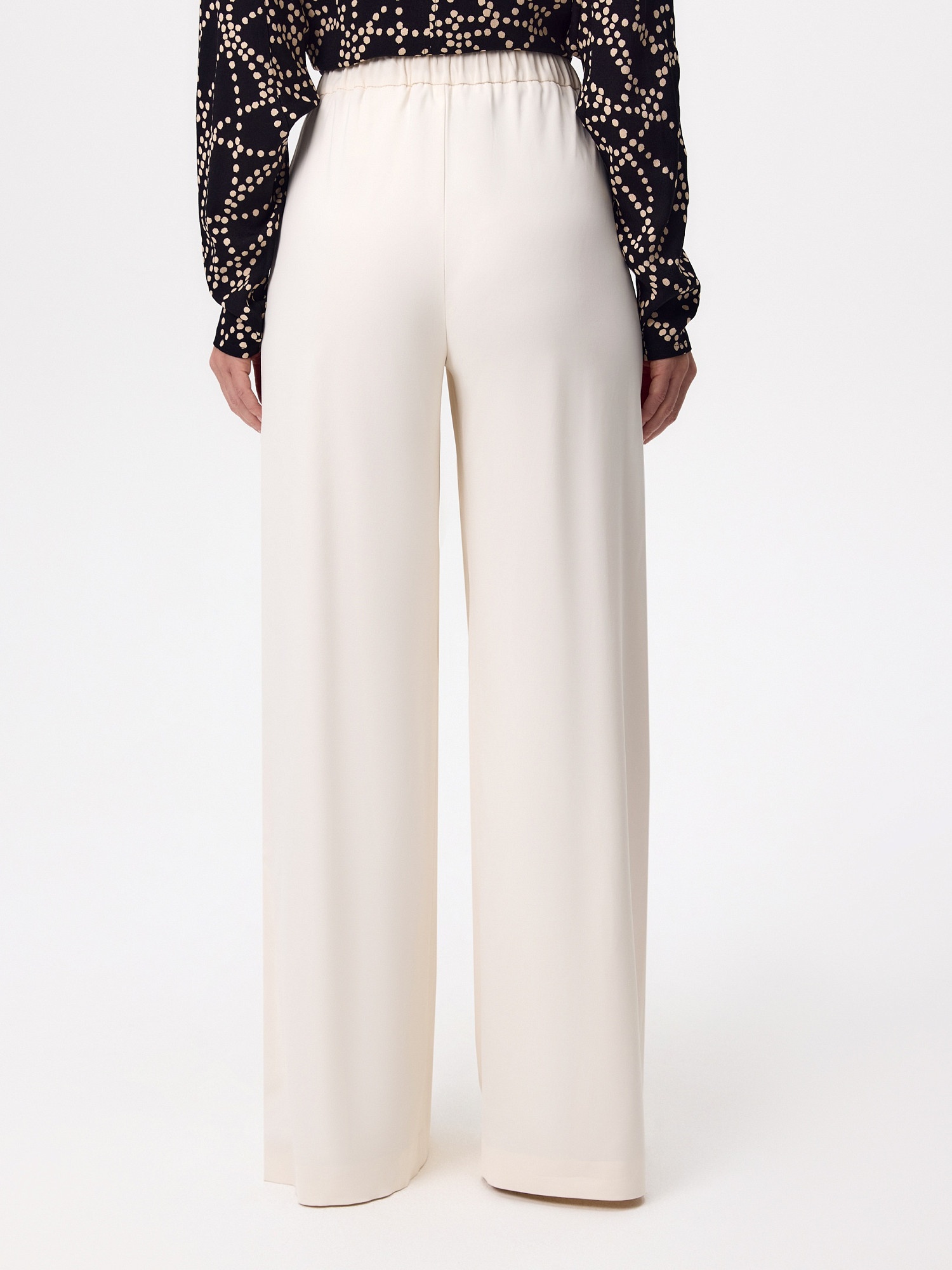 Широкие удлиненные брюки с глубокими складками на поясе с резинкой на спинке. Имеются функциональные боковые карманы.
