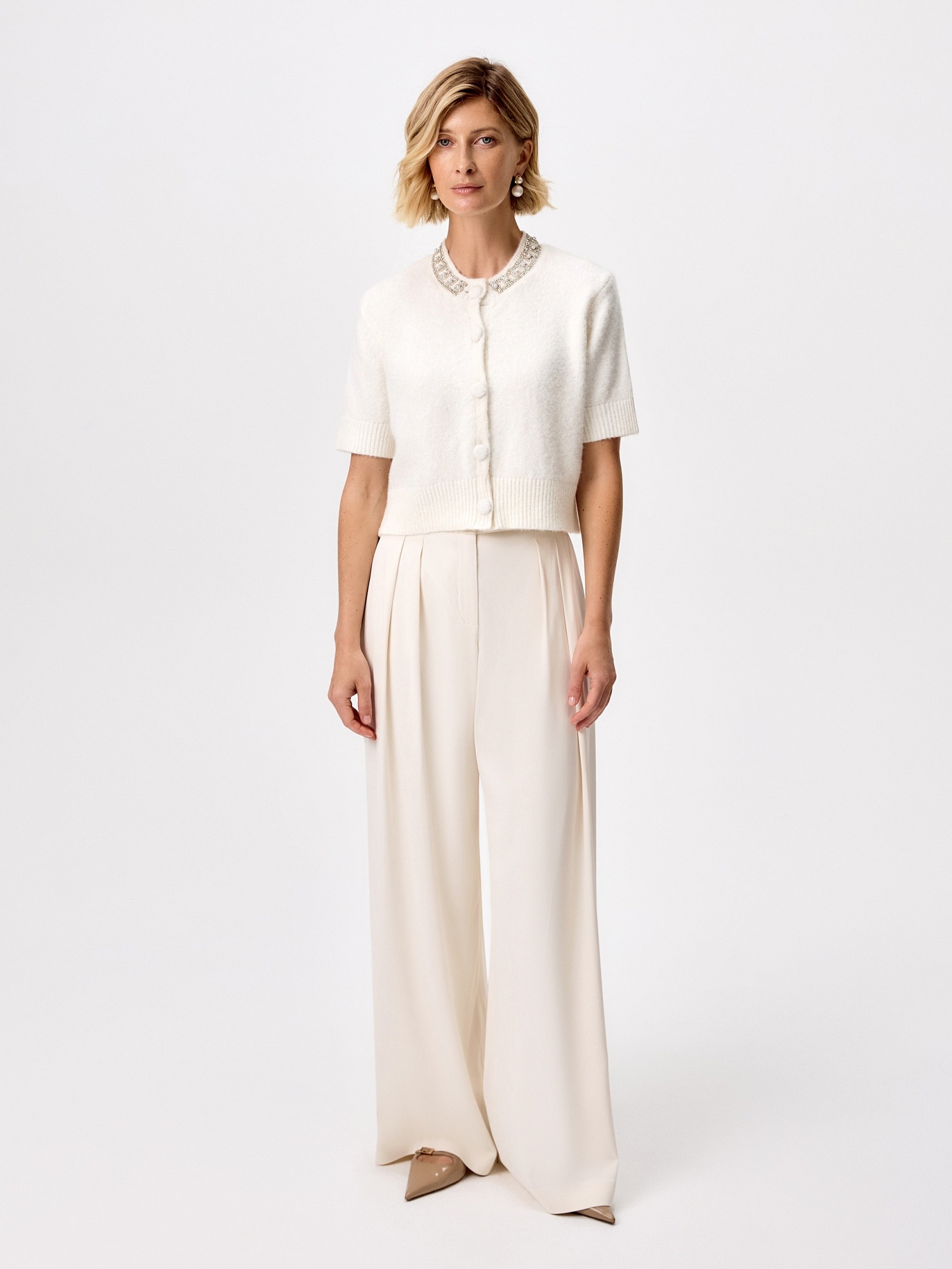Пушистый и мягкий укороченный кардиган с роскошными стразами и жемчужинами по горловине. Горловина кардигана круглая, застежка спереди на пуговицы, рукав втачной короткий с узкой манжетой. По низу кардигана резинка.