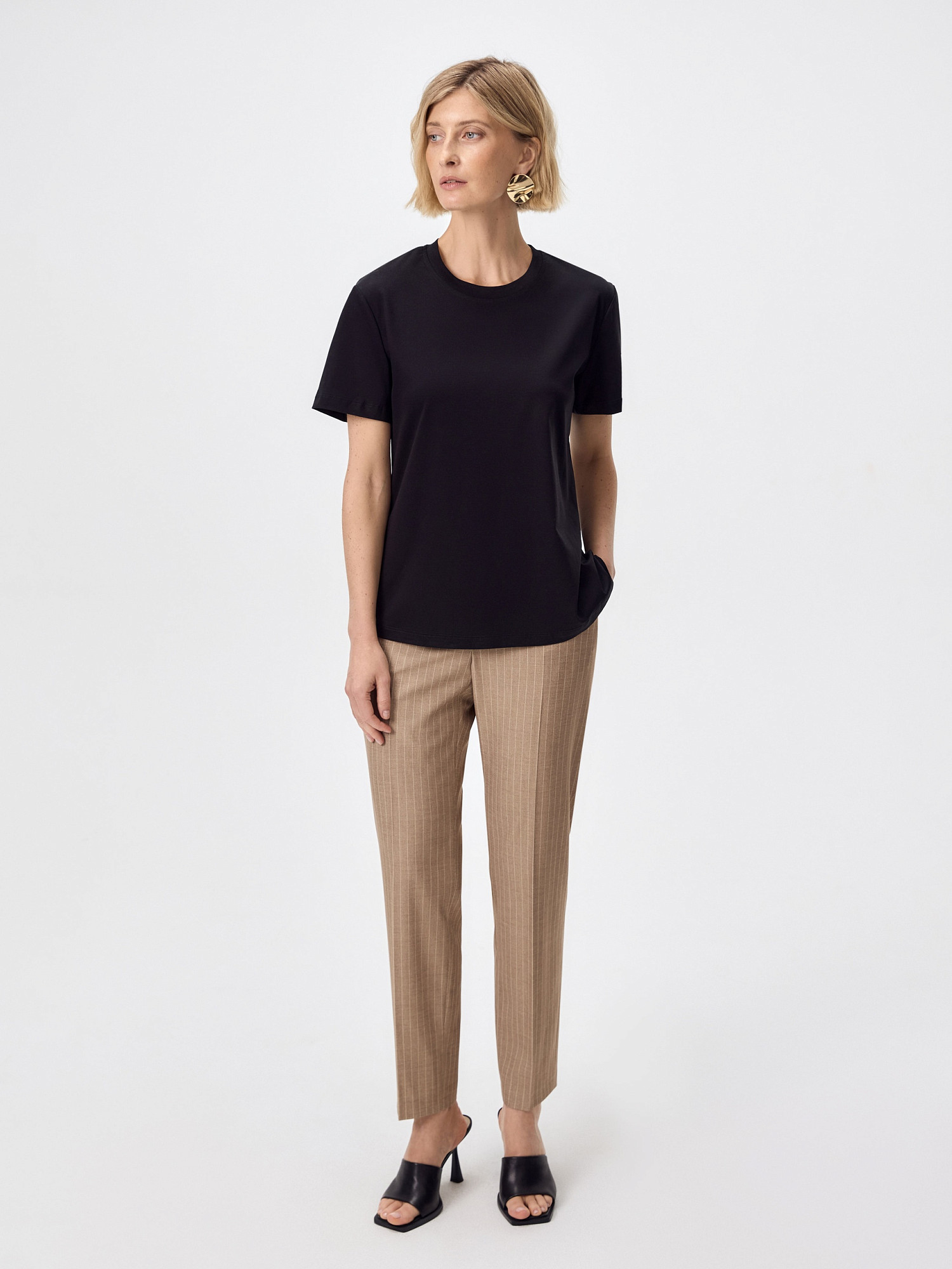 Футболка прямого силуэта в черном цвете будет прекрасно сочетаться как с джинсовыми изделиями, так и с классическими ансамблями. Мерсеризованный хлопок имеет шелковистый блеск и не деформируется после стирок, практически не мнется и не выцветает со временем. Благодаря мерсеризации данная футболка имеет: - повышенную прочность и гигроскопичность - особенный блеск и гладкость - однородность волокон нити и высокое качество ткани.