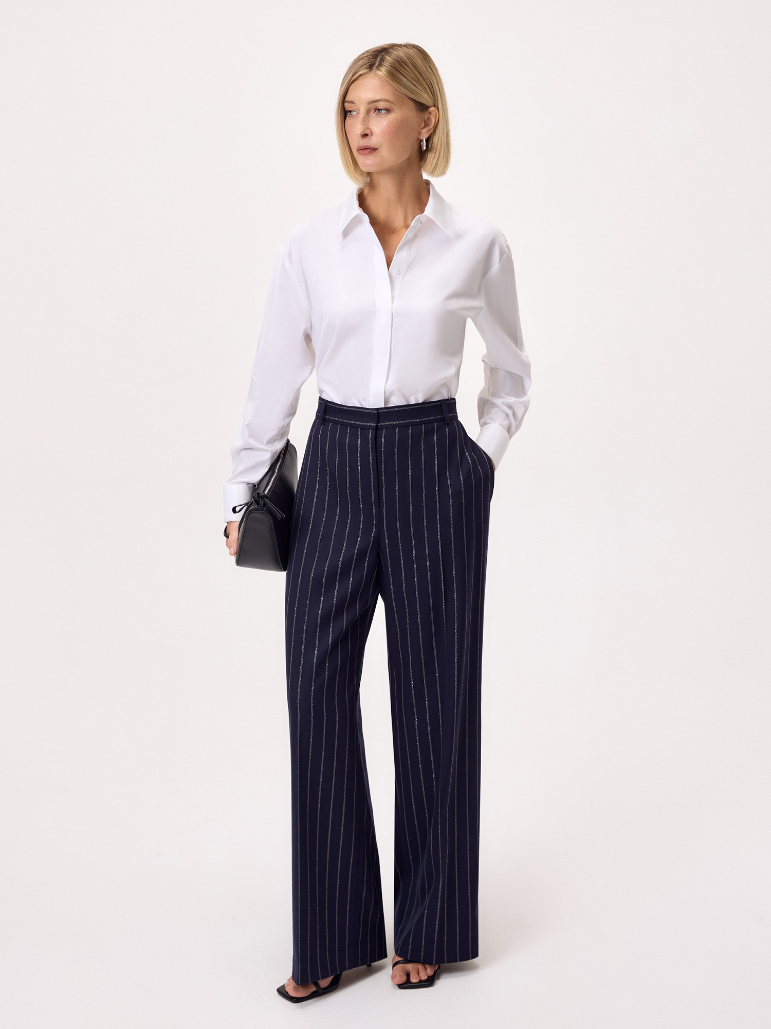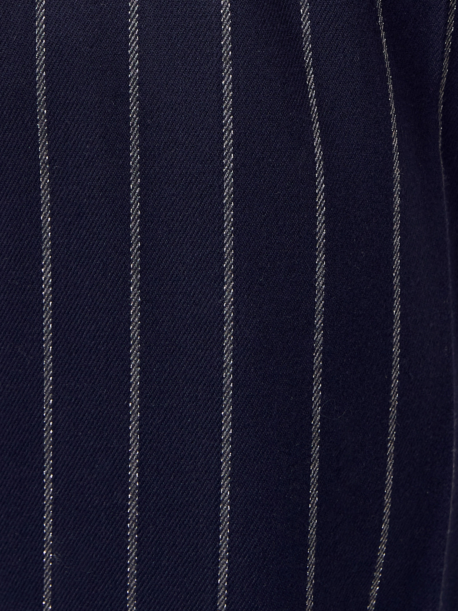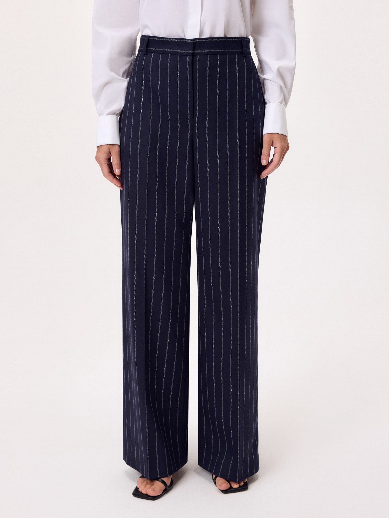 Прямые брюки свободного силуэта из костюмной вискозной ткани темно-синего цвета с полоской серебряного люрекса. Имеют два функциональных кармана по бокам и два прорезных кармана сзади. Брюки идеально сочетаются с жакетом из одной ткани.