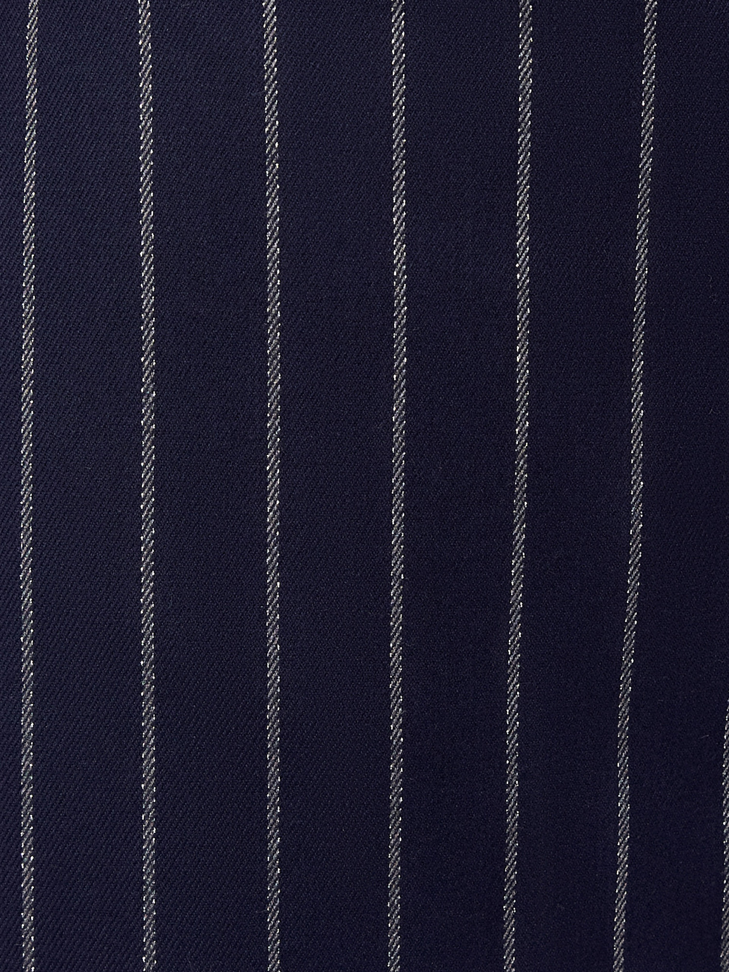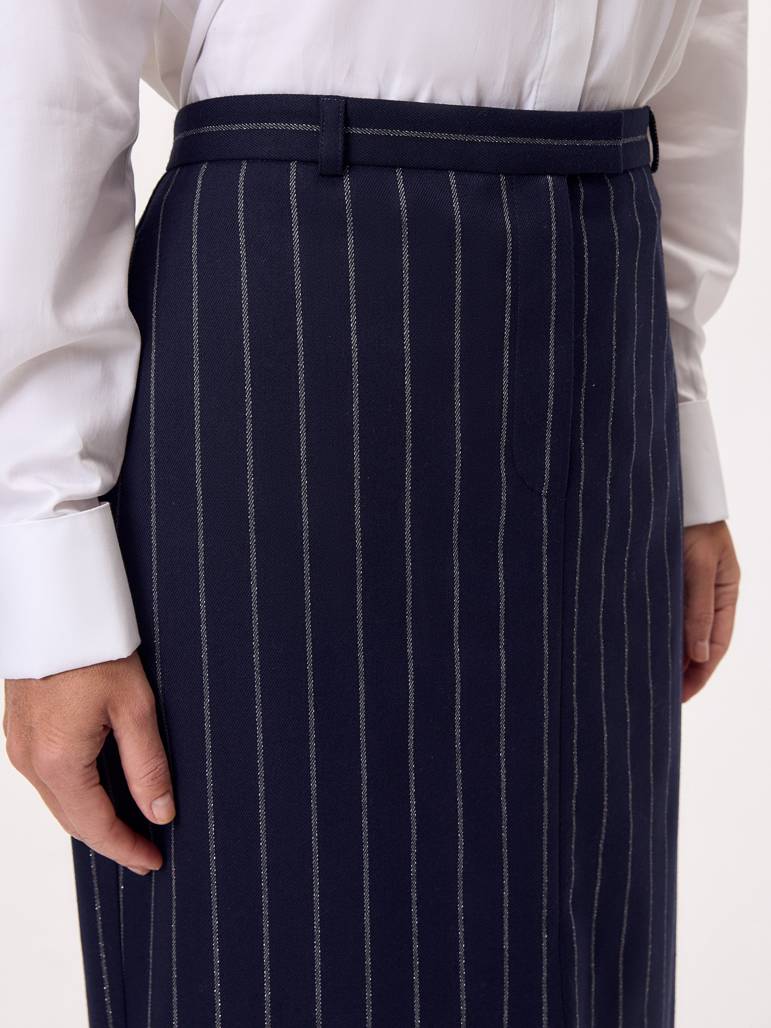 Юбка-миди зауженная к низу, из костюмной вискозной ткани темно-синего цвета с полоской серебряного люрекса, с застежкой на молнию с гульфиком, на притачном поясе со шлевками, с карманами в боковых швах и разрезом по центру переда.