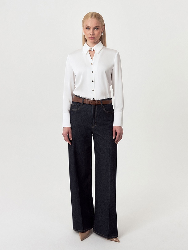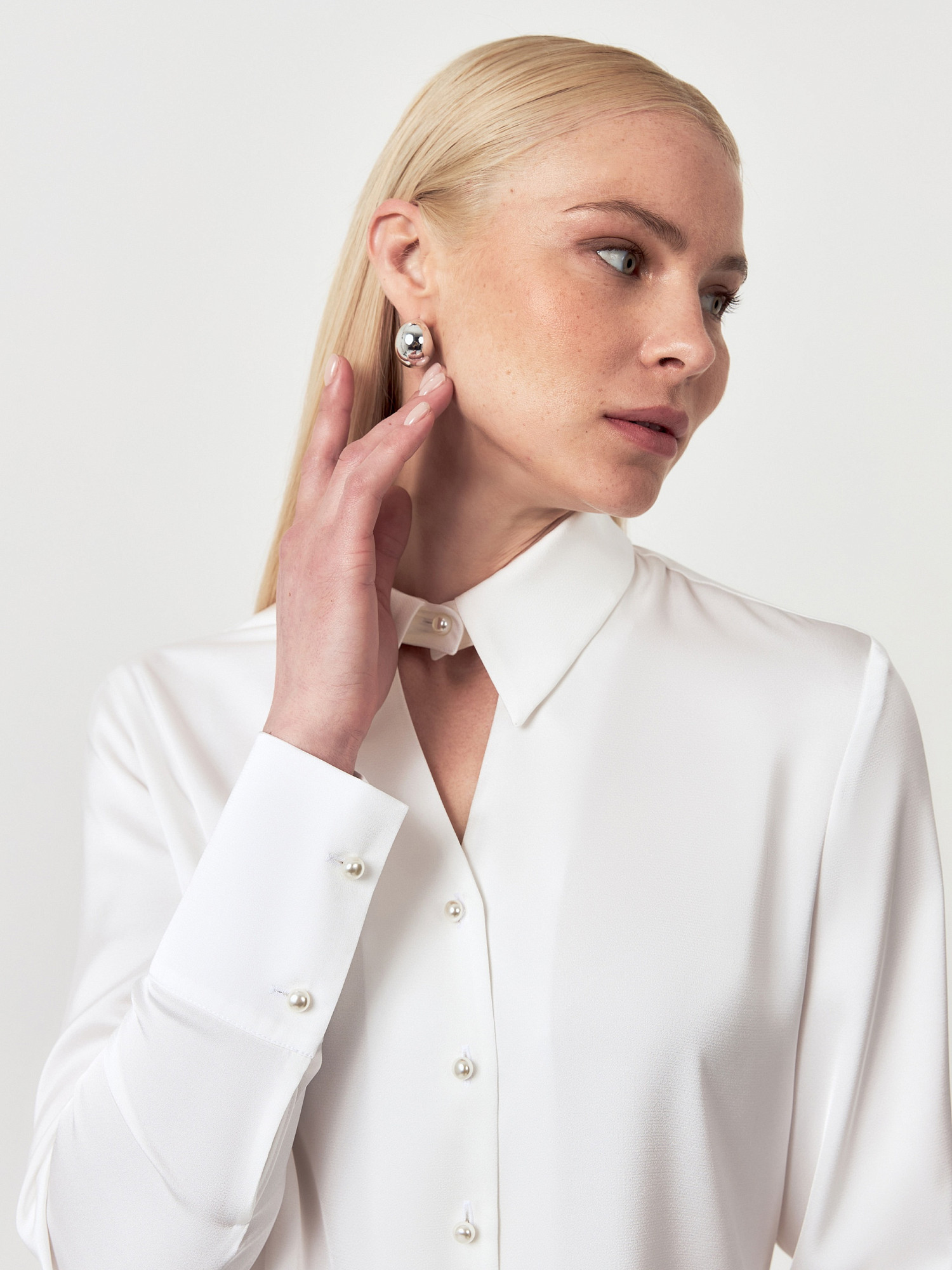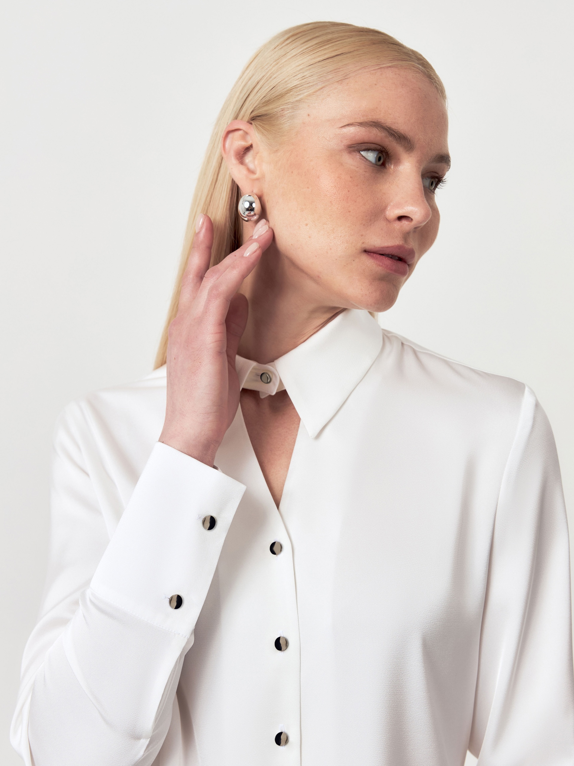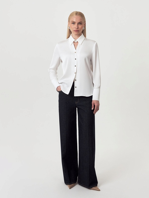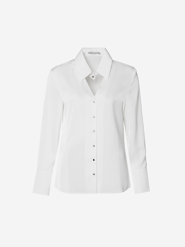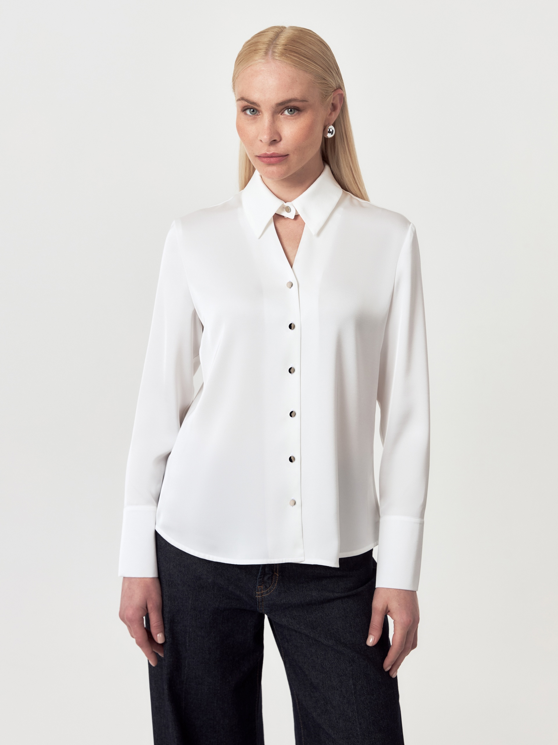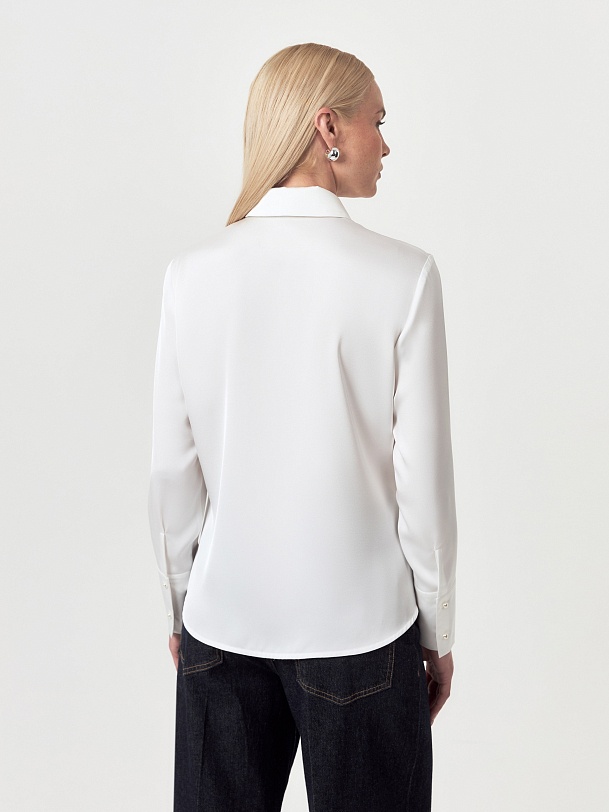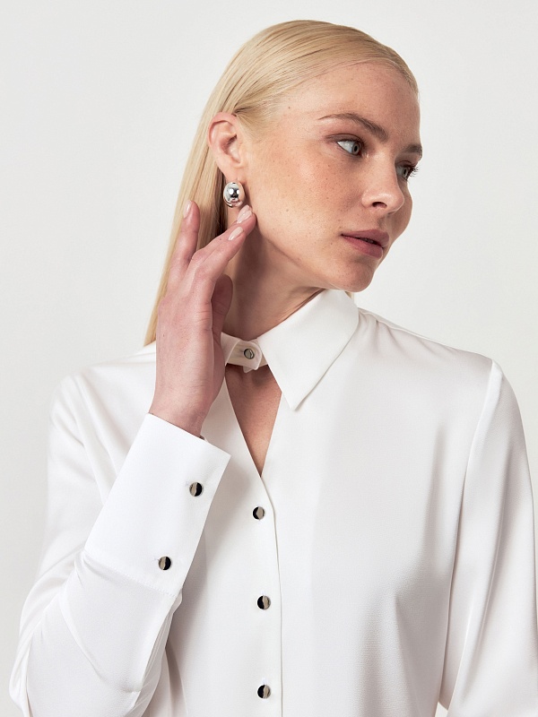 Блуза из атласа белого цвета с оригинальным дизайном застежки на горловине. Отложной воротник на стойке с заостренными концами и V-образным вырезом. Рукав классической формы с манжетом. Все пуговицы на блузе металлические. Блуза идеально сочетается с жакетом из темно-синей костюмной ткани с люрексовой полоской.