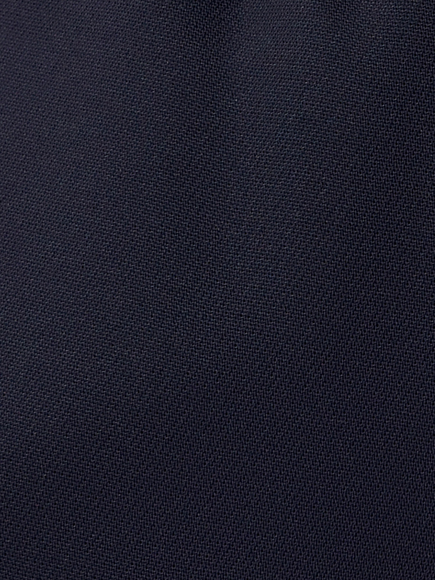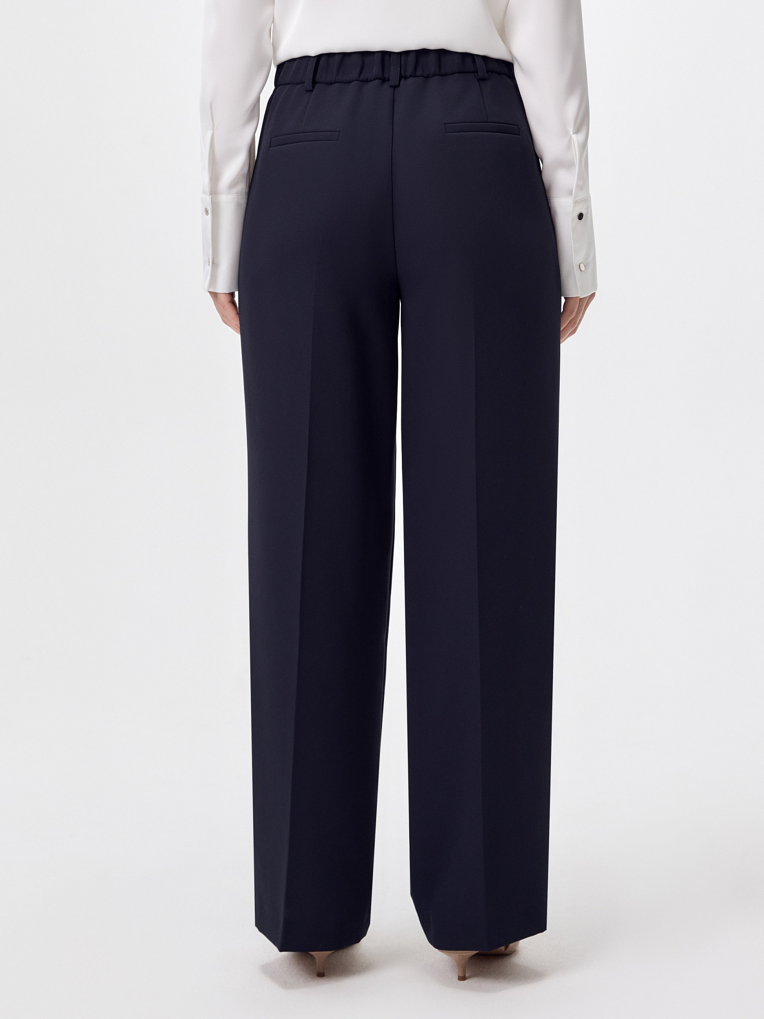 Прямые брюки со стрелками из струящейся ткани костюмной ткани темно-синего цвета с широким поясом на резинке, в пояс вставлена кулиса для регулировки посадки. Имеют два функциональных кармана по бокам и два прорезных кармана сзади.