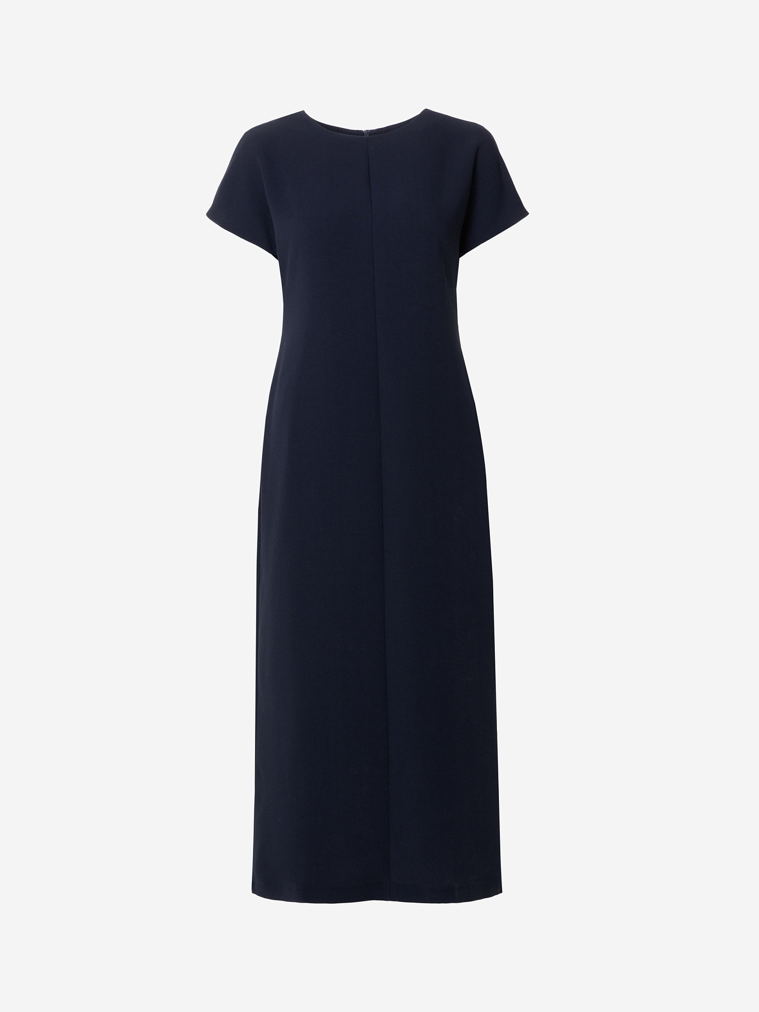 Полуприлегающее платье-миди из струящейся ткани темно-синего цвета с круглым вырезом горловины и спущенной линией проймы, прикрывающей плечо. Юбка платья имеет небольшое расклешение к низу. На спинке разрез по низу.