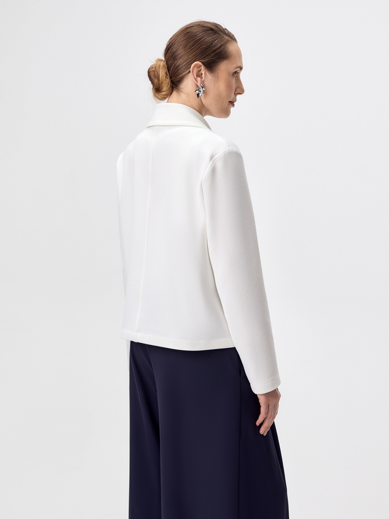 Полуприлегающий укороченный двубортный жакет из фактурной трикотажной ткани белого цвета. С классическим воротником и лацканами с отстрочками. Застежка на пуговицы, на полочках есть прорезные карманы-листочки. Жакет без подкладки.