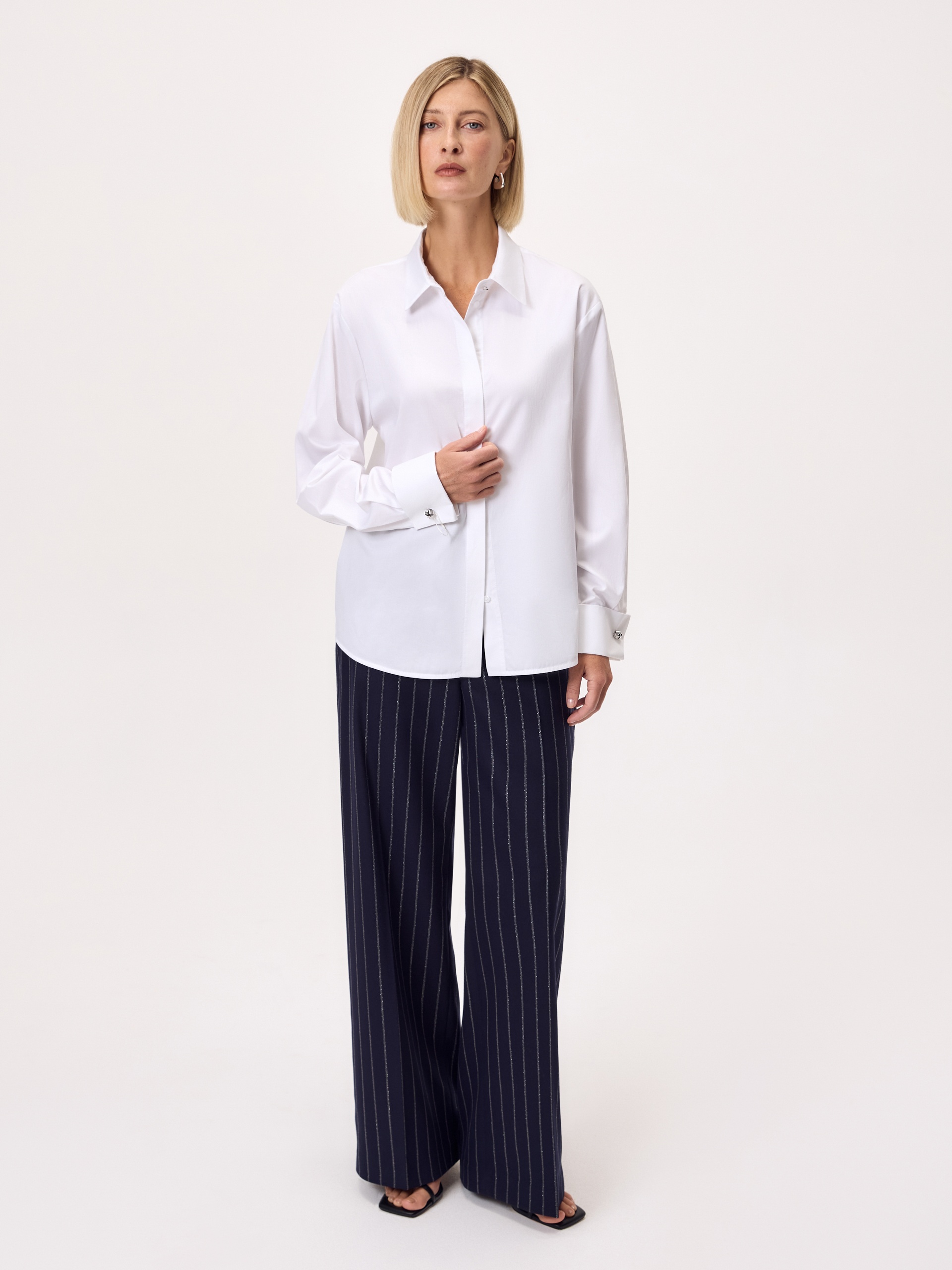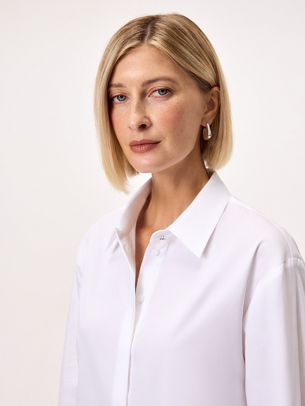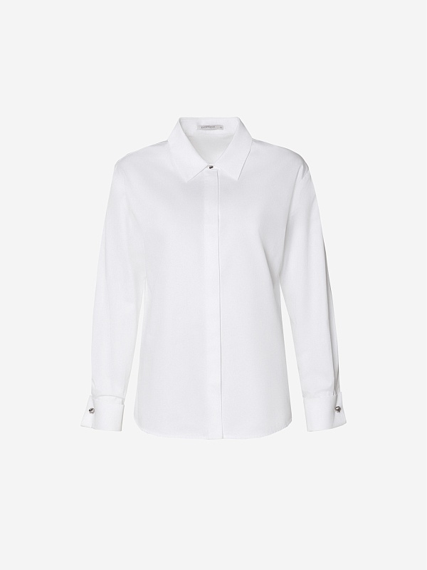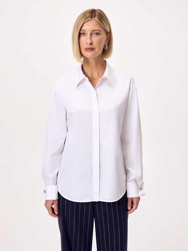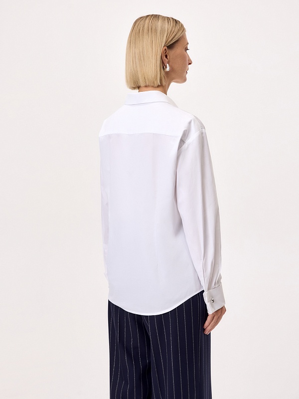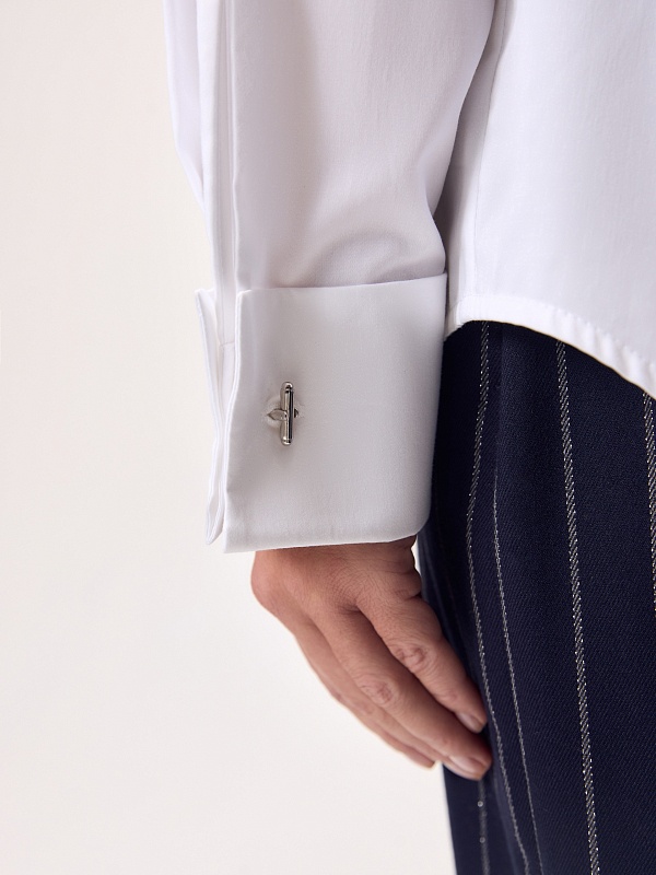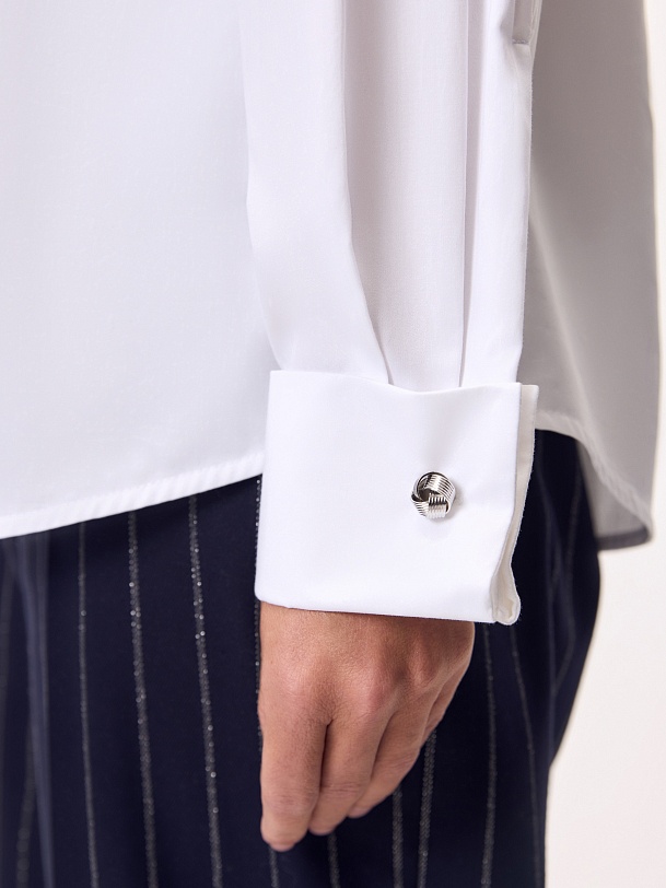 Блуза полуприлегающего силуэта из белого сатинового хлопка с потайной планкой, классическим отложным воротником, втачным рукавом со спущенной линией плеча, с запонками в виде морских узлов на манжете и акцентной пуговицей на стойке воротника.