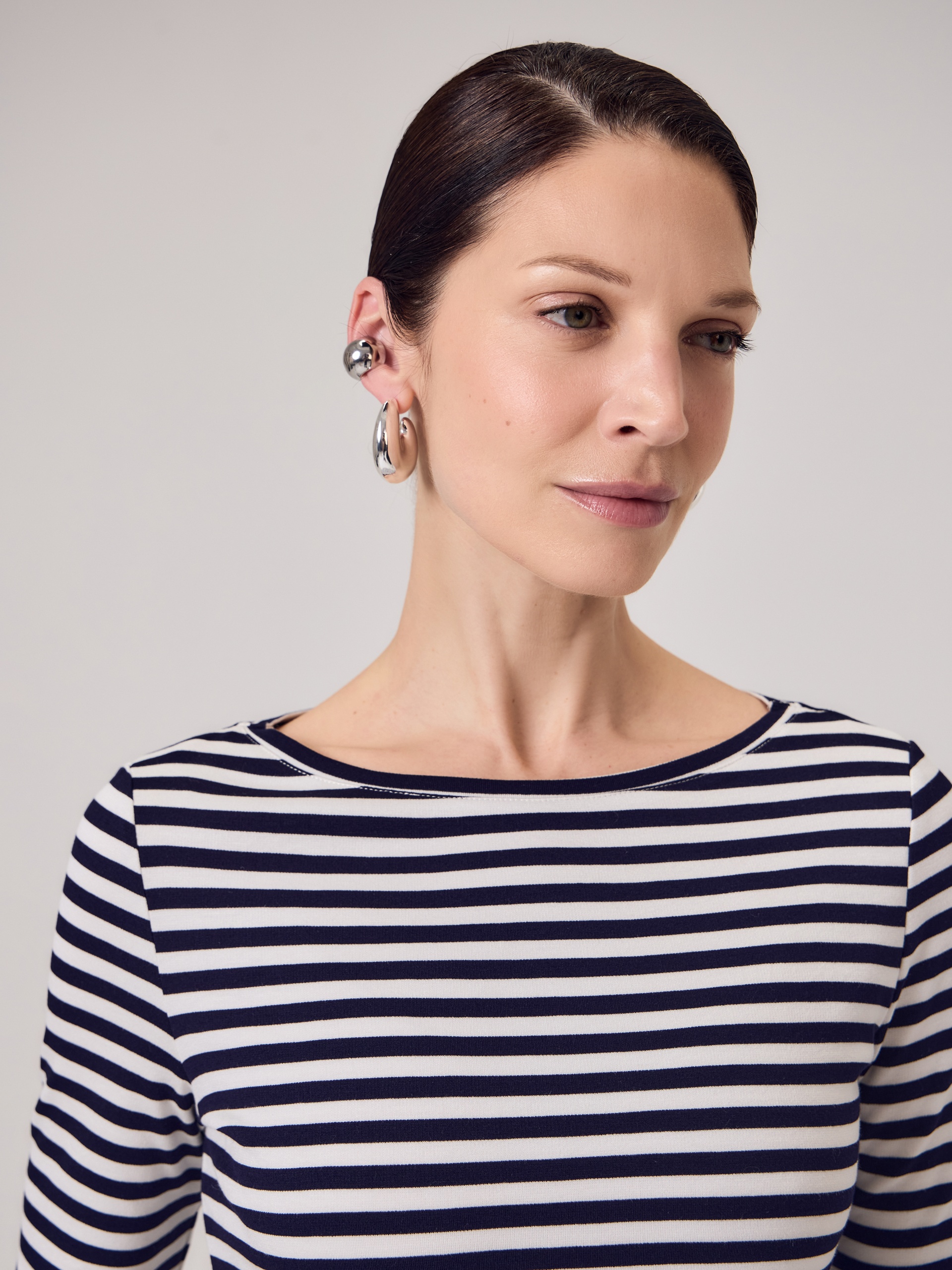 Трикотажная блуза в морском стиле полуприлегающего силуэта с горловиной лодочкой и втачным рукавом до локтя. Сформирует идеальную пару с брюками со складками и трикотажным жакетом белого цвета....