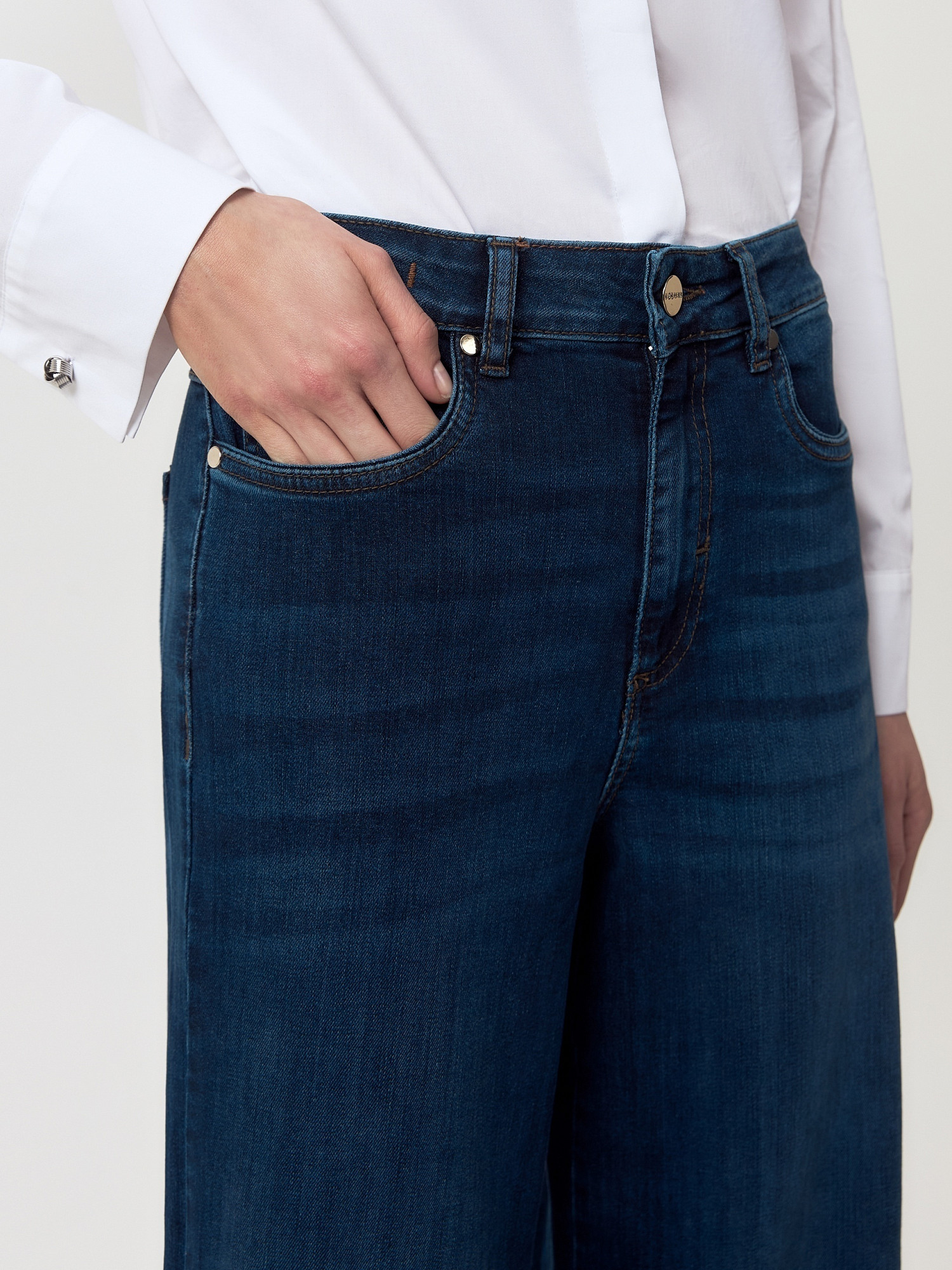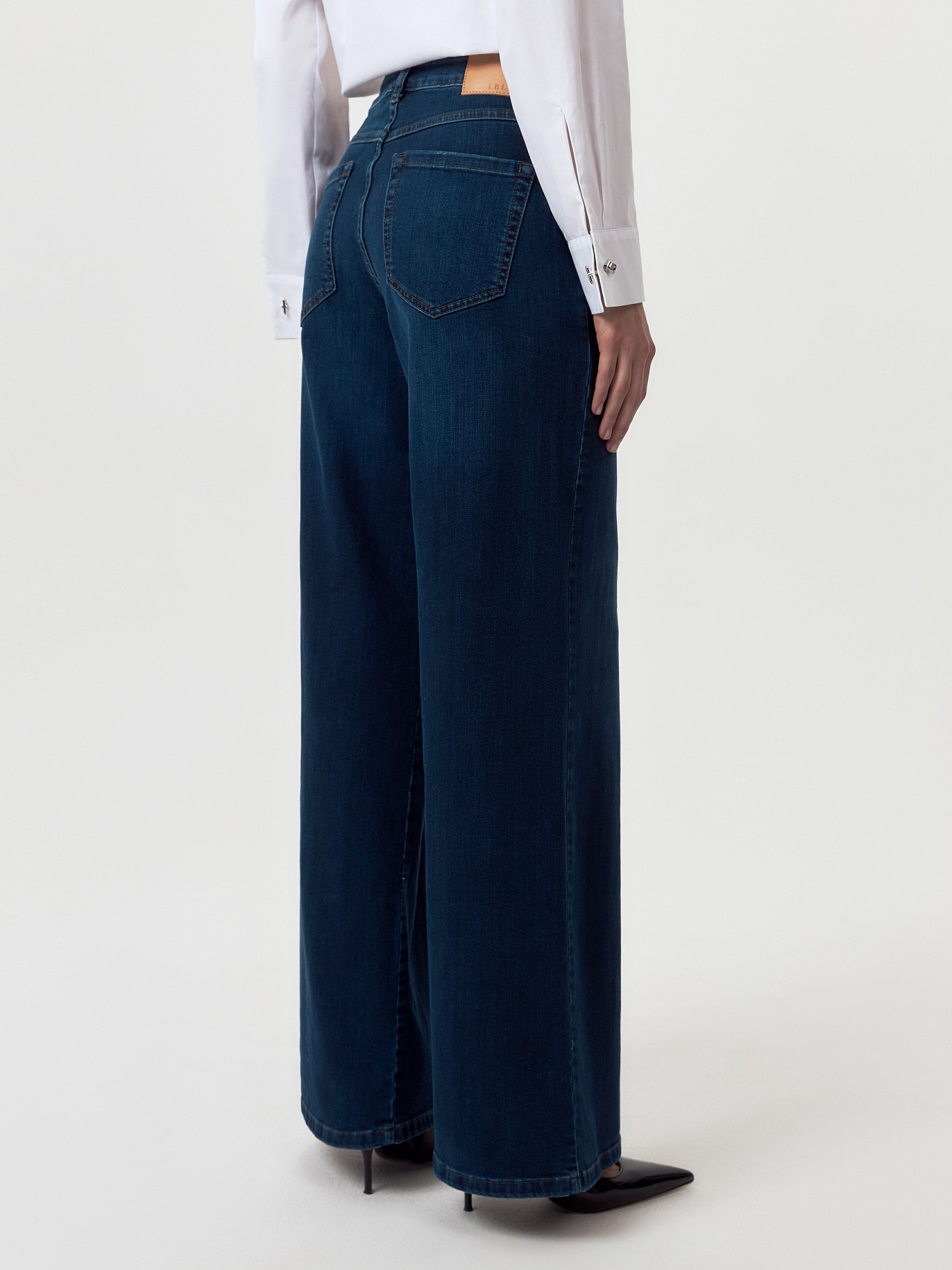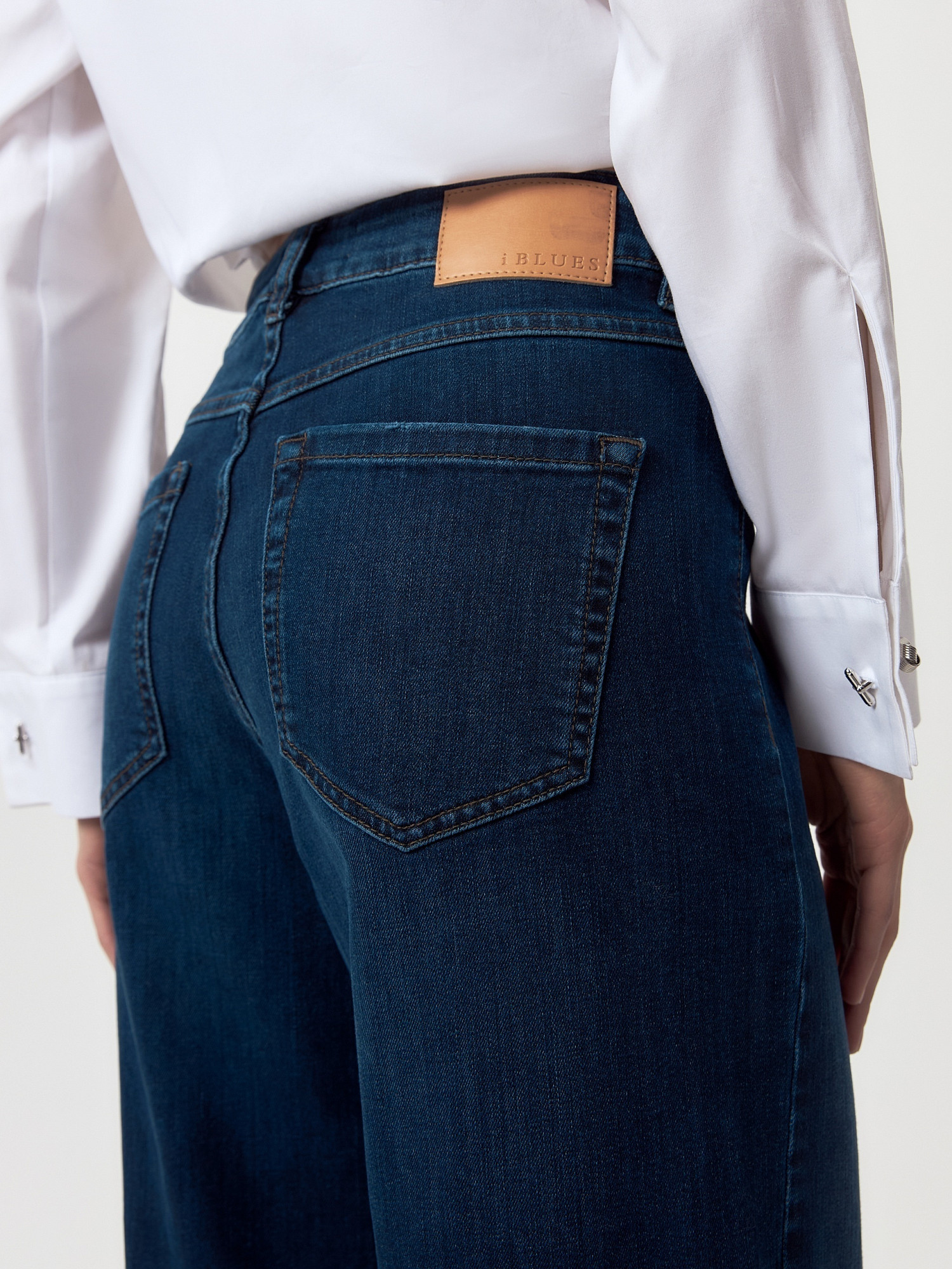 Прямые джинсы, немного расклешенные к низу, на средней посадке, с классической застежкой-молнией и пуговицей. По бокам рабочие карманы, на спинке накладные. Джинсы выполнены в классическом темно-синем цвете без сильных потертостей.