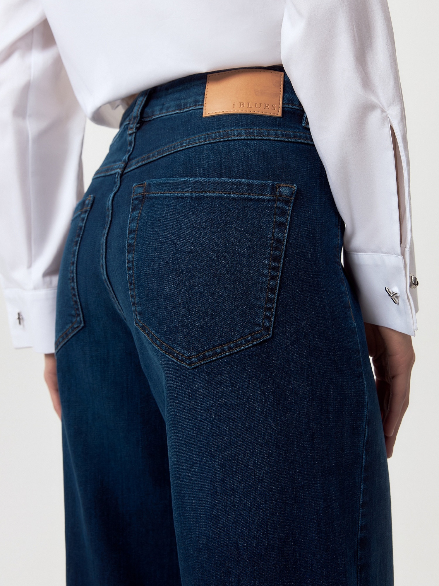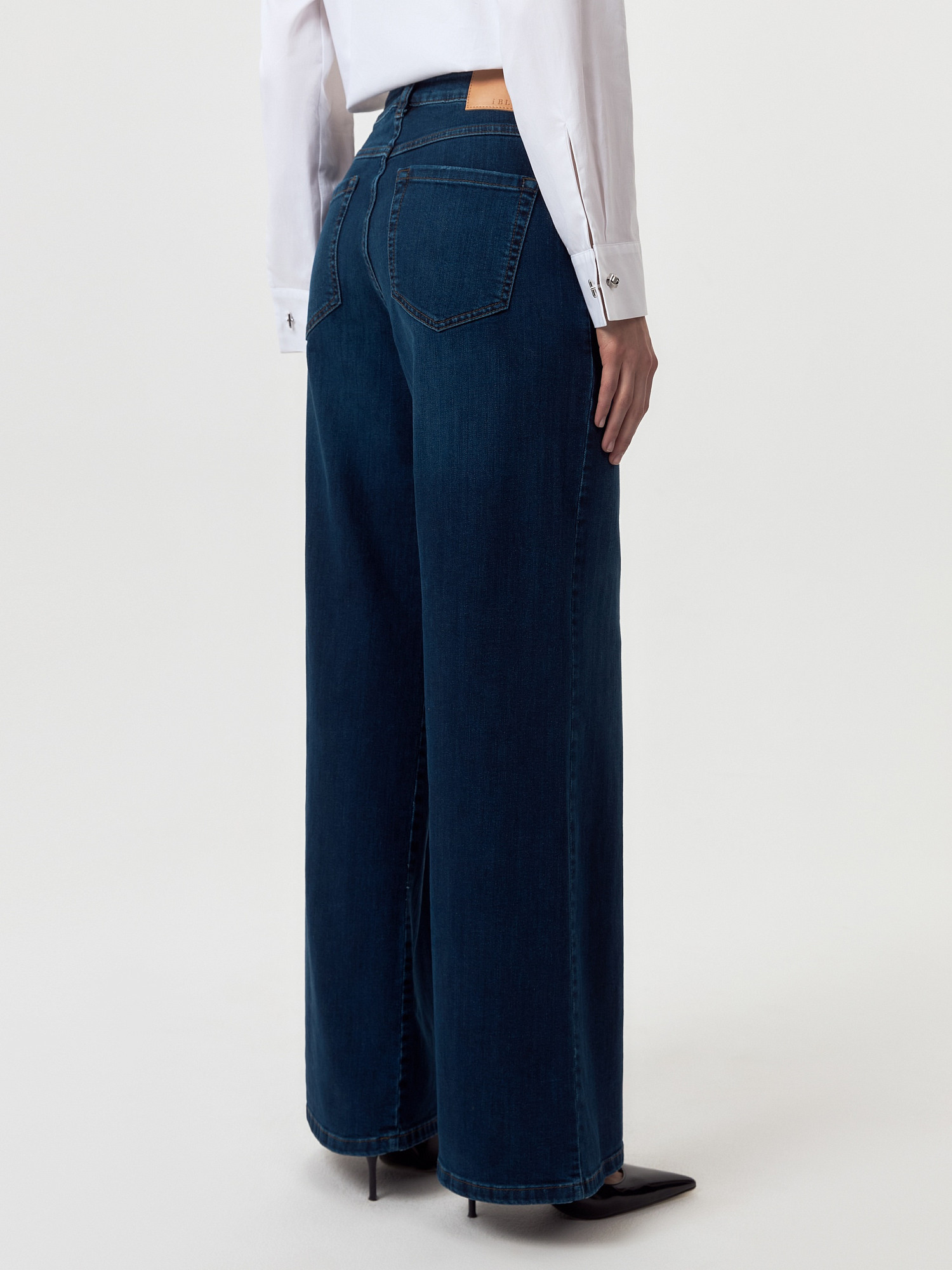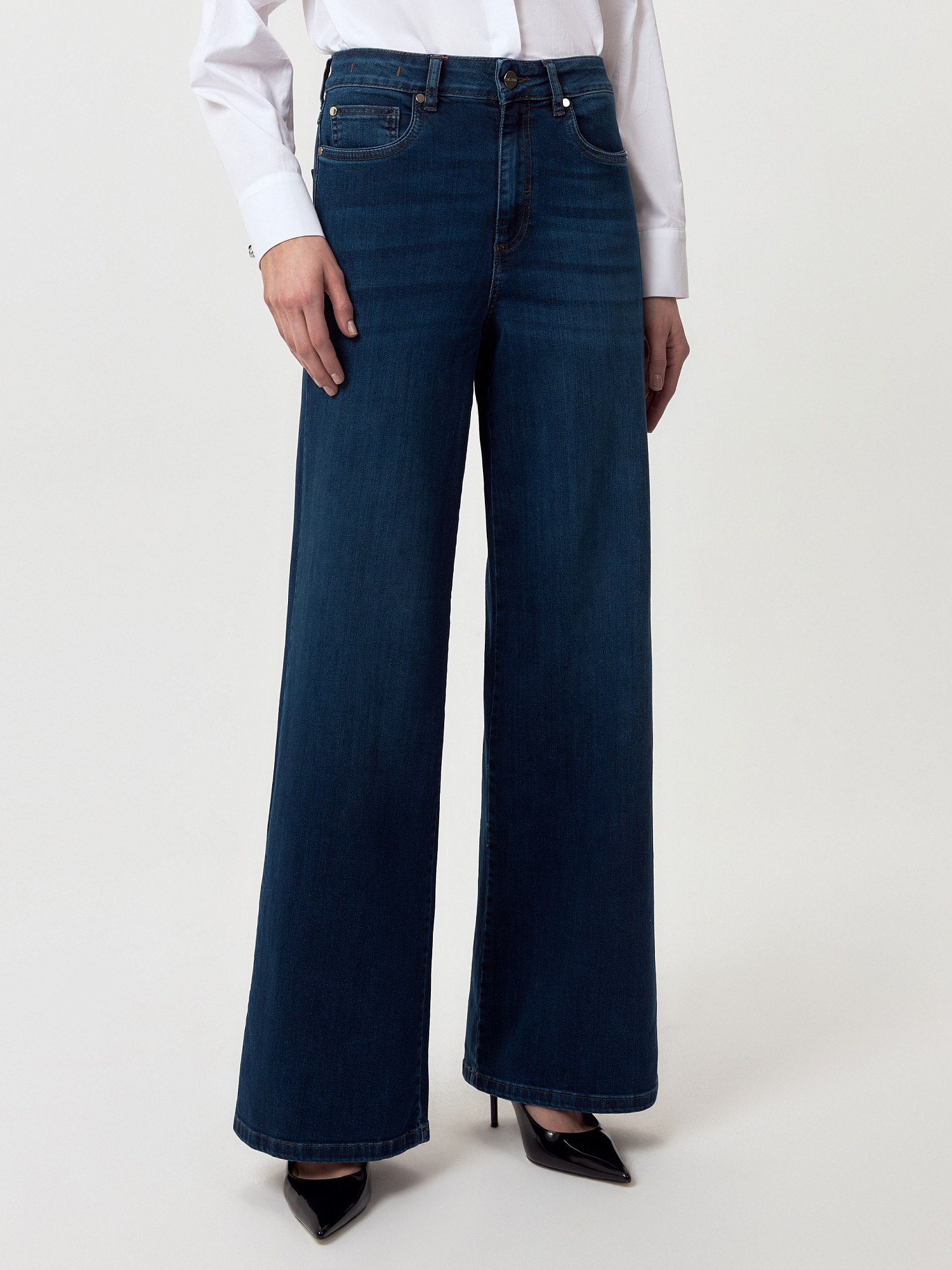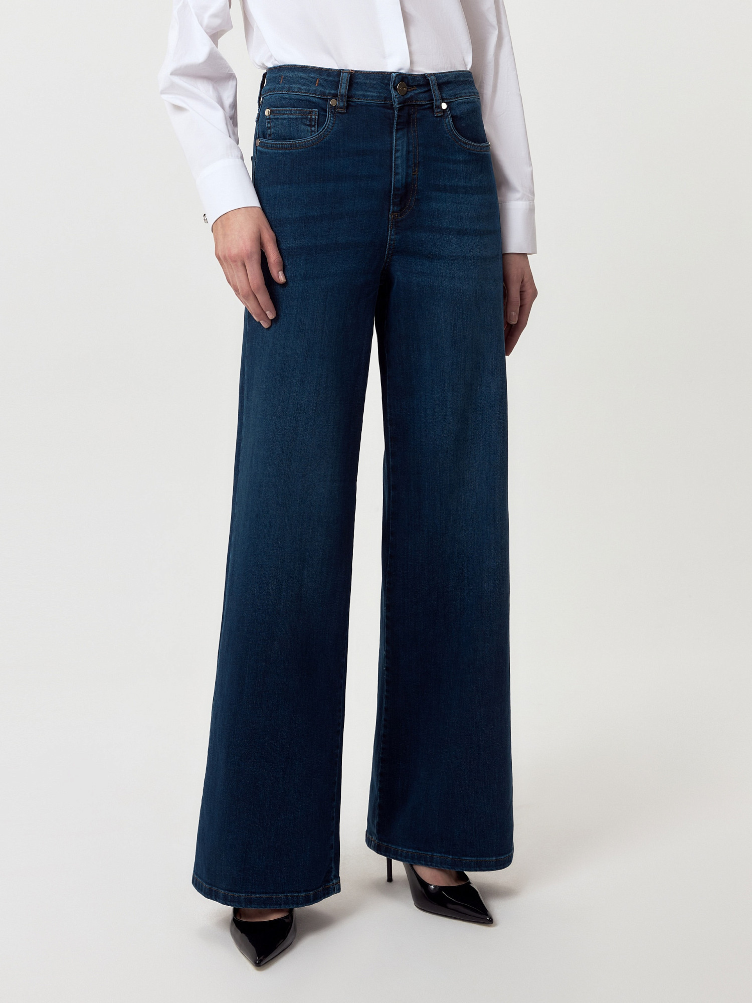 Прямые джинсы, немного расклешенные к низу, на средней посадке, с классической застежкой-молнией и пуговицей. По бокам рабочие карманы, на спинке накладные. Джинсы выполнены в классическом темно-синем цвете без сильных потертостей.