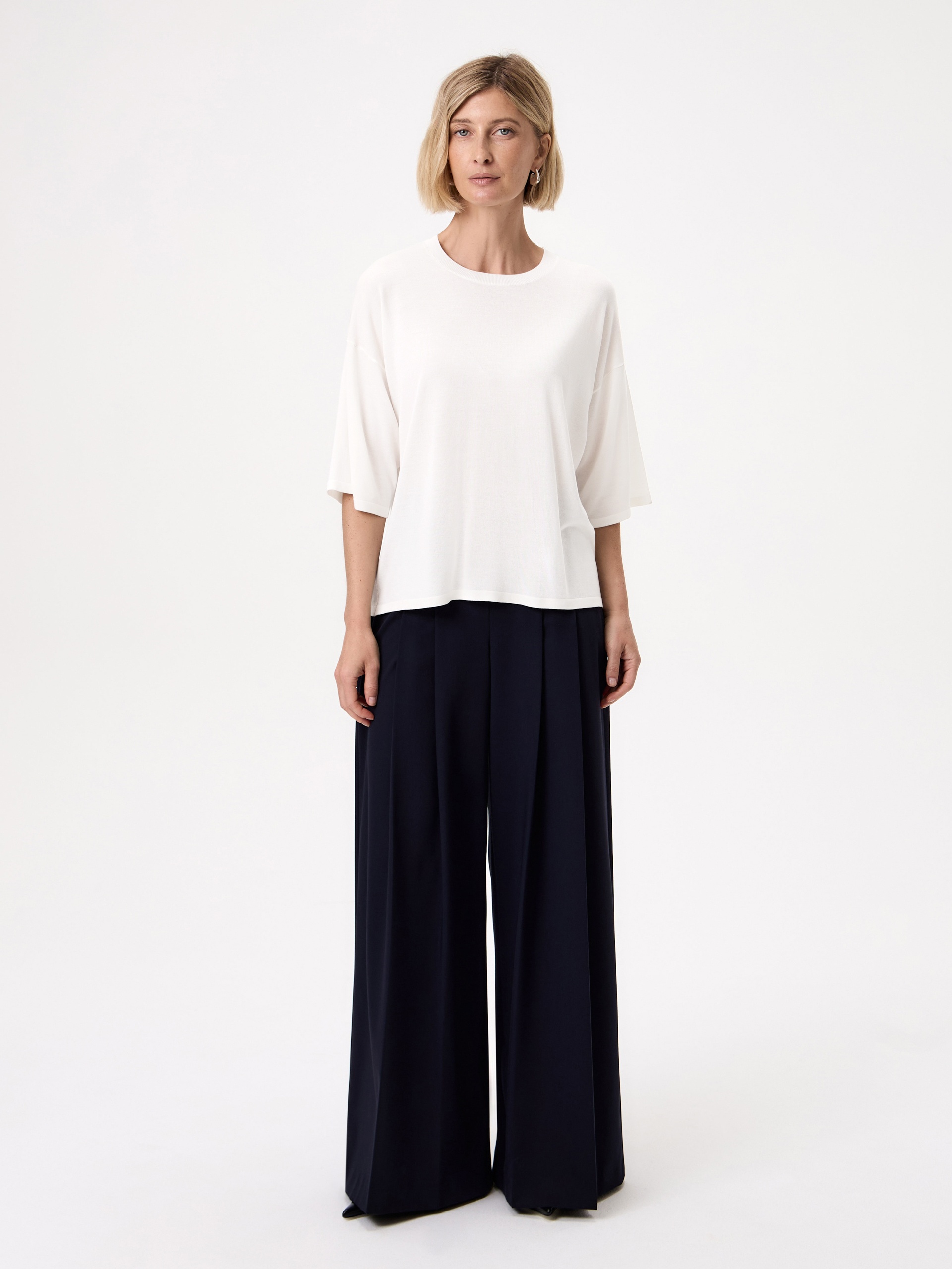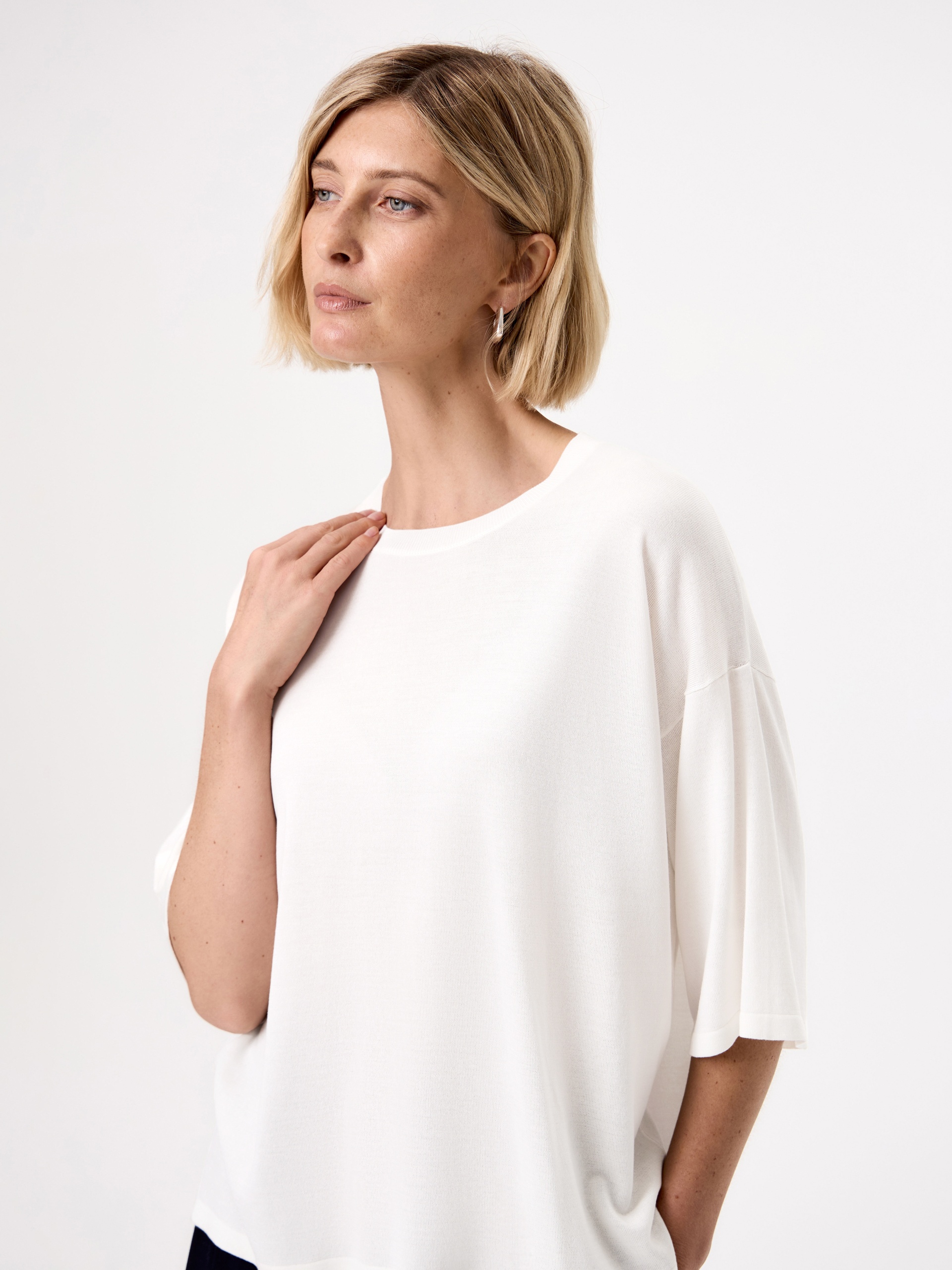 Лаконичный джемпер из тонкой и легкой пряжи с добавлением шелка, комфортно облегает силуэт, деликатно поблескивая в движении. Натуральный шелк в составе пряжи приятно холодит кожу, а тенсель придает трикотажу стабильность. Комфортный свободный силуэт, рукав до линии локтя и минималистичный дизайн позволят этому джемперу стать идеальной базой на весну.