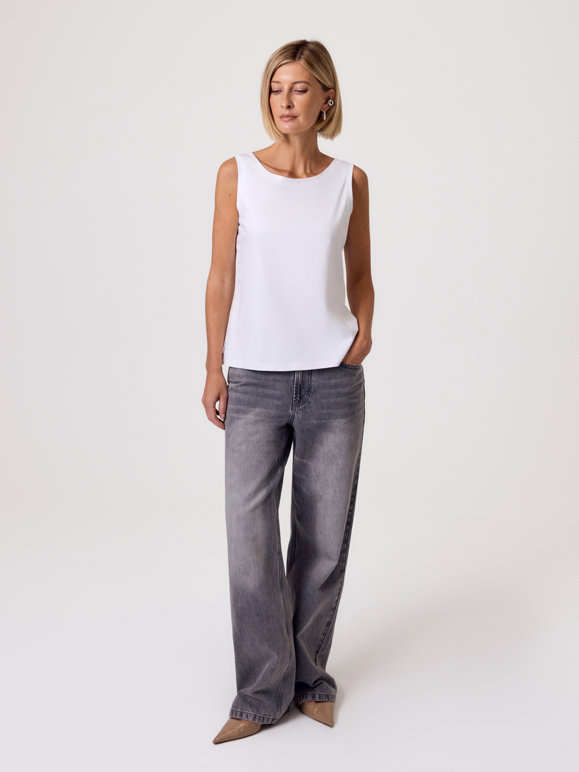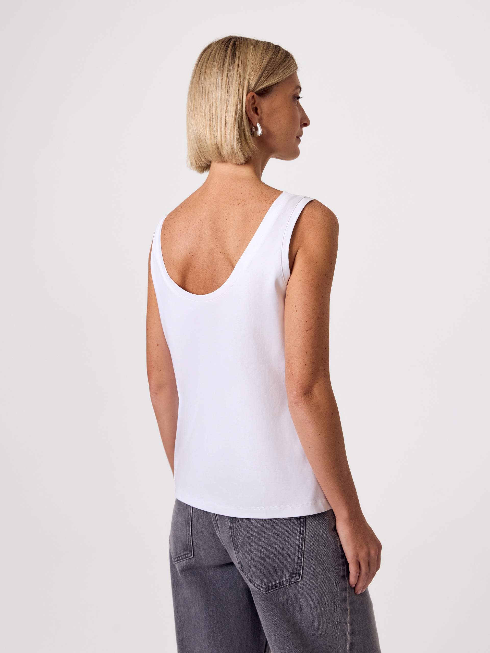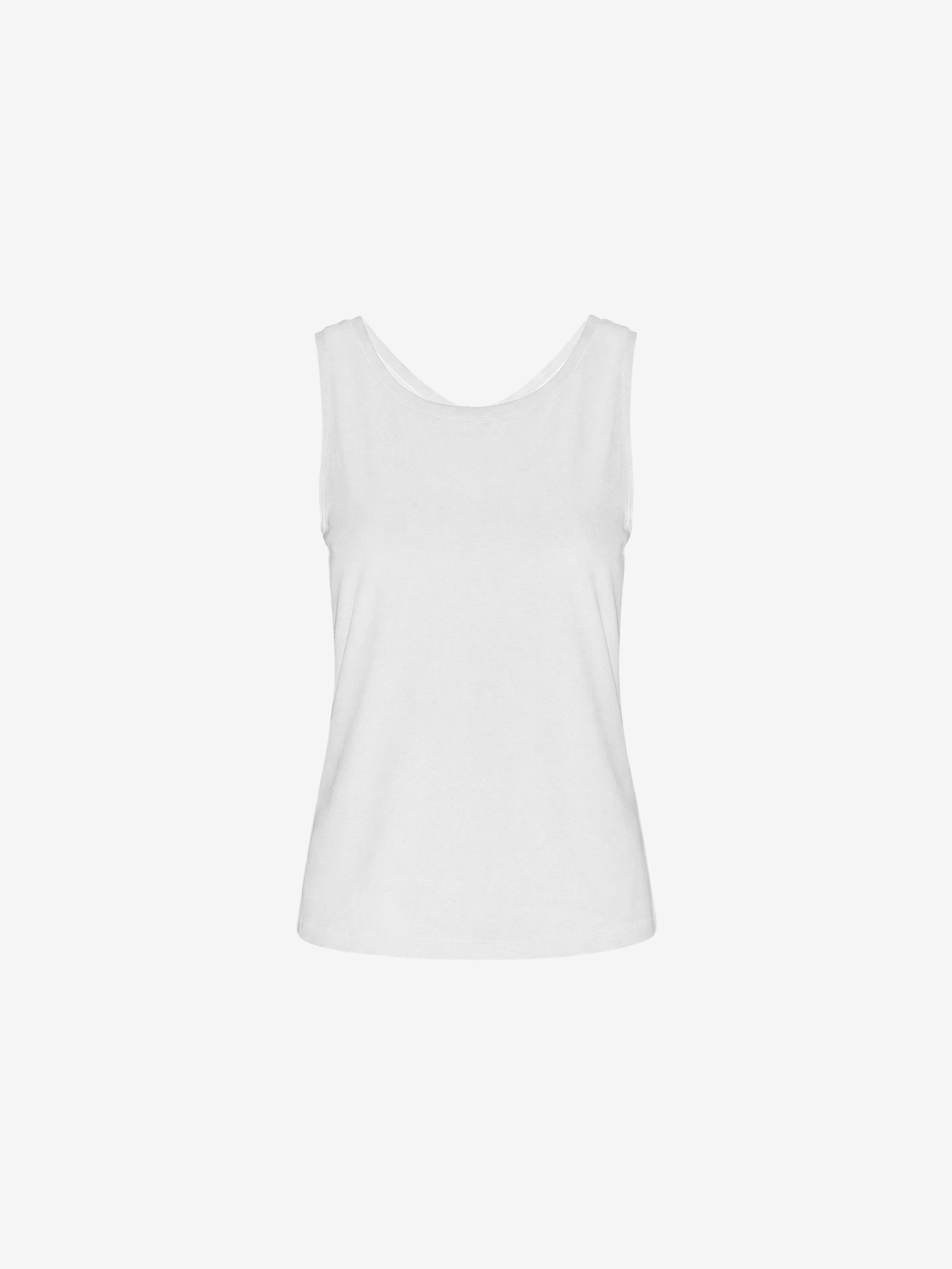 Идеальная белая майка - из тех вещей, без которых не обходится ни один базовый гардероб. Оптимальная длина позволяет носить майку как заправленной, так и на выпуск.
