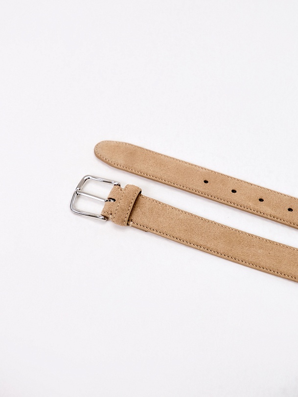 Универсальный ремень из гладкой натуральной замши в нейтрально бежевом цвете. Края ремня прострочены, что делает его более долговечным. Ремень застегивается на минималистичную металлическую пряжку. Ремень представлен в трех размерах: S - 100см, M - 106см, L - 112см.