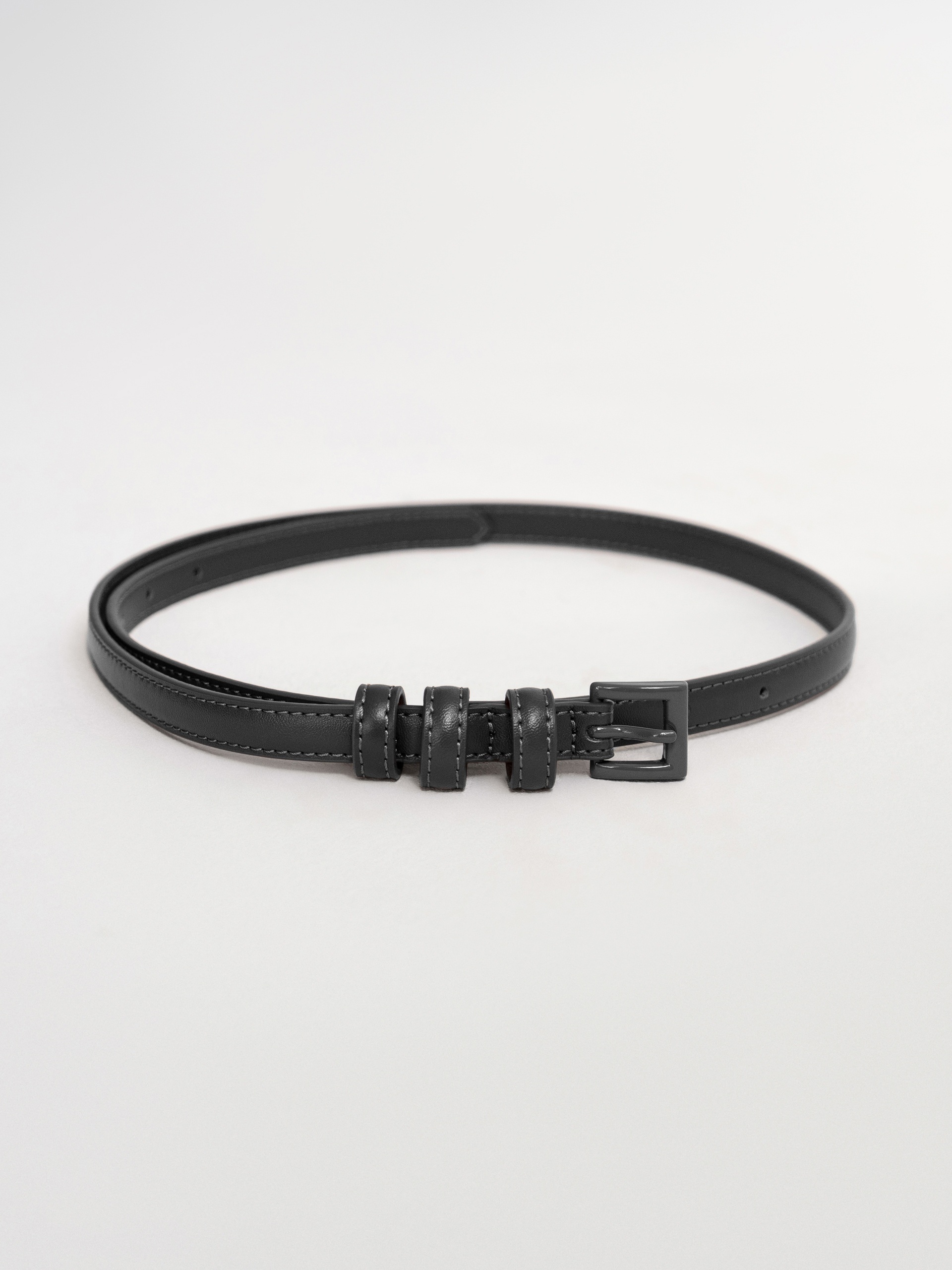 Универсальный тонкий ремень из гладкой натуральной кожи в классическом черном цвете. Края ремня прострочены, что делает его более долговечным. Ремень застегивается на минималистичную пряжку в тон ремня. Длина ремня 88см.