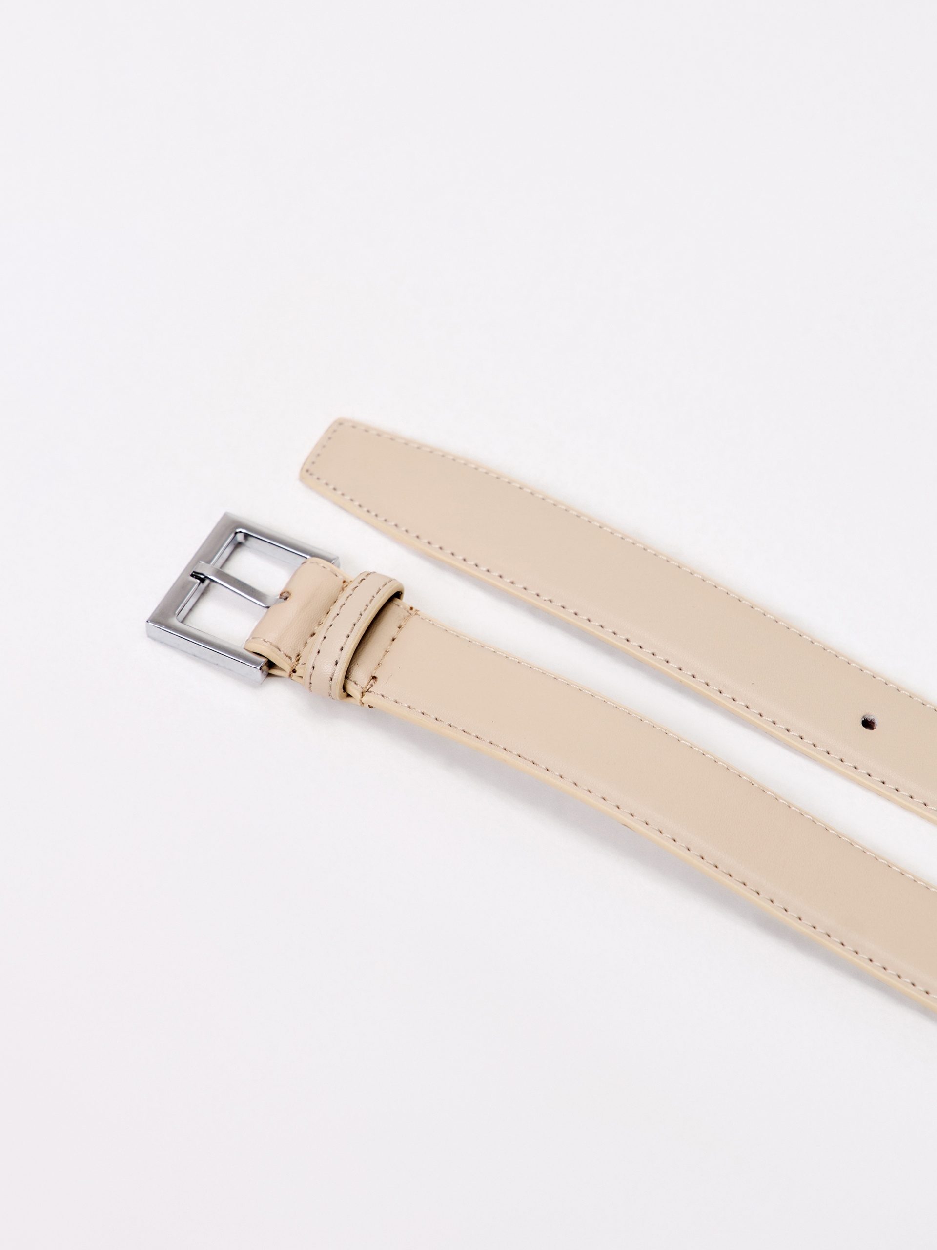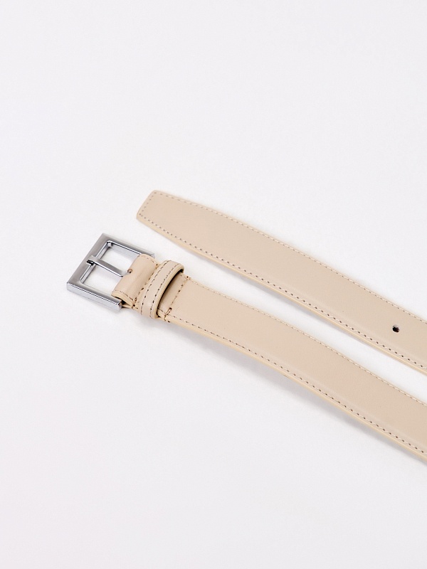 Универсальный ремень из гладкой натуральной кожи в молочном цвете. Края ремня прострочены, что делает его более долговечным. Ремень застегивается на минималистичную металлическую пряжку. Ремень представлен в трех размерах: S - 100см, M - 106см, L - 112см.