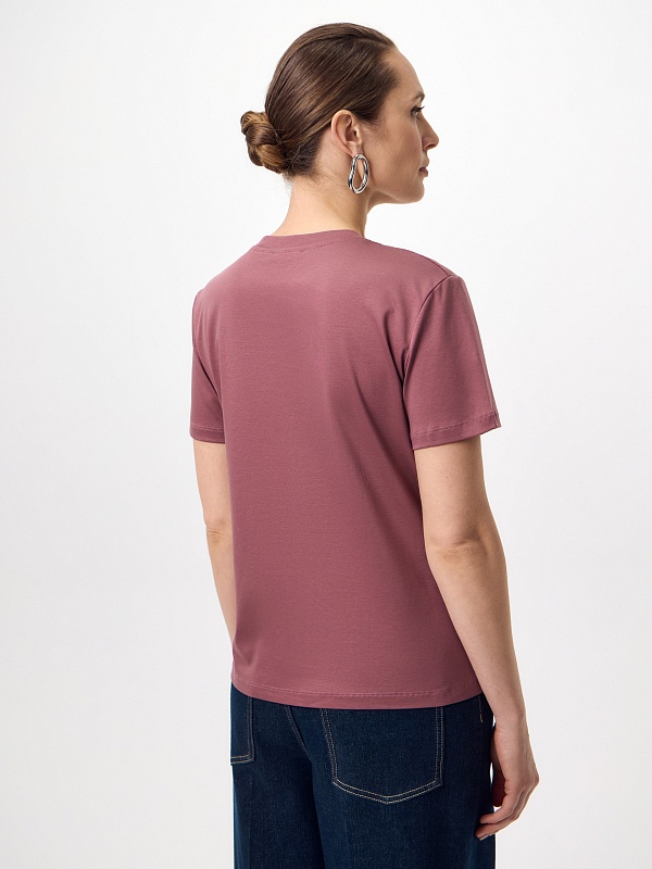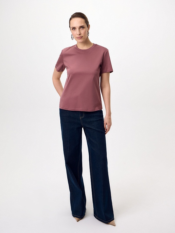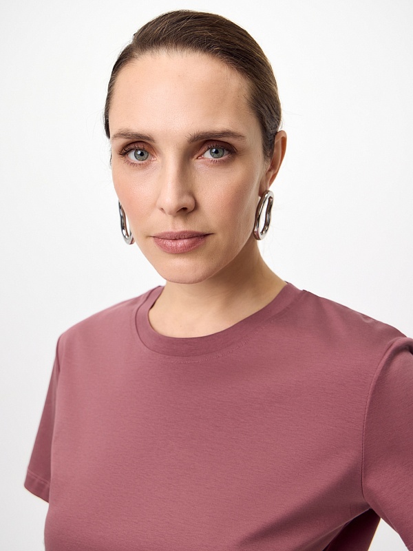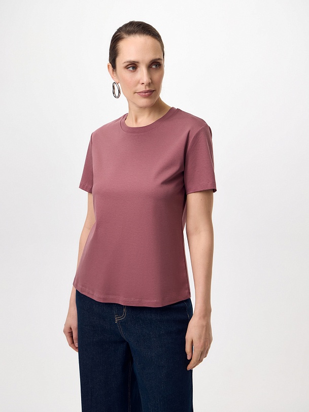 Футболка прямого силуэта в помадном оттенке будет прекрасно сочетаться как с джинсовыми изделиями, так и с классическими ансамблями. Мерсеризованный хлопок имеет шелковистый блеск и не деформируется после стирок, практически не мнется и не выцветает со временем. Благодаря мерсеризации данная футболка имеет: - повышенную прочность и гигроскопичность - особенный блеск и гладкость - однородность волокон нити и высокое качество ткани.