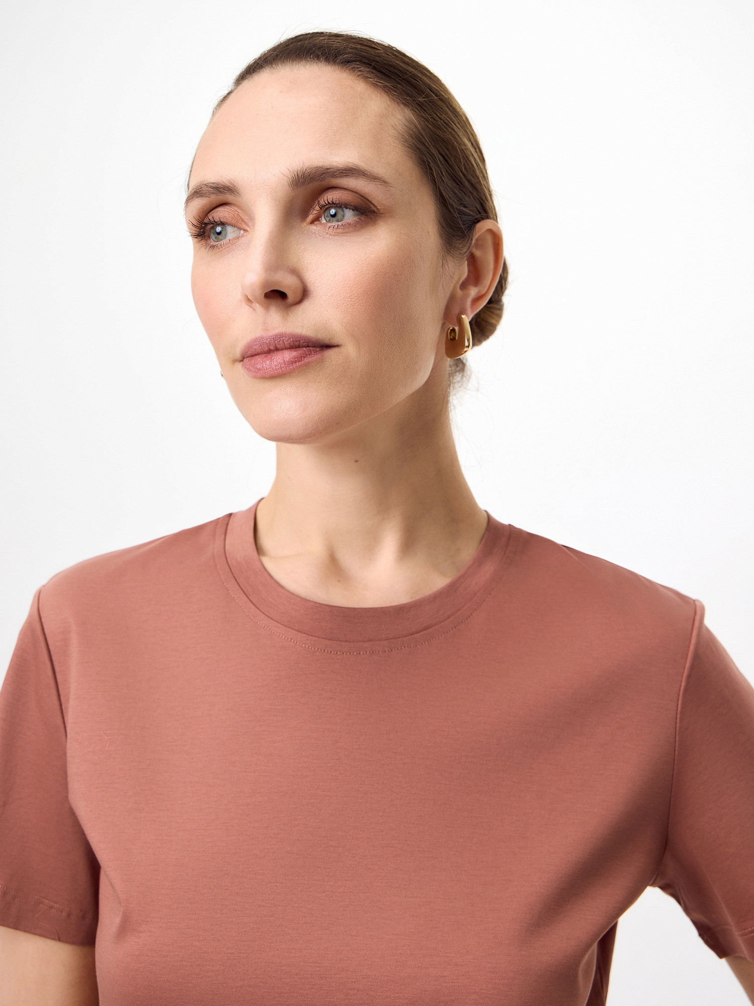Футболка прямого силуэта в бронзовом цвете будет прекрасно сочетаться как с джинсовыми изделиями, так и с классическими ансамблями. Мерсеризованный хлопок имеет шелковистый блеск и не деформируется после стирок, практически не мнется и не выцветает со временем. Благодаря мерсеризации данная футболка имеет: - повышенную прочность и гигроскопичность - особенный блеск и гладкость - однородность волокон нити и высокое качество ткани.