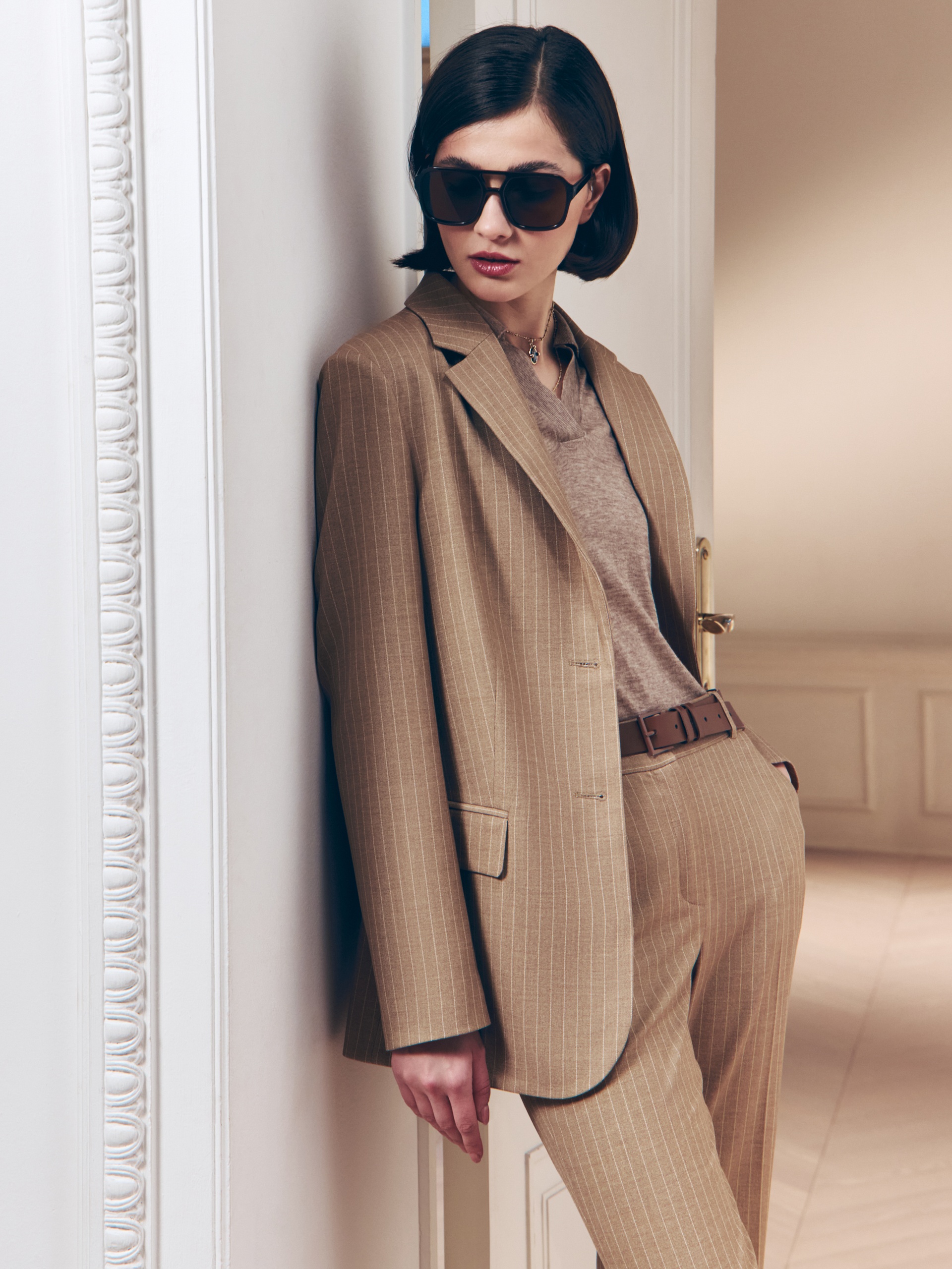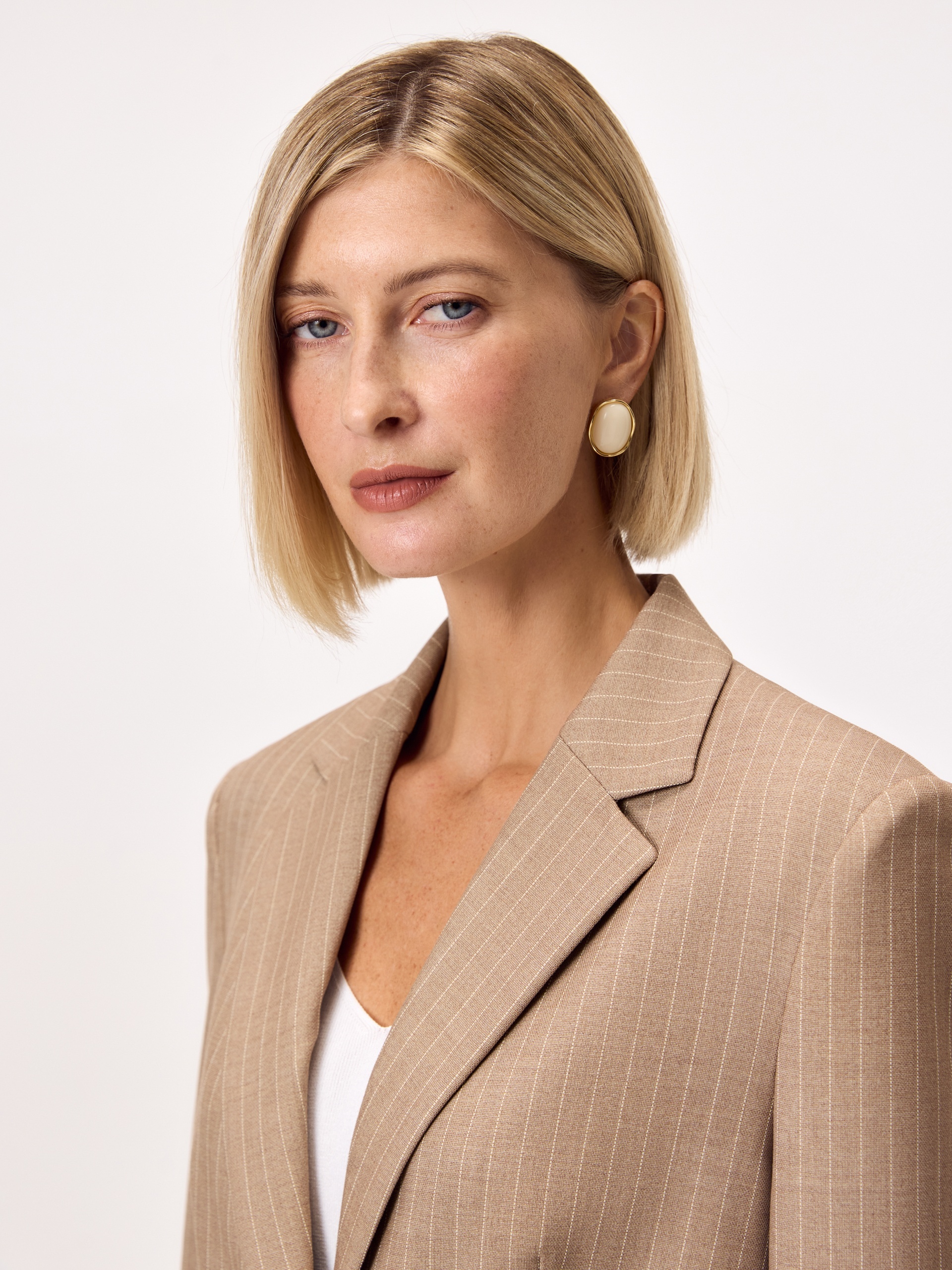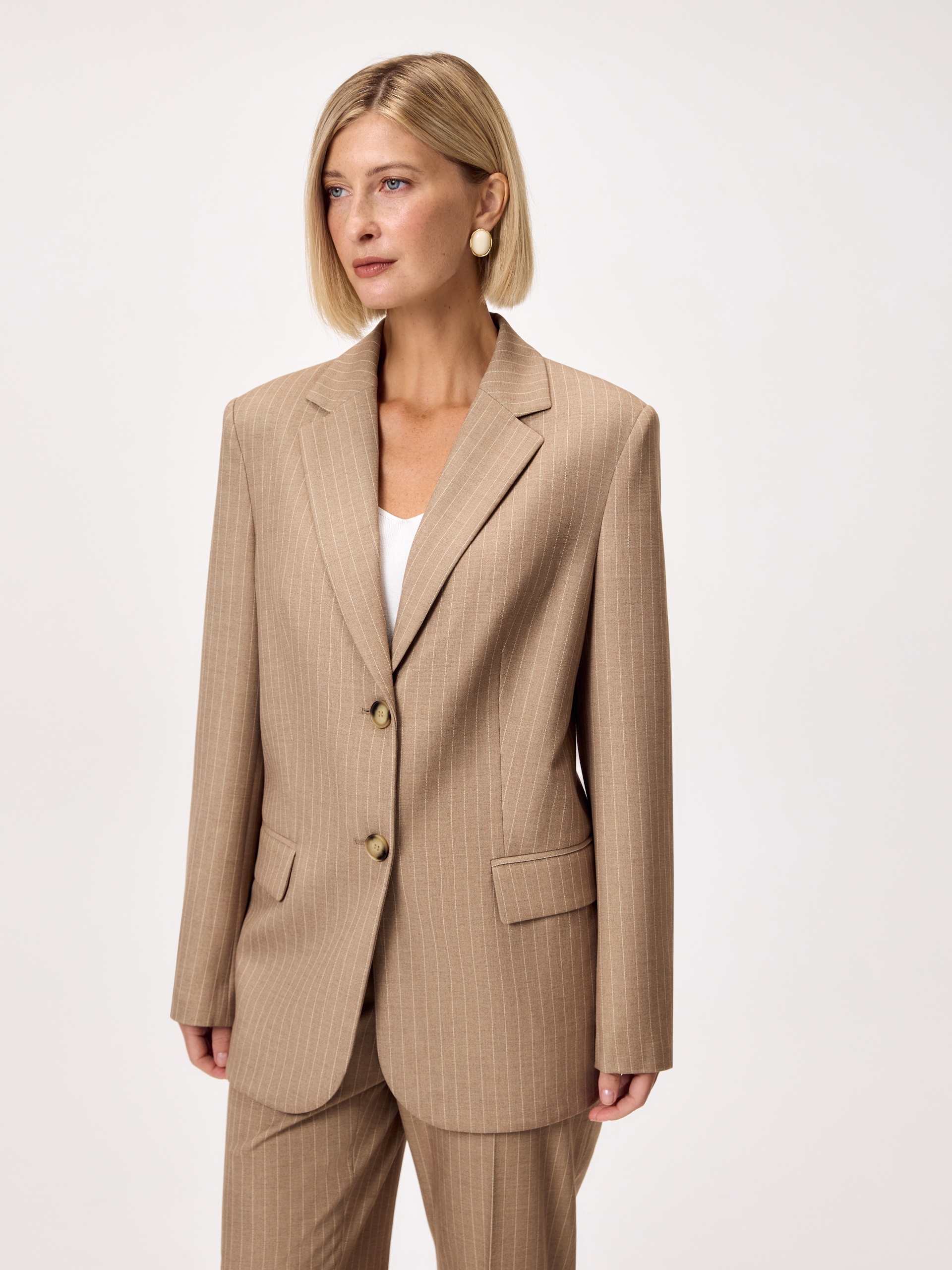 Прямой удлиненный однобортный жакет на двух пуговицах из костюмной вискозной ткани в благородном бежевом цвете с тонкой редкой молочной полоской. Жакет с четкой линией плеча, классическим воротником с лацканами, рукав втачной со шлицей и пуговицами. На полочке прорезные карманы с клапанами. Жакет полностью на подкладке. Составит идеальную пару с жилетом и брюками из одной ткани.