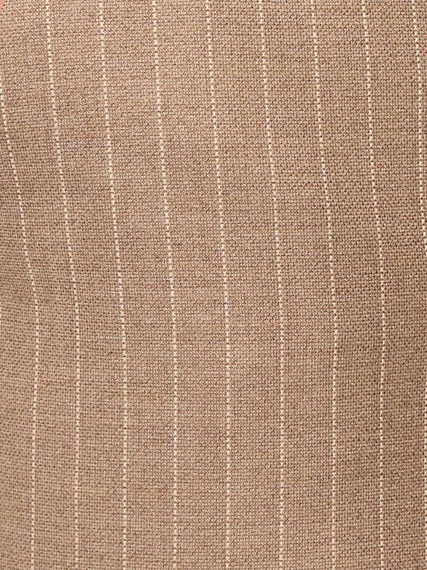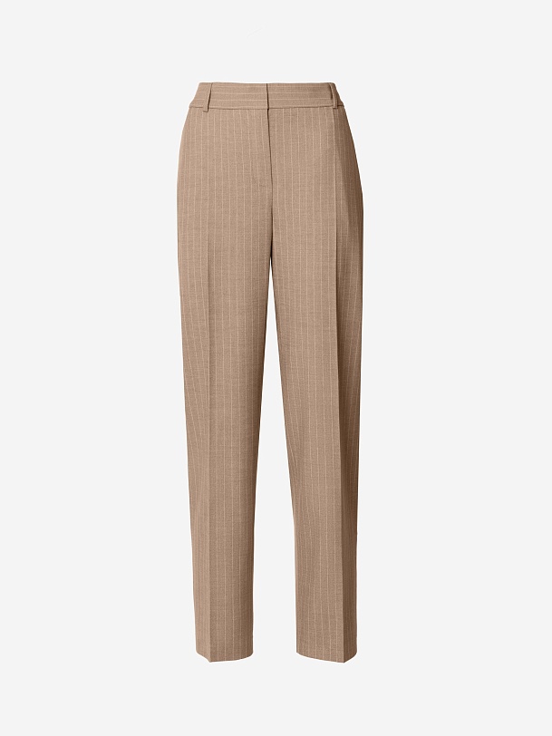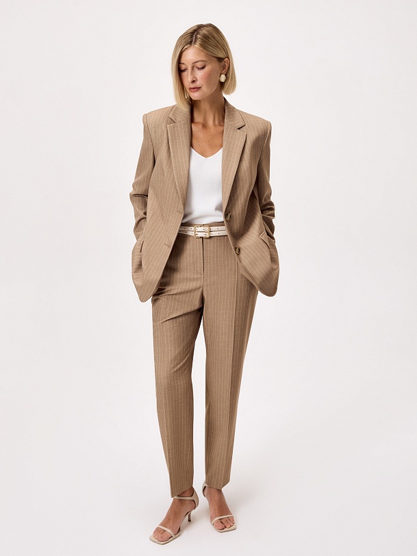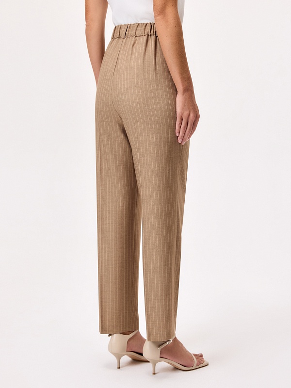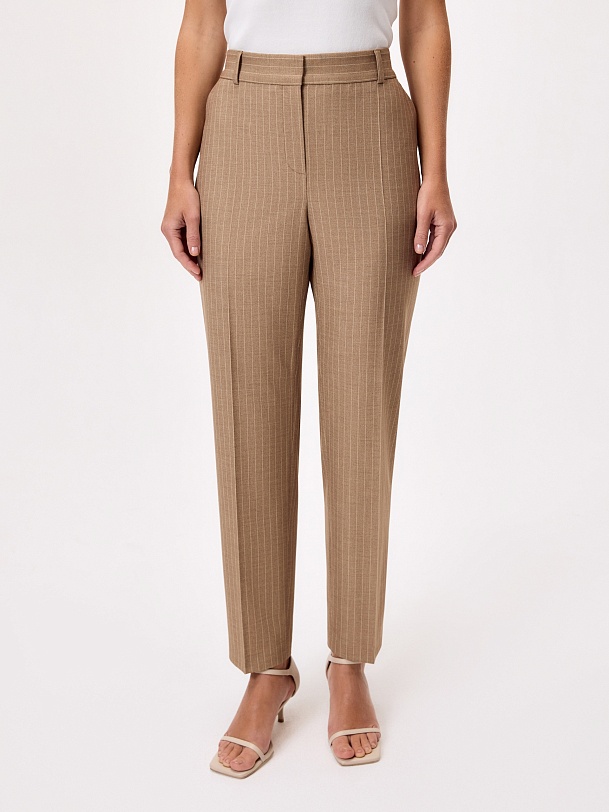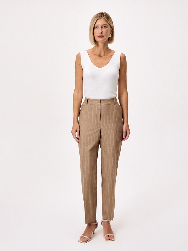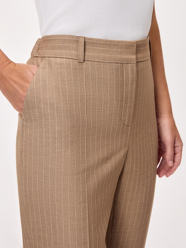 Укороченные зауженные брюки на средней посадке со стрелками из костюмной вискозной ткани в благородном бежевом цвете с тонкой редкой молочной полоской. Имеют два функциональных кармана по бокам и резинку на спинке в поясе для комфортной посадки. Классическая застежка на молнию, крючок и пуговицу.