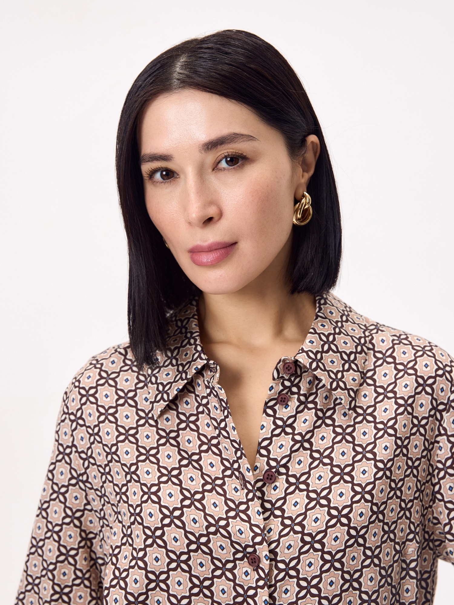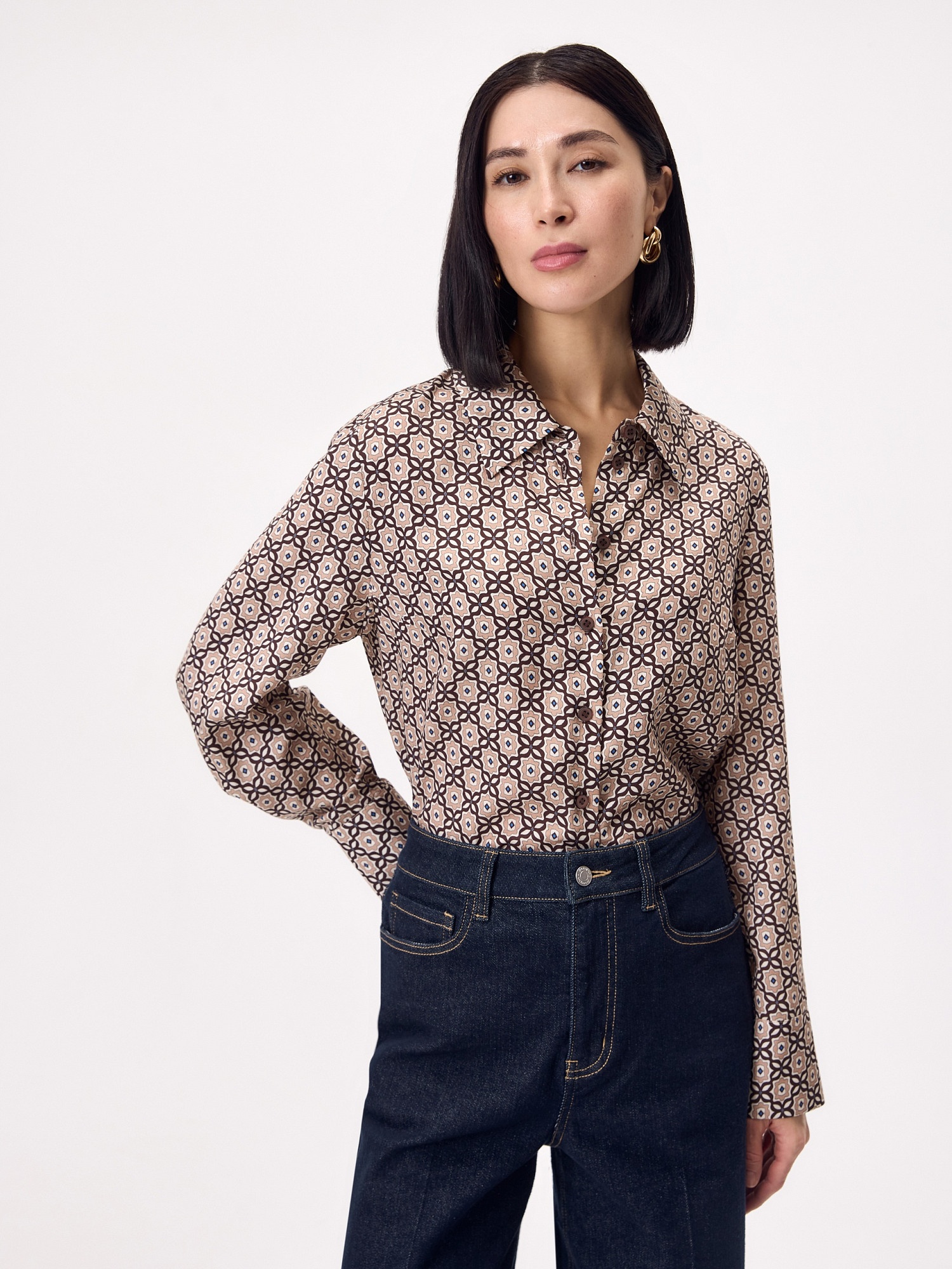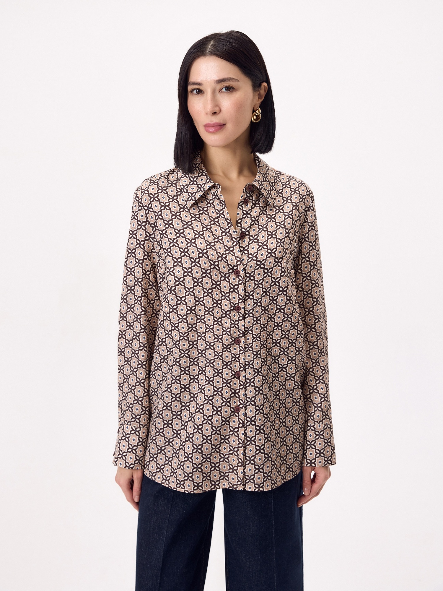 Свободная блуза из натуральной ткани из 100% тенселя с галстучным принтом, с классическим отложным воротником, с застежкой на пуговицы. Рукав втачной. На классическом манжете. На спинке складка от кокетки для комфортной посадки. Низ рубашки фигурной формы.