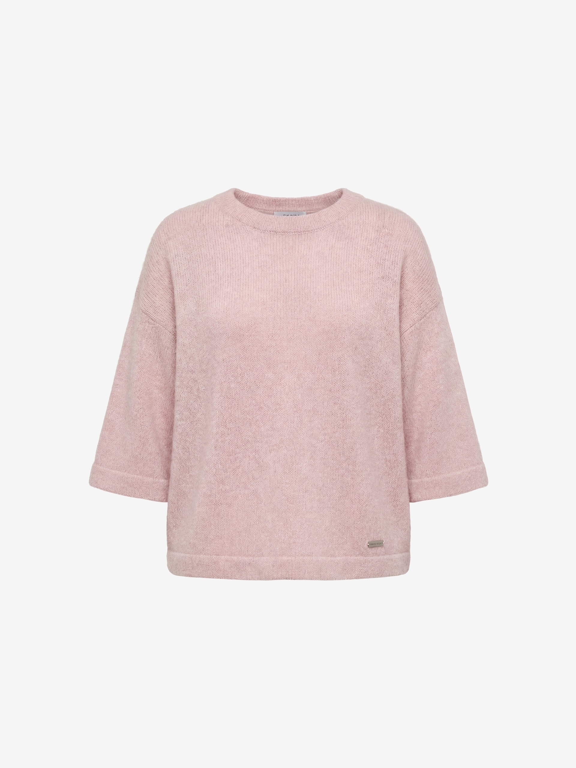 Объемный джемпер нежно розового цвета с укороченным рукавом и круглой горловиной. Джемпер связан из нити вискозы и шерсти ангоры.