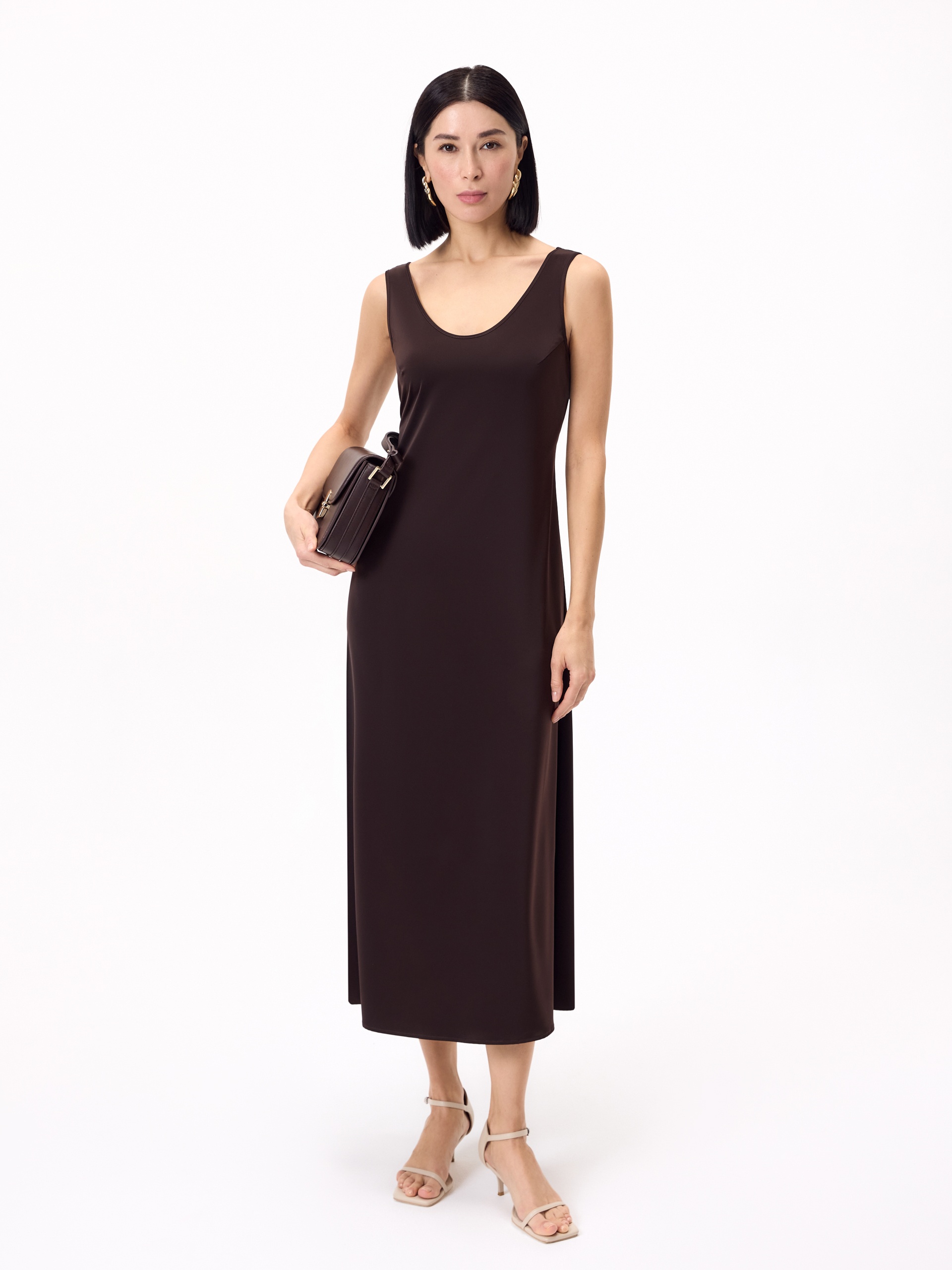 Длинное платье полуприлегающего силуэта из атласной ткани в благородном шоколадном цвете.