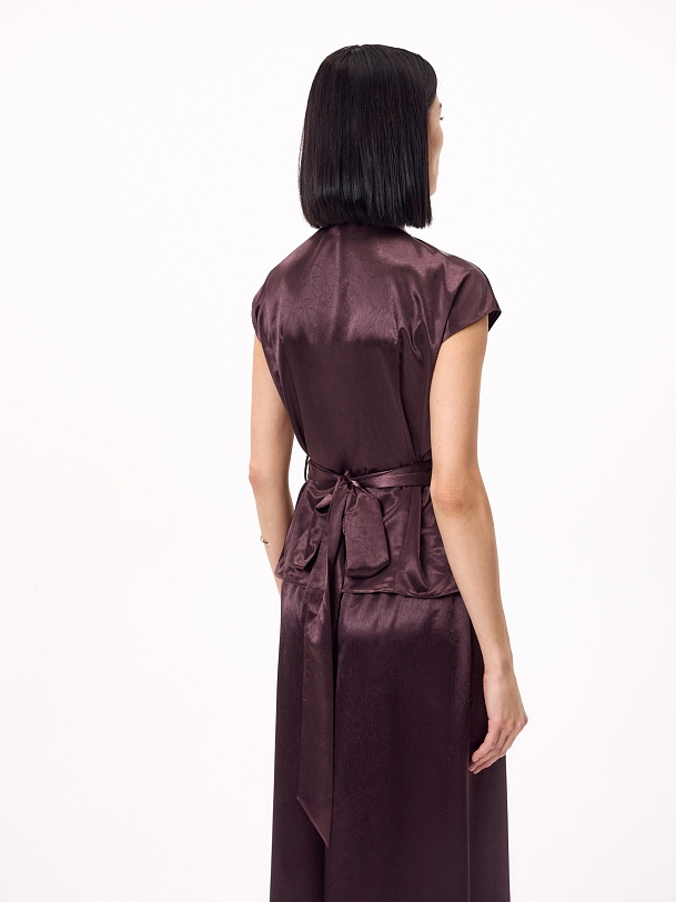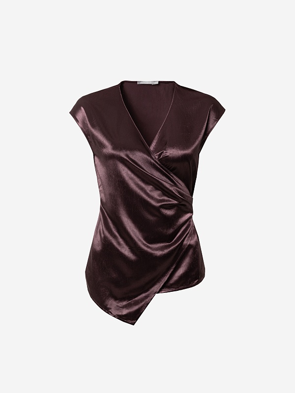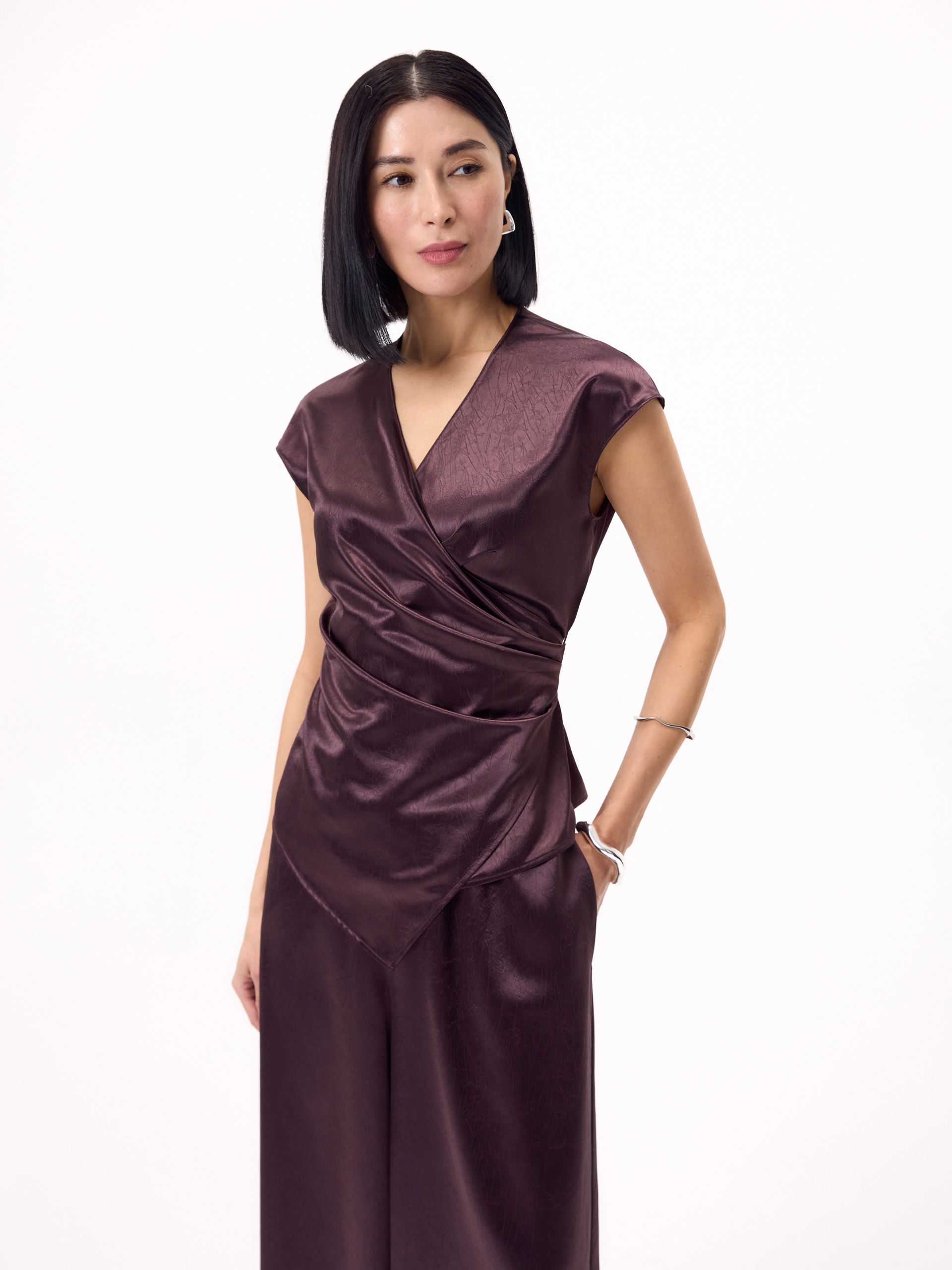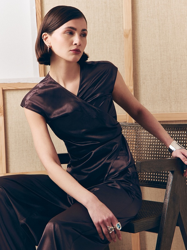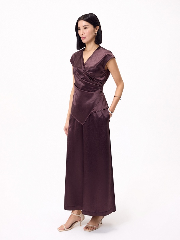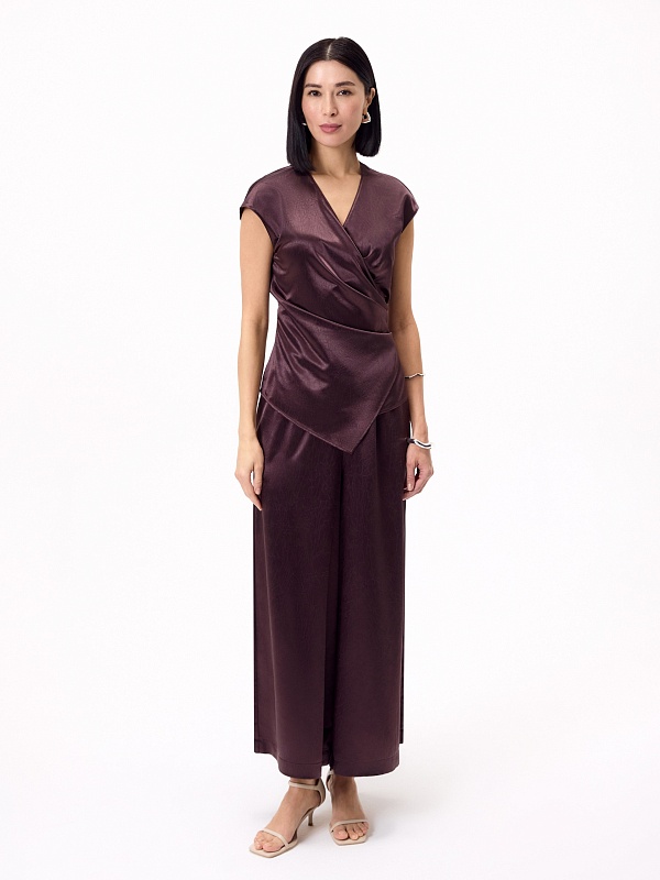 Блуза прилегающего силуэта на запах со складками, V-образной горловиной и немного спущенной линией плеча. Выполнена блуза из жатой атласной ткани в трендовом цвете итальянская слива, составит идеальный образ с брюками на резинке из одной ткани.
