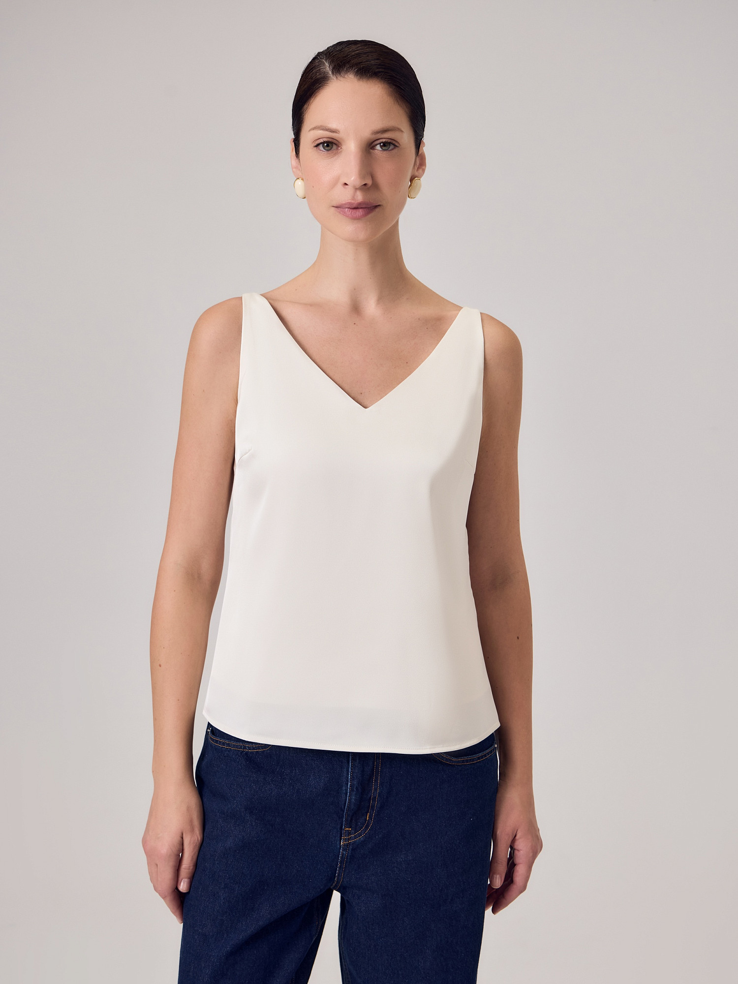 Прямой топ из атласной ткани молочного цвета на тонких лямках с V-образным вырезом, по низу есть небольшие разрезы на боковых швах.