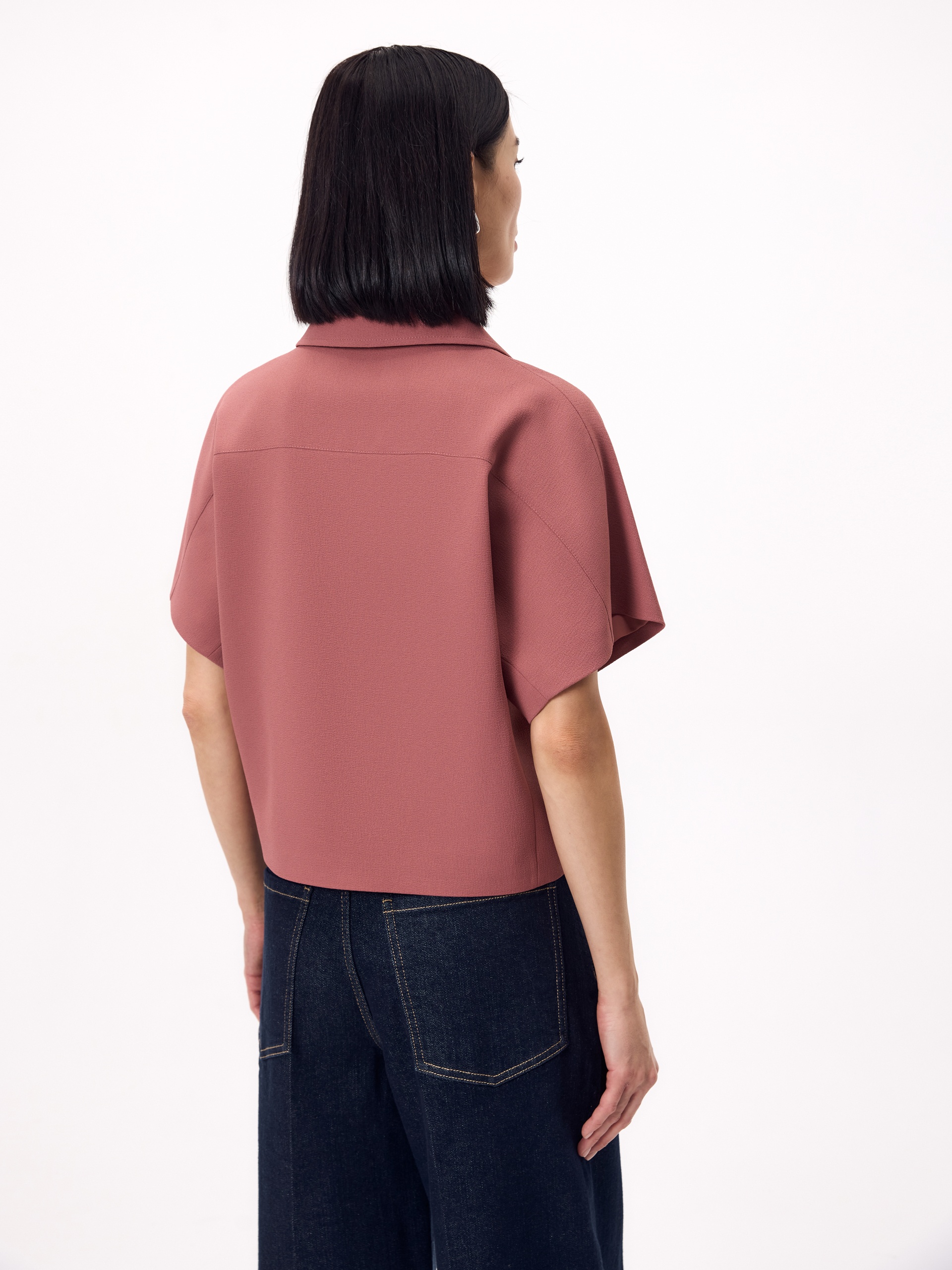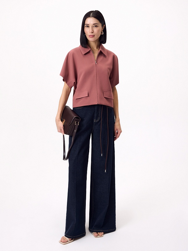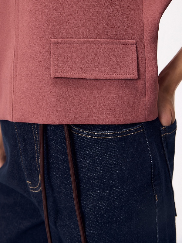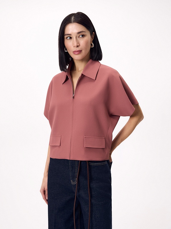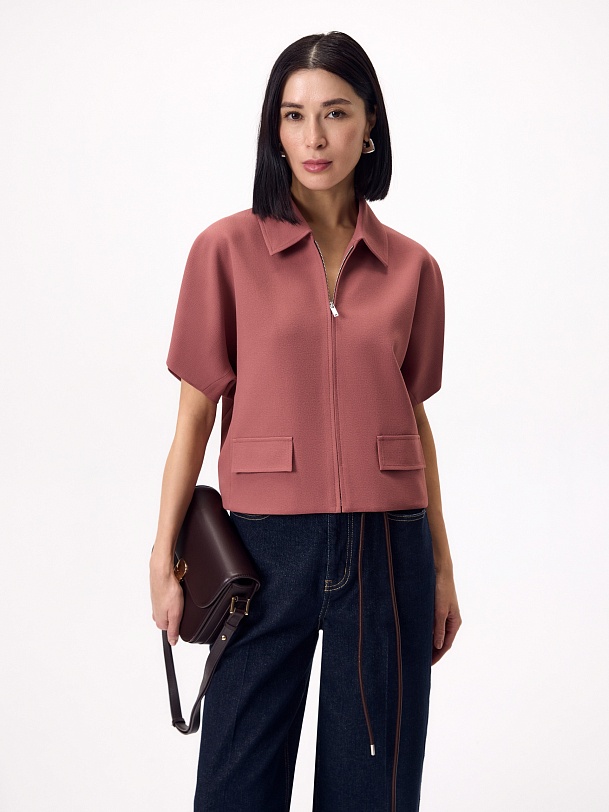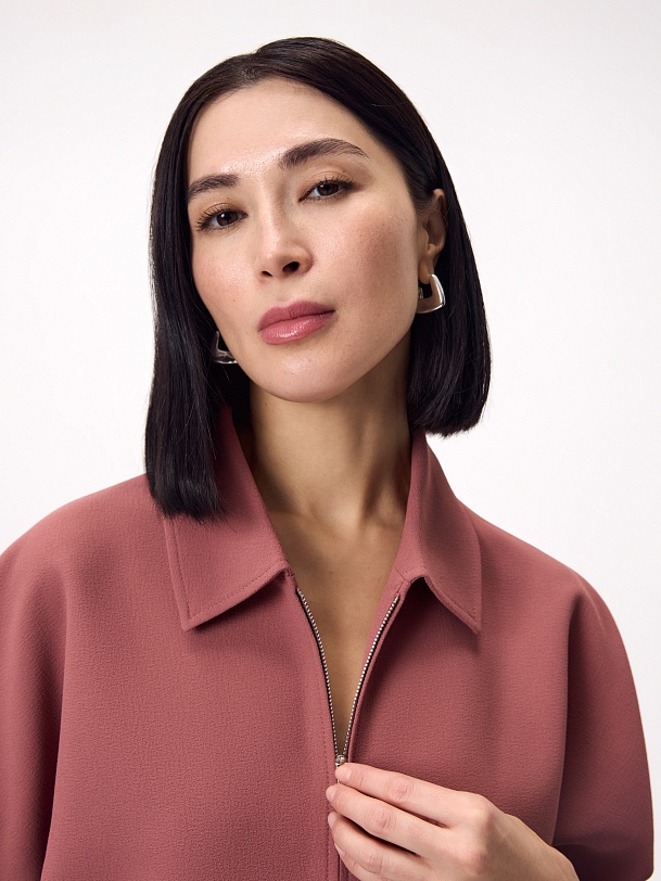 Прямой укороченный жакет на молнии с отложным воротником, на подкладке, с укороченным цельнокроеным рукавом и клапанами на переде. Жакет выполнен из креповой ткани с добавлением вискозы в пыльно-розовом цвете.